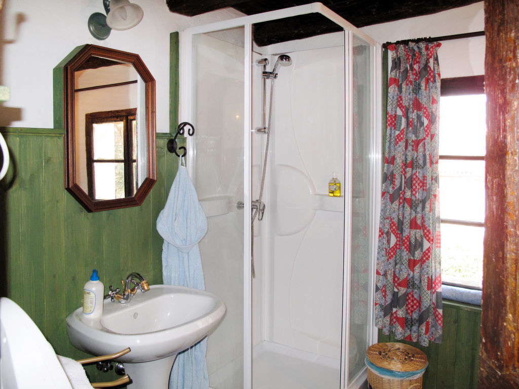 2-Zimmer-Wohnung, 2 Etagen, ca. 68 m². Erdgeschoss: Eingang mit Sitzcouch, offen zur Wohnküche (4 Flammen, Backofen, Holzofen, Geschirrspüler, Kühlschrank, Wasserkocher, Toaster) mit Essplatz. Treppe vom Eingangsbereich ins Obergeschoss (zur Treppe hin offen): Doppelzimmer. Dusche/WC.