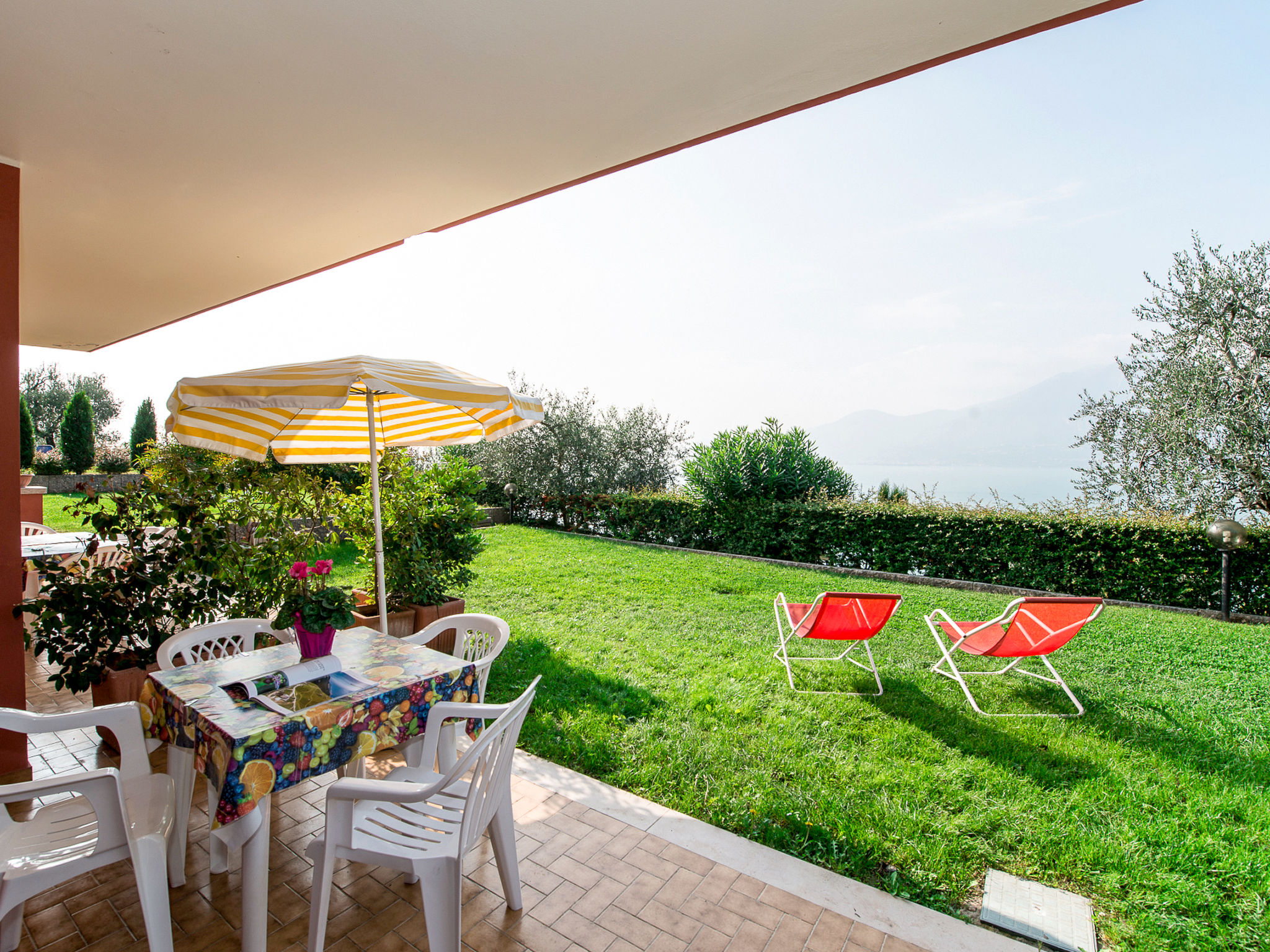 "Gianni (TDB110)", 2-Zimmer-Wohnung 25 m2, im Erdgeschoss. Zweckmässig eingerichtet: Wohn-/Schlafzimmer mit 1 Doppeldiwanbett, Esstisch und Sat-TV. Ausgang zum Garten. 1 Doppelzimmer. Offene Küche (2 Kochplatten, Toaster, Mikrowelle, Tiefkühler, elektrische Kaffeemaschine). Dusche/Bidet/WC. Klimaanlage (extra). Keine Heizmöglichkeit. Terrasse 7 m2 teilweise überdacht, kleiner Garten. Terrassenmöbel. Herrliche Sicht auf den See. Zur Verfügung: Safe, Kinderhochstuhl, Babybett bis 2 Jahre. Internet (Wireless LAN, gratis). Parkplatz (1 Auto). Bitte beachten: Nichtraucher-Unterkunft. Eigener Eingang.