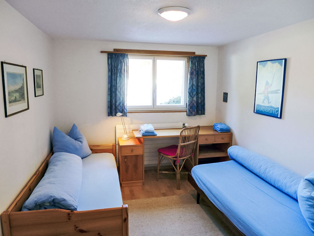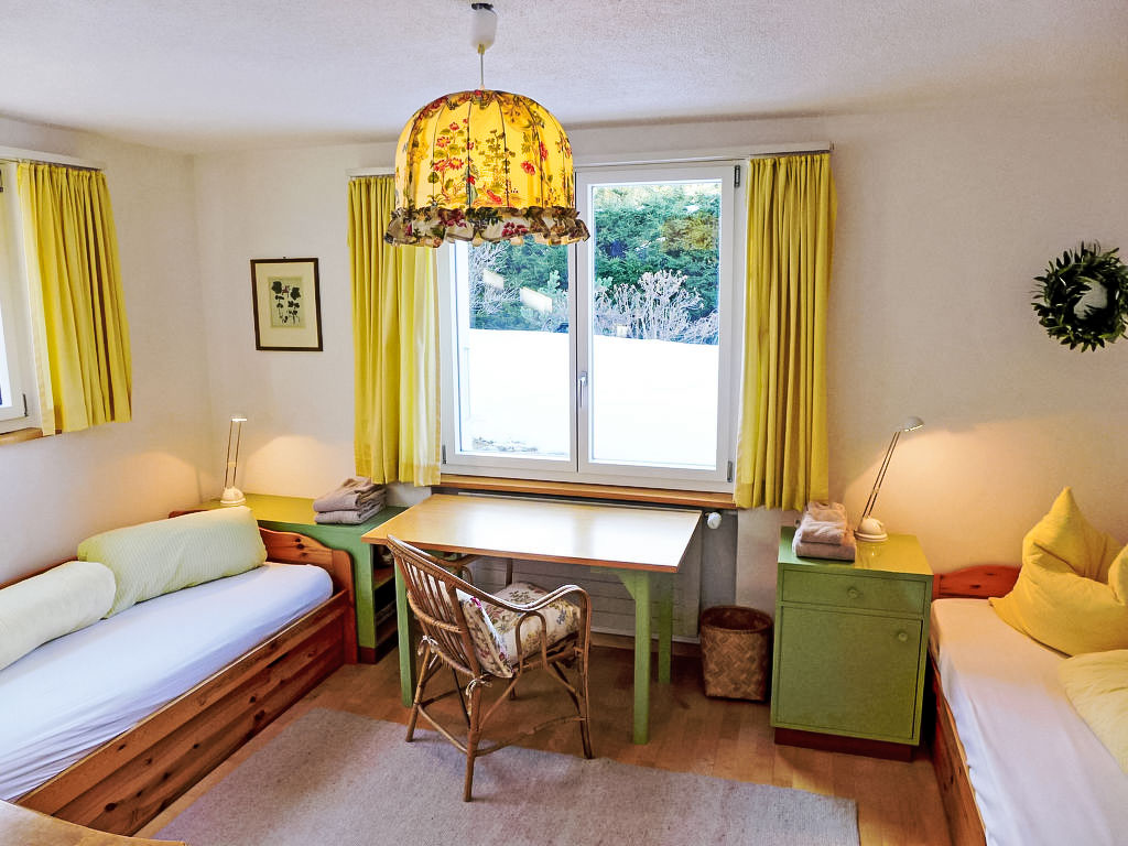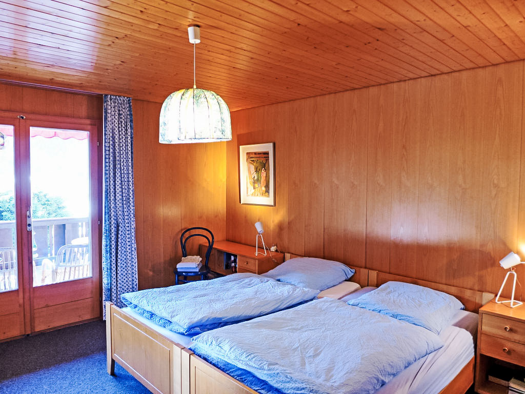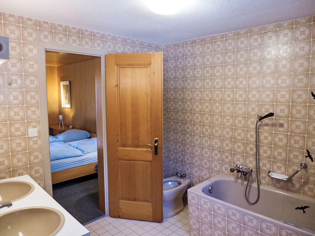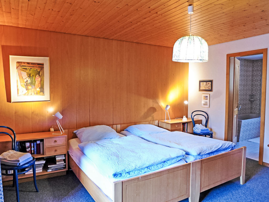 4-Zimmer-Chalet 120 m2 auf 2 Stockwerken, Südwestlage. Geräumig und hell, sehr komfortabel und geschmackvoll eingerichtet: grosses Wohn-/Esszimmer mit Panoramafenster mit offenem Kamin, Essecke, Sat-TV und Radio. Ausgang zum Balkon. 1 grosses Zimmer mit 1 Doppelbett (2 x 90 cm, Länge 200 cm), Bad, Bidet und sep. WC. Grosse Küche (Backofen, Geschirrspüler, 4 Glaskeramikherd Platten, Mikrowelle, elektrische Kaffeemaschine, Fondue Set (Käse)) mit Durchreiche. Unteres Geschoss: 2 Zimmer, jedes Zimmer mit 2 Betten (90 cm, Länge 200 cm). Dusche/WC. Grosser Balkon, Südlage. Balkonmöbel. Herrliche Panoramasicht auf die Berge, das Tal und die Ortschaft. Zur Verfügung: Waschmaschine, Babybett bis 3 Jahre. Internet (Wireless LAN, gratis). Bitte beachten: geeignet für Familien. Nichtraucher-Unterkunft.