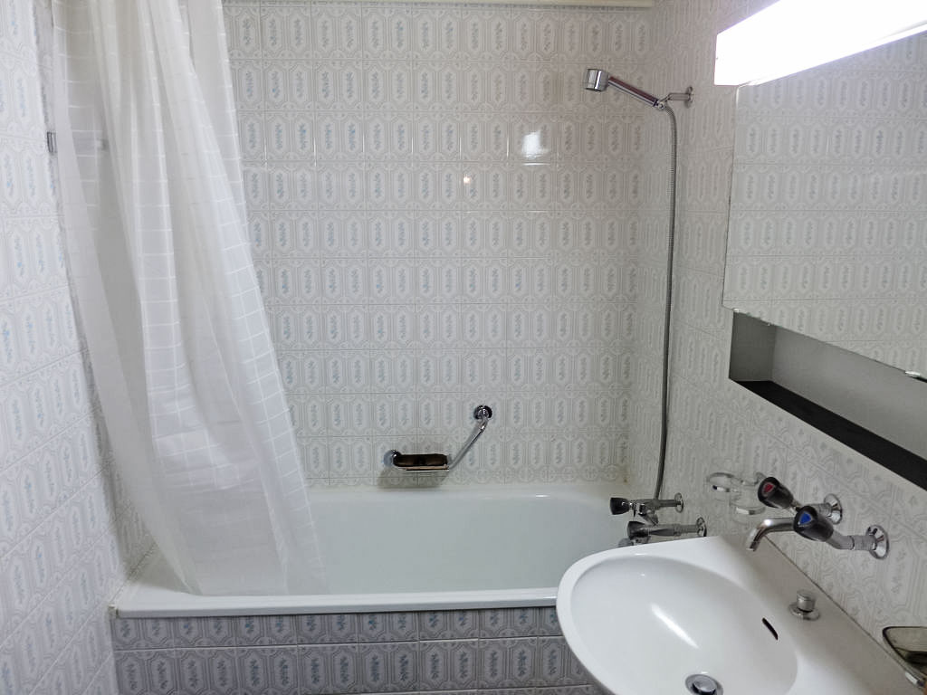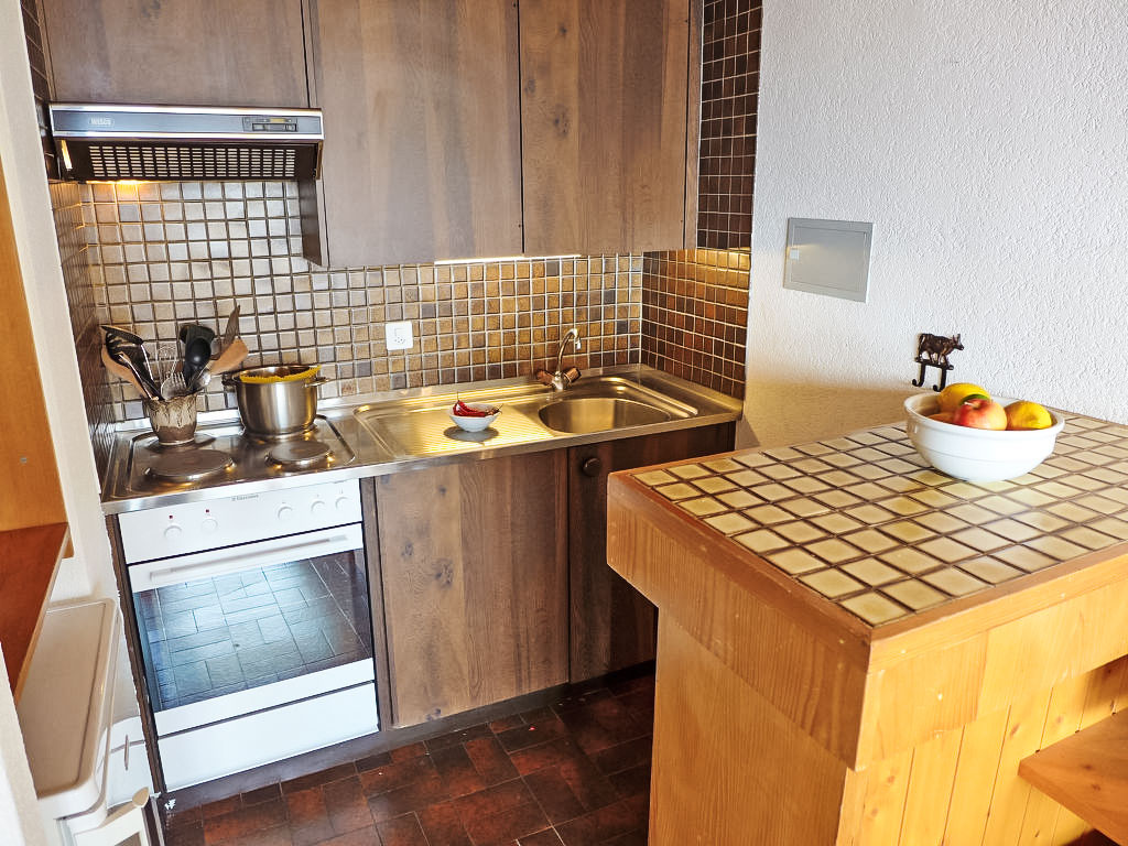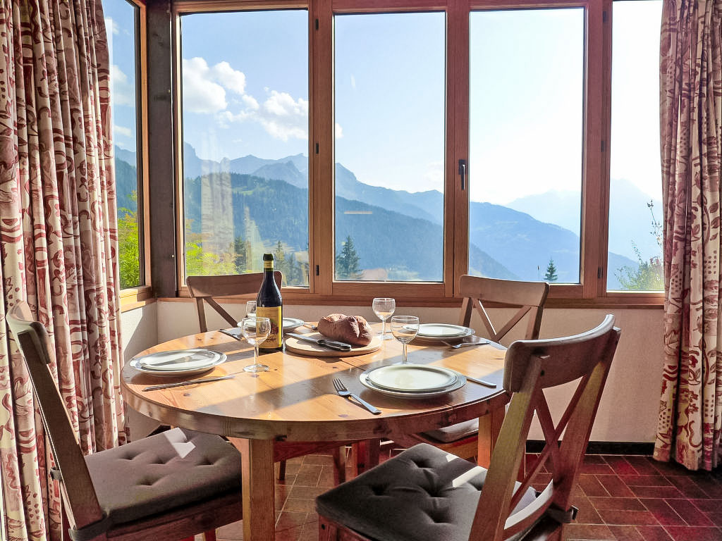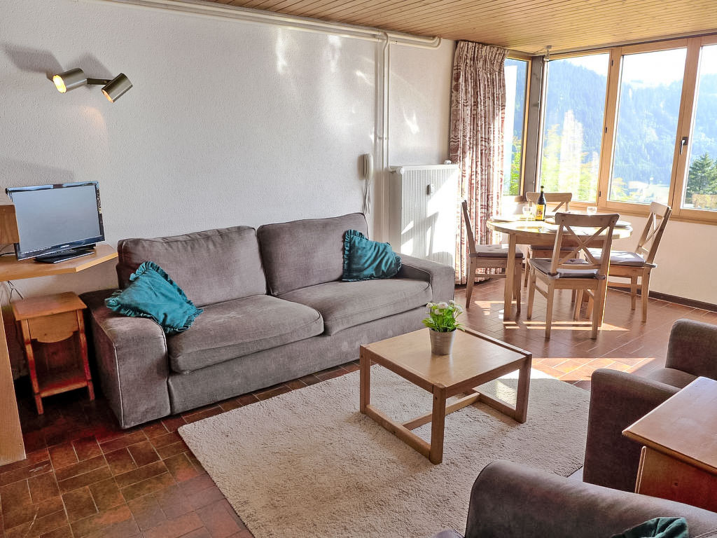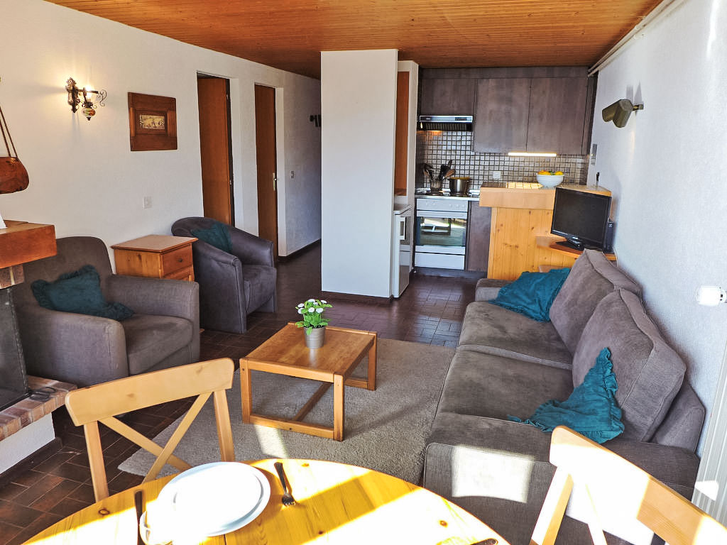 "La Vire D'Aufalle 14 Inférieur", 3-Zimmer-Wohnung 45 m2, im Erdgeschoss. Zweckmässig eingerichtet: Wohn-/Esszimmer mit offenem Kamin und TV (Flachbildschirm), DVD. Ausgang zur Terrasse. 2 Zimmer, jedes Zimmer mit 2 Betten. Kleine, offene Küche (3 Kochplatten, Backofen). Bad/WC. Terrasse, Südlage. Terrassenmöbel. Sicht auf die Berge und die Landschaft. Zur Verfügung: Internet (Wireless LAN, gratis). Parkplatz Nr. 14I (überdacht) in 100 m, Höhe 200 cm, Breite 237 cm.