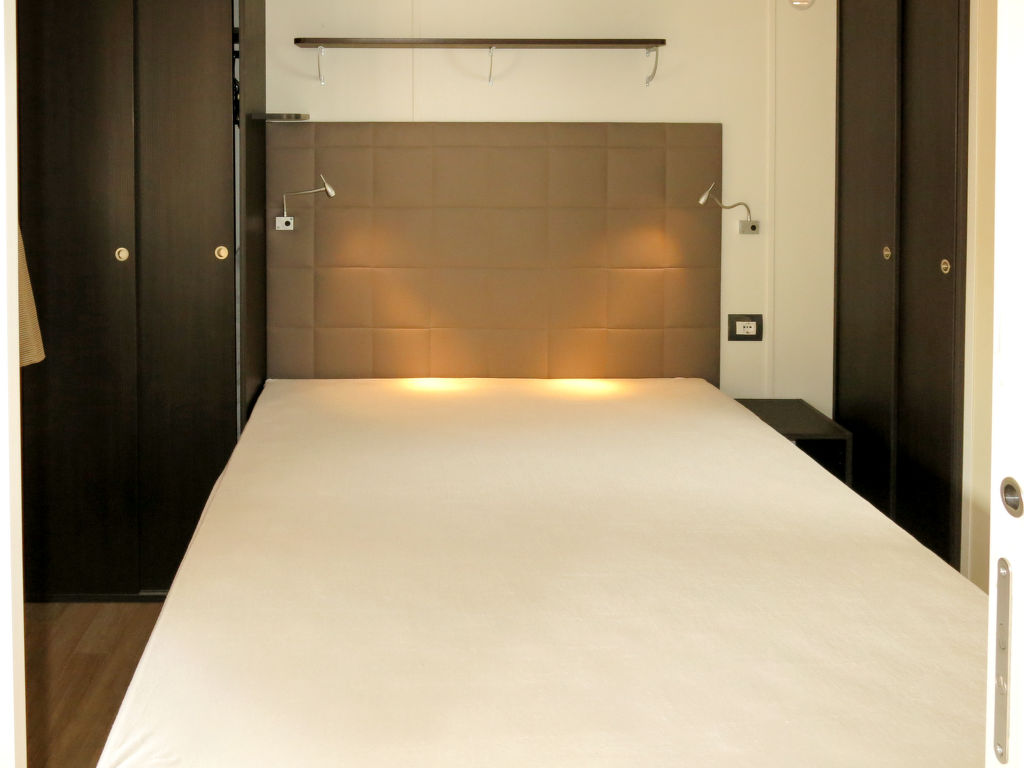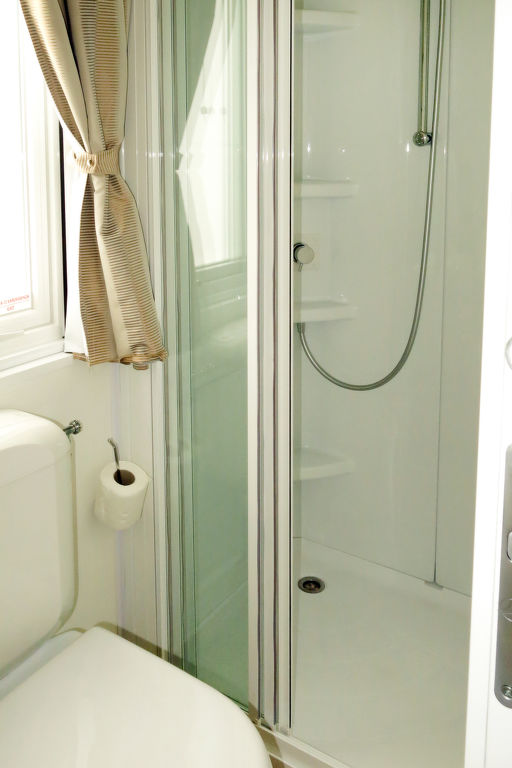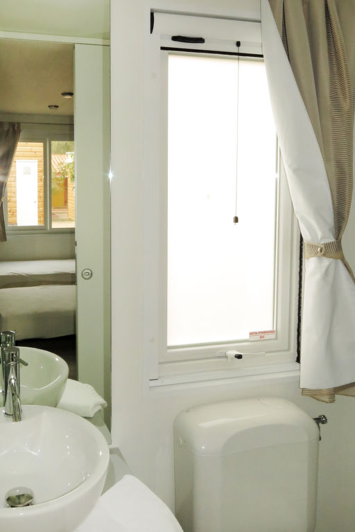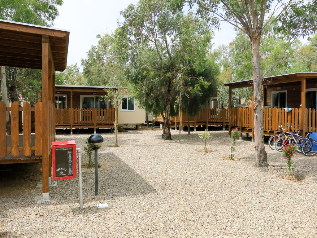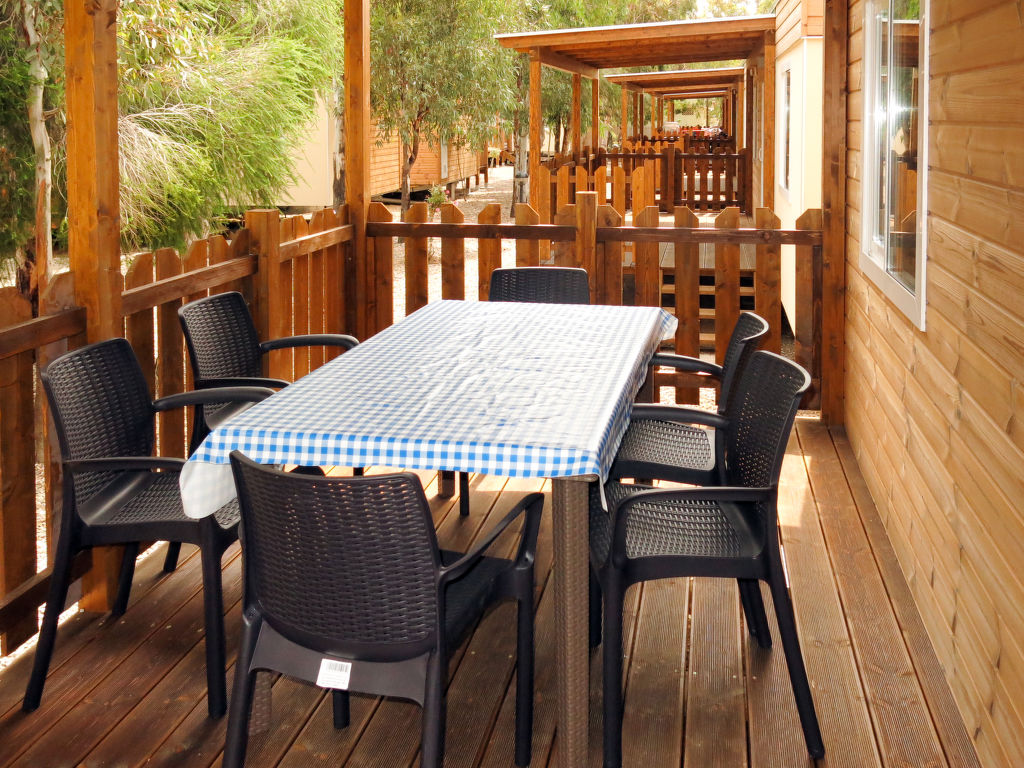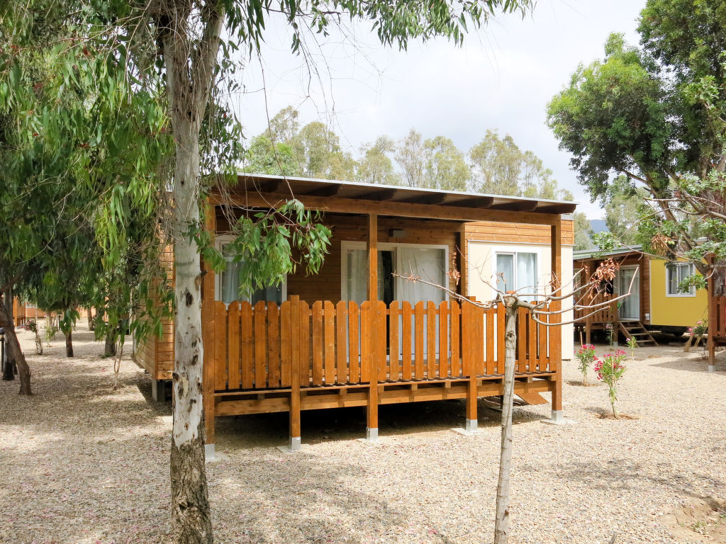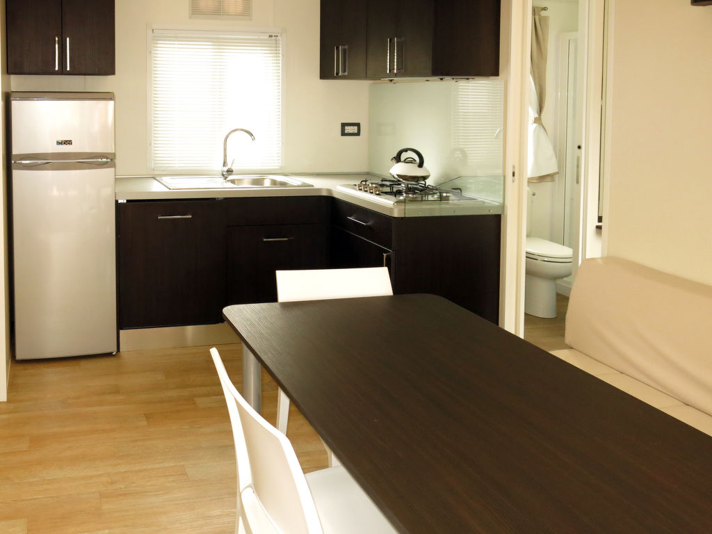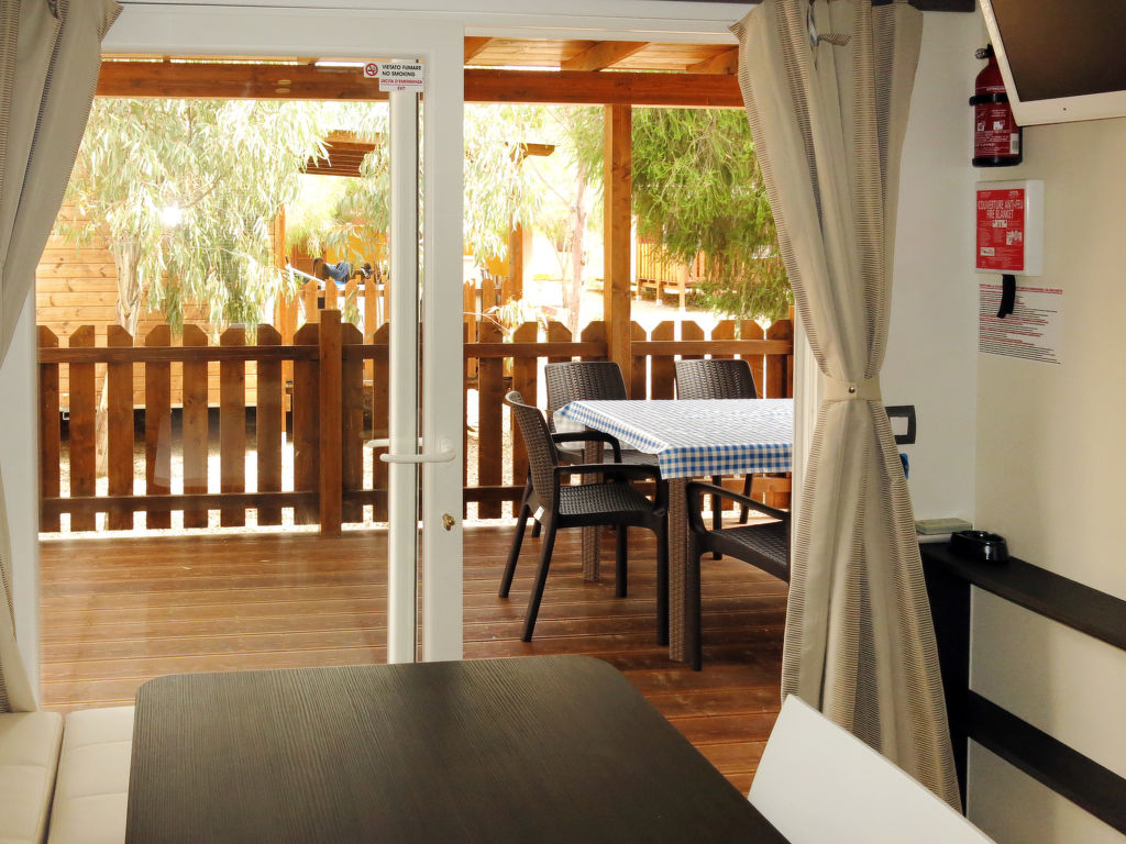 "4 Mori, Elegant (MUV107)", 3-Zimmer-Mobilheim 31 m2. Zweckmässig und modern eingerichtet: Wohn-/Schlafzimmer mit 1 Diwanbett, Esstisch und Sat-TV. 1 Zimmer mit 1 franz. Bett (140 cm), Dusche/WC. 1 Zimmer mit 1 Bett und 1 x 2 Etagenbetten, Dusche/WC. Kochnische (Geschirrspüler, 4 Flammen). E-Heizung, Klimaanlage. Terrasse überdacht. Terrassenmöbel. Zur Verfügung: Kinderhochstuhl, Babybett.