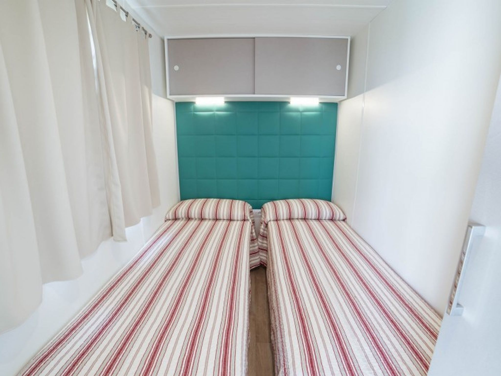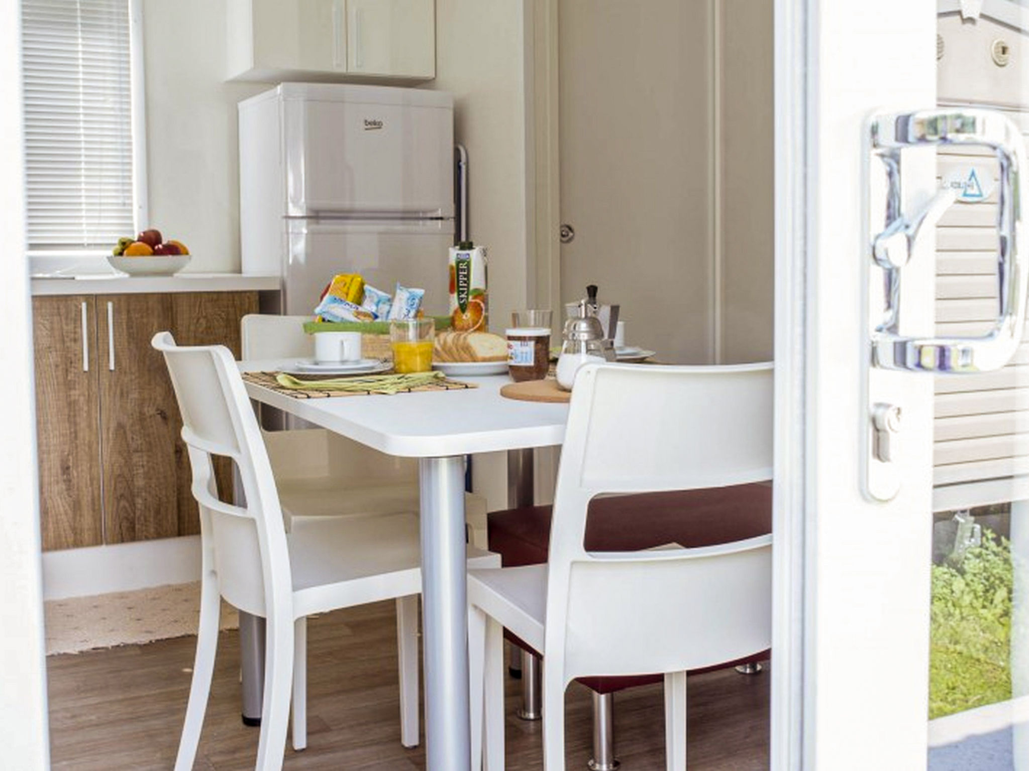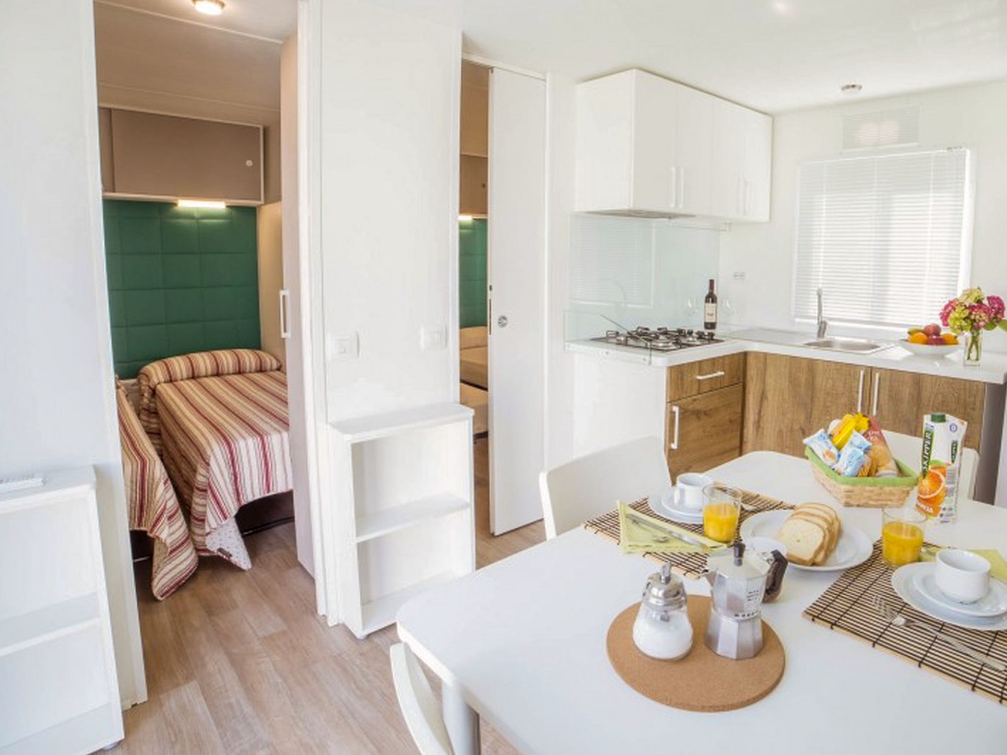 3-Zimmer-Mobilheim 24 m2. Komfortabel eingerichtet: Wohn-/Esszimmer mit Essecke. 1 Zimmer mit 1 franz. Bett (140 cm). 1 Zimmer mit 2 Betten (70 cm). Offene Küche (4 Flammen, Tiefkühler). Dusche/WC. Heizung nicht in allen Räumen. Gartensitzplatz. Terrassenmöbel. Parkplatz (1 Auto). Bitte beachten: Nichtraucher-Unterkunft. Eigener Eingang.