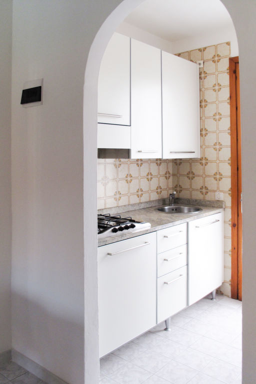 3-Zimmer-Wohnung, Erdgeschoss, ca. 55 m². Flur mit Küchenzeile (4 Flammen, Kaffeemaschine, Mikrowelle, Kühl-/Gefrierkombination), offen zum Wohn-/Schlafraum mit Doppelbettcouch und Essplatz. Von hier durch offenen Rundbogen zu Doppelzimmer. Zweibettzimmer (Betten stehen hintereinander). Dusche/WC.