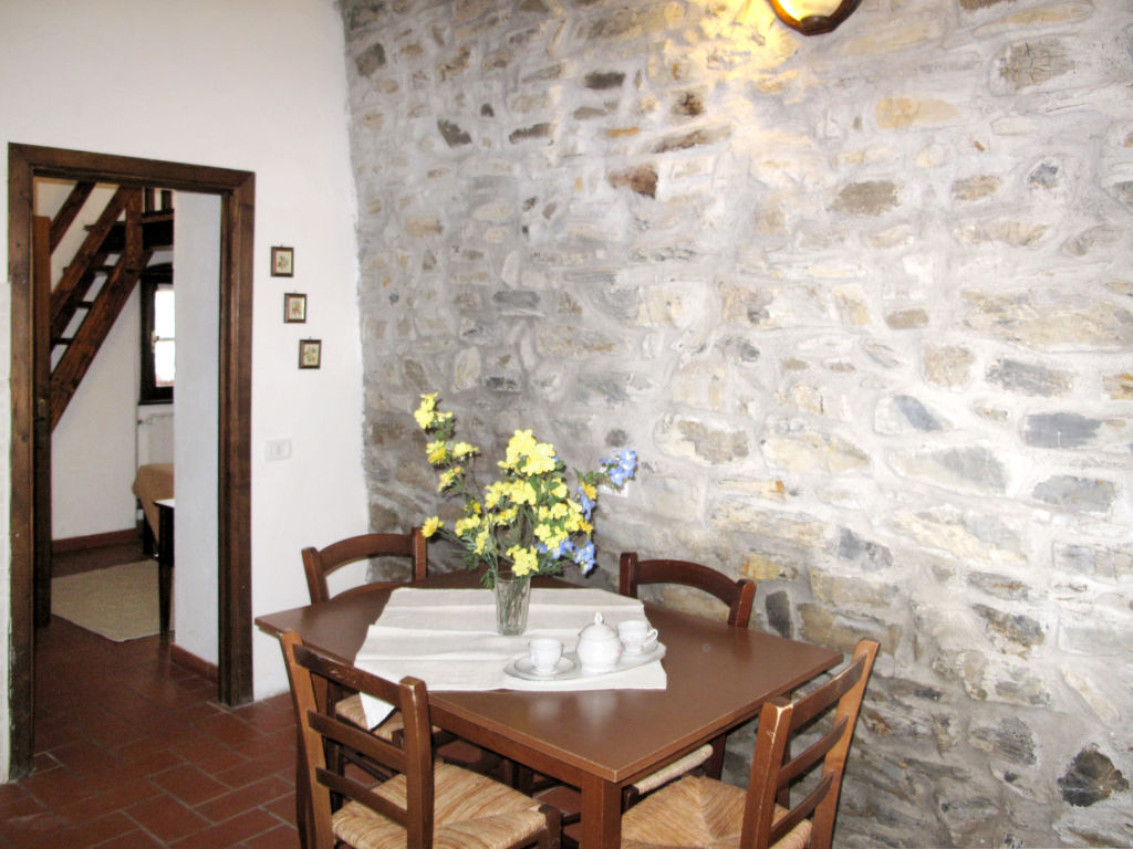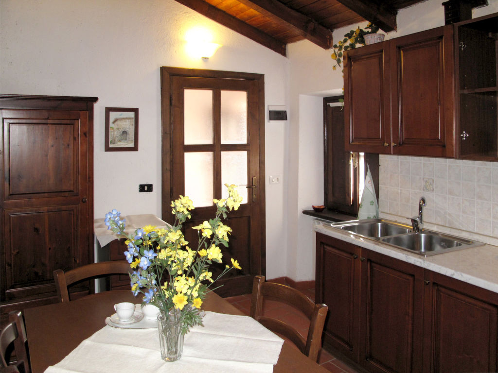 "Il Gradile", 2-Zimmer-Wohnung 30 m2, im erhöhten Erdgeschoss. Rustikal und mit viel Holz eingerichtet: 1 Zimmer, Deckenhöhe 200 cm mit 1 franz. Bett (160 cm). Offene Galerie. Wohnküche (Backofen, Geschirrspüler, 4 Flammen, Toaster, Wasserkocher, Mikrowelle, elektrische Kaffeemaschine) mit Esstisch. Dusche/WC. G-Heizung. Terrassenmöbel. Herrliche Sicht auf die Berge, das Tal und den Wald. Zur Verfügung: Haartrockner. Internet (Wireless LAN, gratis). Parkplatz (1 Auto). Bitte beachten: Nichtraucher-Unterkunft.