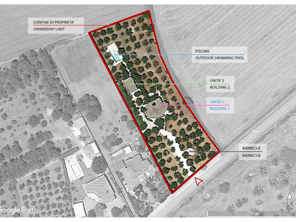 Modernes Haus "Villa Baxta", Baujahr 2018, umgeben von Bäumen, Wiesen und Feldern. Mietobjekt bestehend aus Haupt- und Nebengebäude, im Weiler Vaste, 6.5 km vom Zentrum von Castro, 3 km vom Zentrum von Poggiardo, 15 km vom Zentrum von Maglie, sonnige Lage, 8 km vom Meer. Zur Alleinbenutzung: Grundstück 2'000 m2, Naturgarten, Schwimmbad (10 x 4 m, 250 cm tief, 01.05.-15.10.). Aussendusche, Terrasse, Gartenmöbel, Grill. Im Hause: Dachterrasse, Waschmaschine. Parkplatz (für 5 Autos) auf dem Grundstück. Einkaufsgeschäft 1.5 km, Supermarkt 3 km, Sandstrand "Otranto" 15 km, Felsstrand "Santa Cesarea Terme / Porto Miggiano" 8 km.
