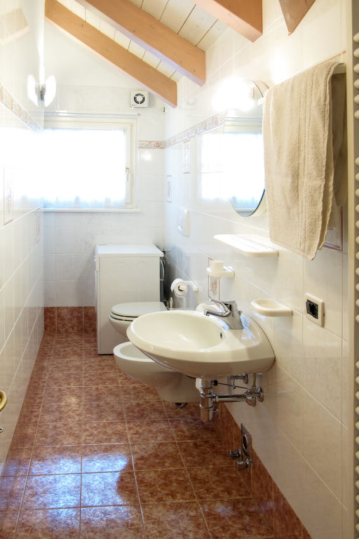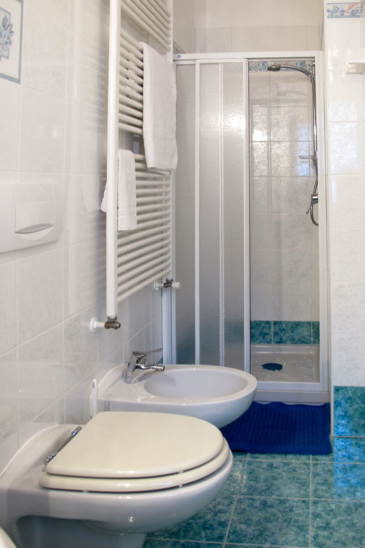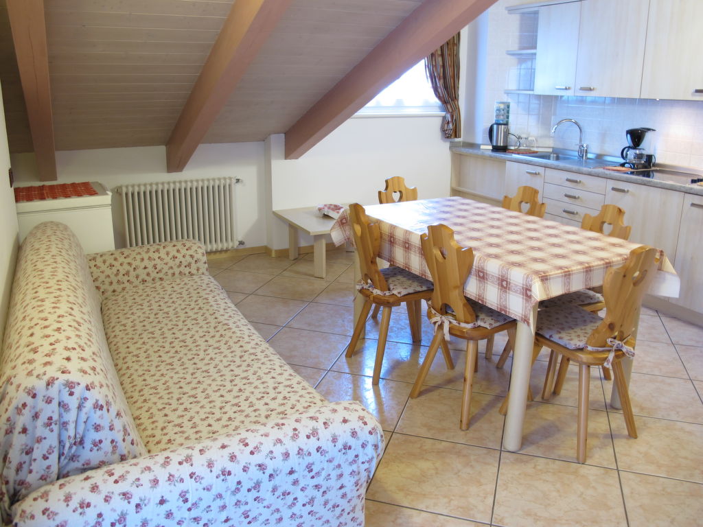 3-Zimmer-Wohnung, 2. Etage (Dachschräge, teils eingeschränkte Stehhöhe), ca. 75 m². Wohn-/Schlafraum mit Doppelbettcouch, Essplatz, Küchenzeile (4 Ceranfelder, Backofen/Mikrowelle, Kühlschrank, Gefrierschrank, Kaffeemaschine, Wasserkocher, Toaster) und Balkonausgang. Schlafzimmer mit franz. Bett (1,60 m breit), Einzelbett (0,80 m breit) und Dusche/WC. Doppelzimmer. Dusche/WC. CIPAT: 022113-AT-052571