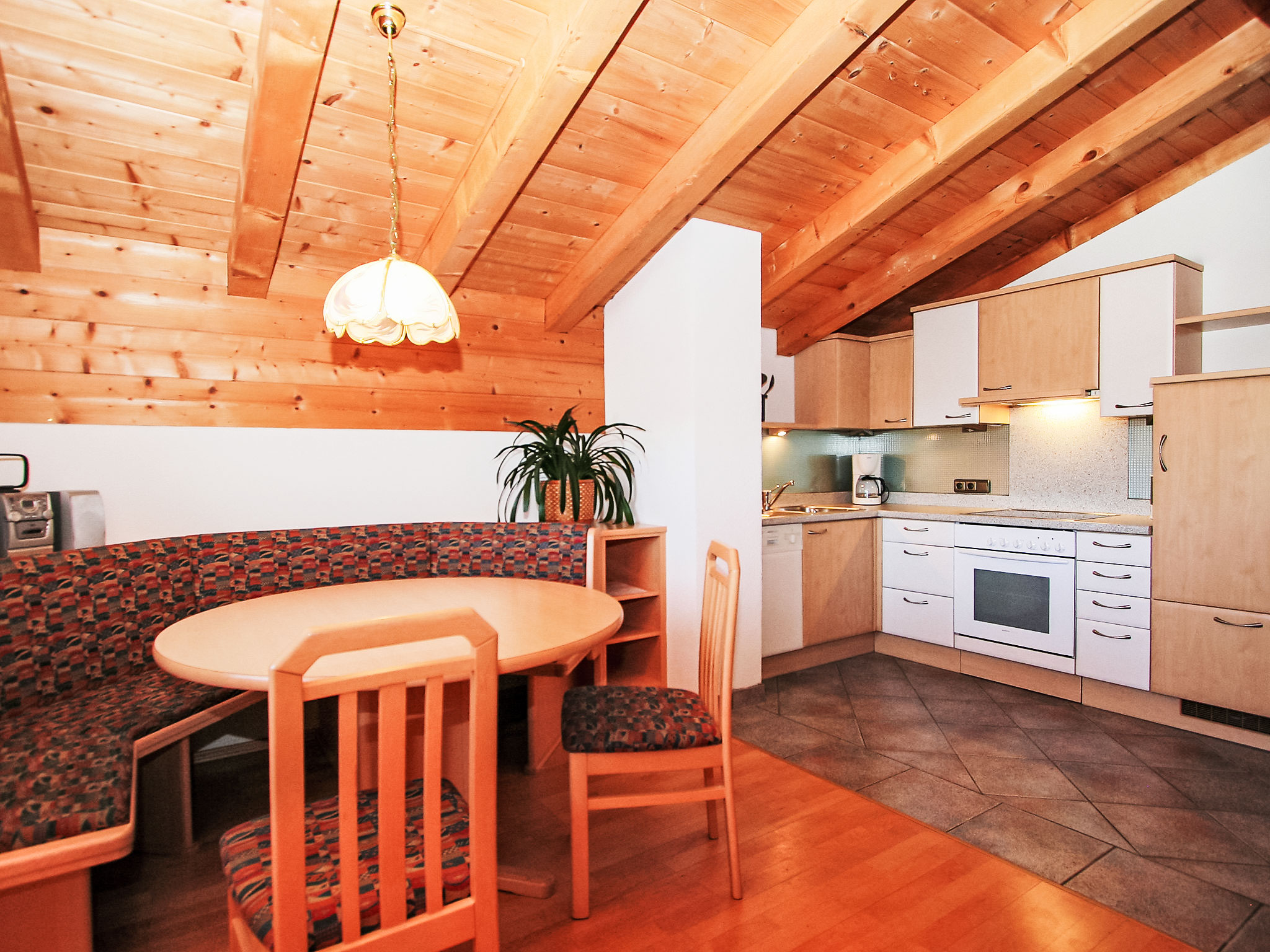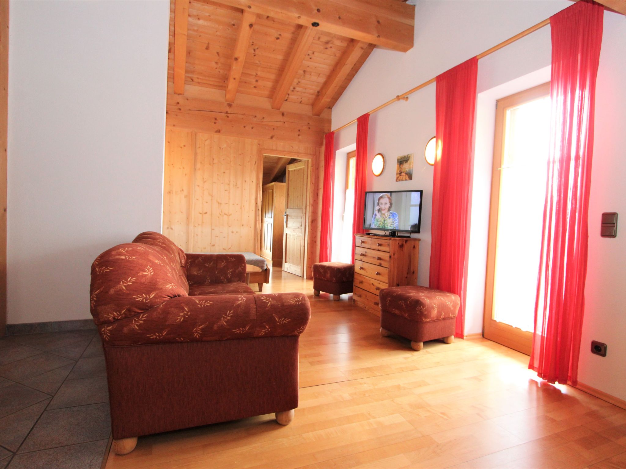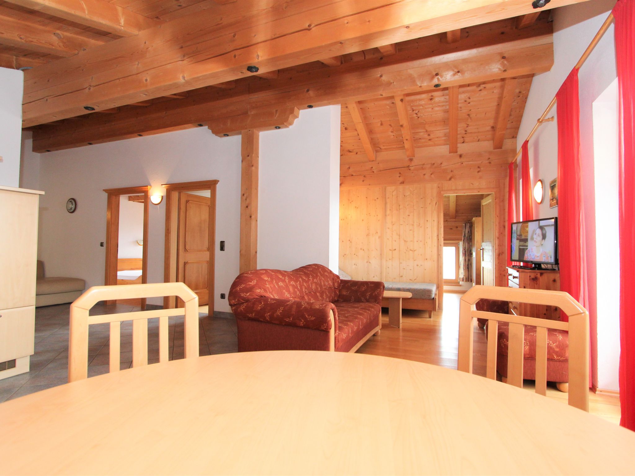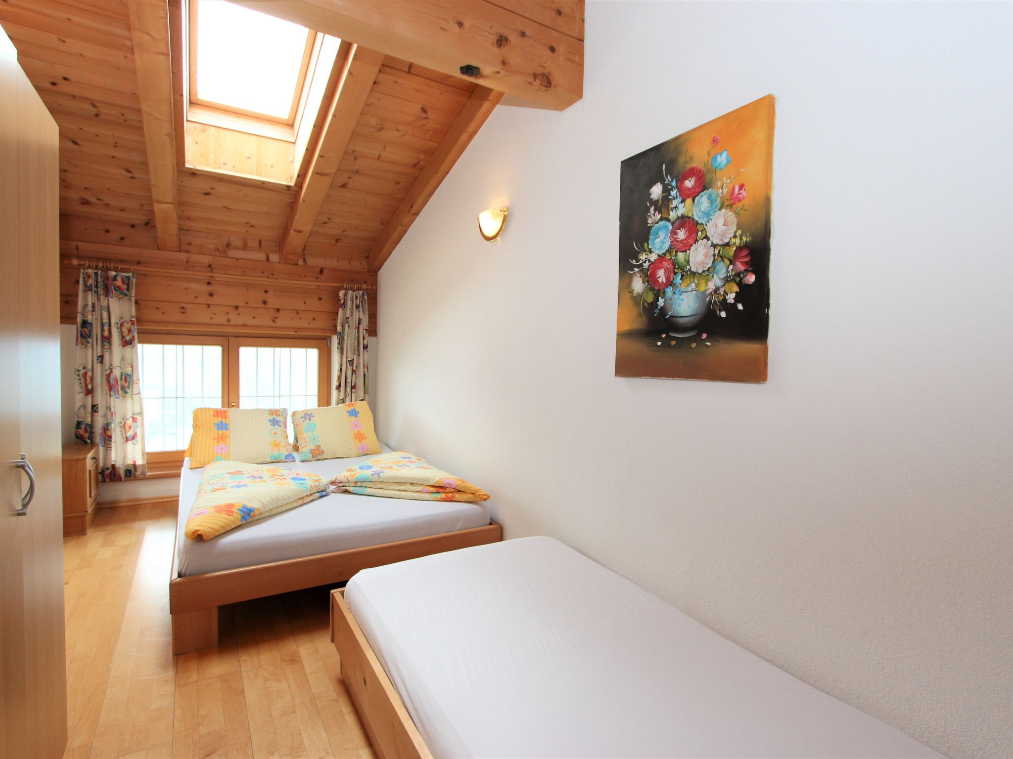 4-Zimmer-Wohnung 86 m2, im Dachgeschoss. Geschmackvoll und gemütlich eingerichtet: Eingang. 1 Zimmer mit 1 Bett und 1 franz. Bett (140 cm). 2 Doppelzimmer. Wohnzimmer mit Sat-TV (Flachbildschirm). Ausgang zum Balkon. Offene Küche (Backofen, Geschirrspüler, 4 Glaskeramikherd Platten) mit Essecke. Ausgang zum Balkon. Bad/WC. Balkon. Herrliche Panoramasicht auf die Berge, das Tal und die Landschaft. Zur Verfügung: Internet (Wireless LAN, extra). Hohe Raumhöhe, Sichtdachstuhl.