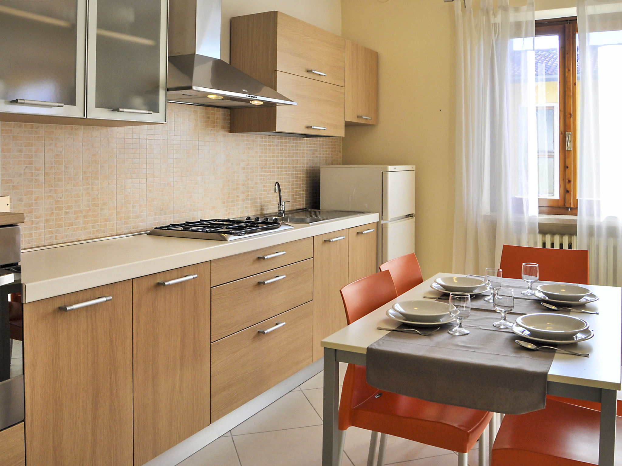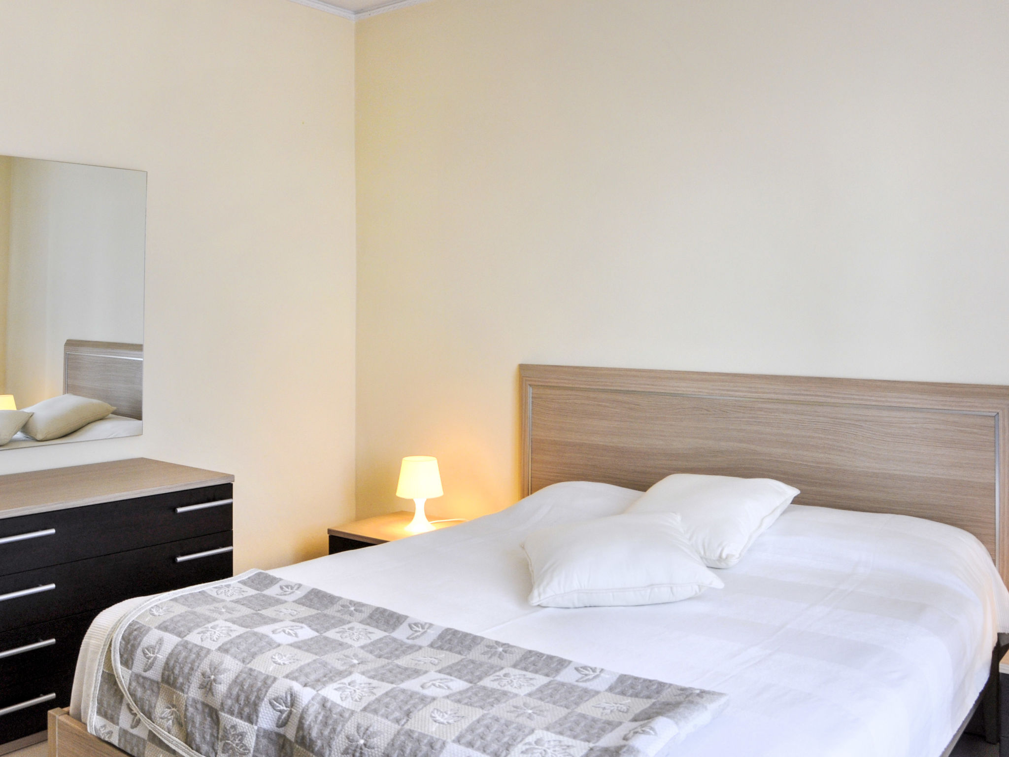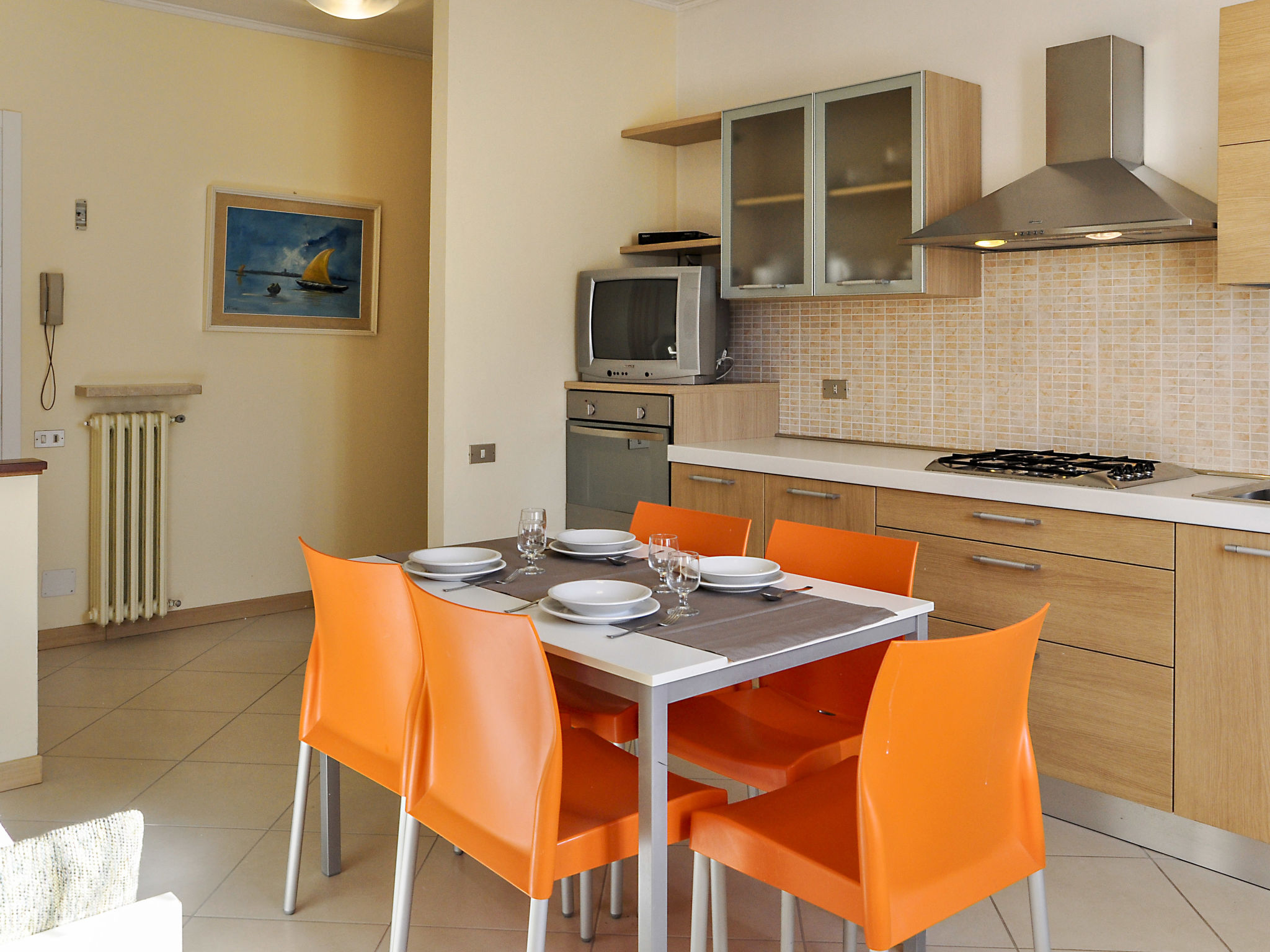 3-Zimmer-Wohnung, 1. Etage, ca. 50 m². Wohnraum mit Sitzcouch, Küchenzeile (4 Flammen, Backofen, Kühlschrank), Essplatz und Balkonausgang. Doppelzimmer, Balkonausgang. Schlafzimmer mit Einzelbett und Ausziehbett. Dusche/WC. M0230430655