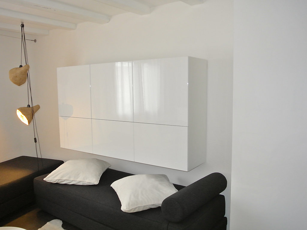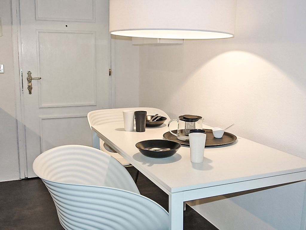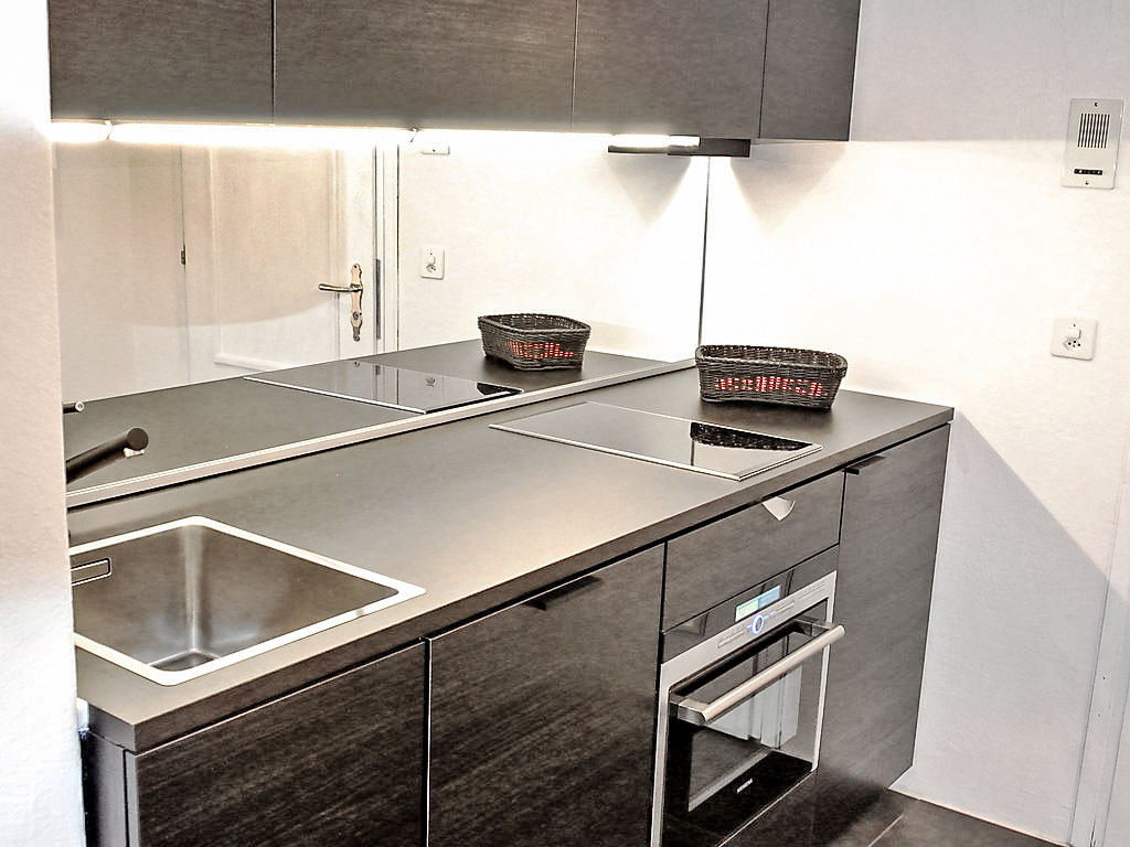 "46-2", 1-Zimmer-Wohnung 28 m2, Nordlage. Hell, vollständig renoviert im Jahre 2014, sehr komfortabel und stilvoll eingerichtet: Wohn-/Schlafzimmer mit 2 Diwanbetten (100 cm, Länge 200 cm), Esstisch, Kabel-TV, Flachbildschirm und Radio. Kochnische im Eingang (Backofen, Geschirrspüler, 3 Induktionskochplatten, elektrische Kaffeemaschine, Kombinationsmikrowelle) mit Esstisch. Bad/WC. E-Heizung. Natursteinböden. Seitliche Sicht auf die Ortschaft. Zur Verfügung: Internet (Wireless LAN). Garage. Bitte beachten: Nichtraucher-Unterkunft.