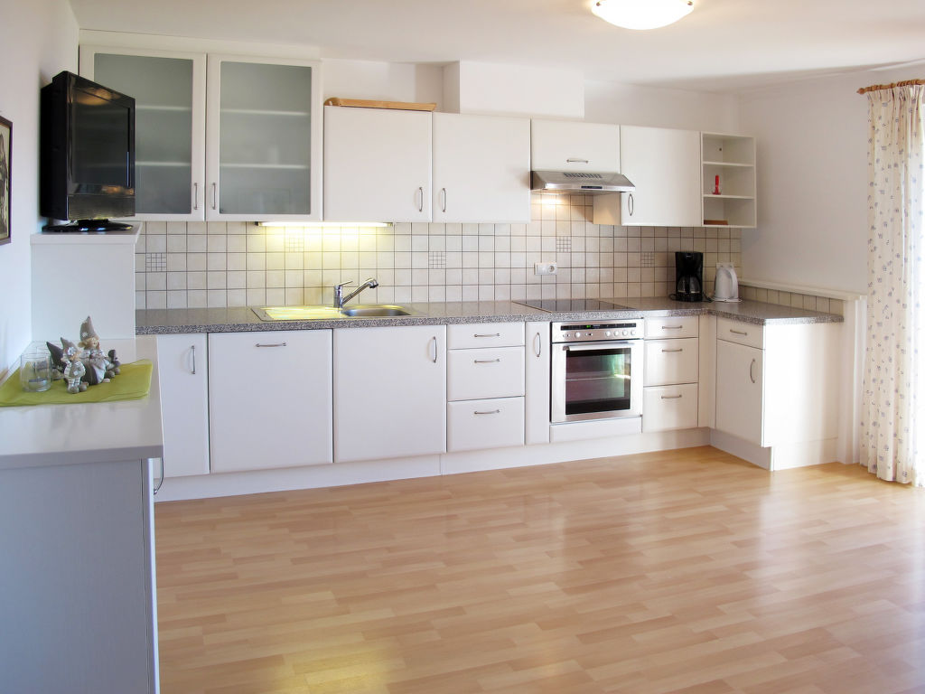 4-Zimmer-Wohnung, 2. Etage, ca. 75 m². Separater Zugang über Außentreppe. Großer Wohn-/Schlafraum mit Doppelbettcouch, Essplatz (Eckbank), Küchenzeile (4 Ceranfelder, Backofen, Geschirrspüler, Kühlschrank, Kaffeemaschine, Wasserkocher). Weiterer Wohnraum mit Sitzcouch, Essplatz (Eckbank), Küchenzeile (4 Ceranfelder, Backofen, Geschirrspüler, Kühlschrank, Kaffeemaschine, Wasserkocher). 2 Doppelzimmer. 2x Dusche/WC.
