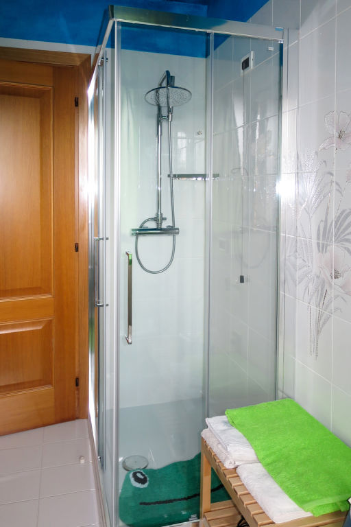 4-Zimmer-Haushälfte, 2 Etagen, ca. 110 m². Erdgeschoss: Wohn-/Schlafraum mit Sitzcouch, Kamin, Essplatz, durch Schrankwand abgetrenntes Doppelbett. Kleine Küche (4 Flammen, Backofen, Mikrowelle, Kühl-/Gefrierkombination, Kaffeemaschine, Wasserkocher, Toaster, Mixer). Dusche/WC. Kleiner Abstellraum. Obergeschoss: Diele mit zusätzlichem kleinen Kühlschrank. 2 Doppelzimmer. Einzelzimmer. Dusche/WC. Hinweis: Alle 3 Doppelbetten sind auf Wunsch auch einzeln aufstellbar.