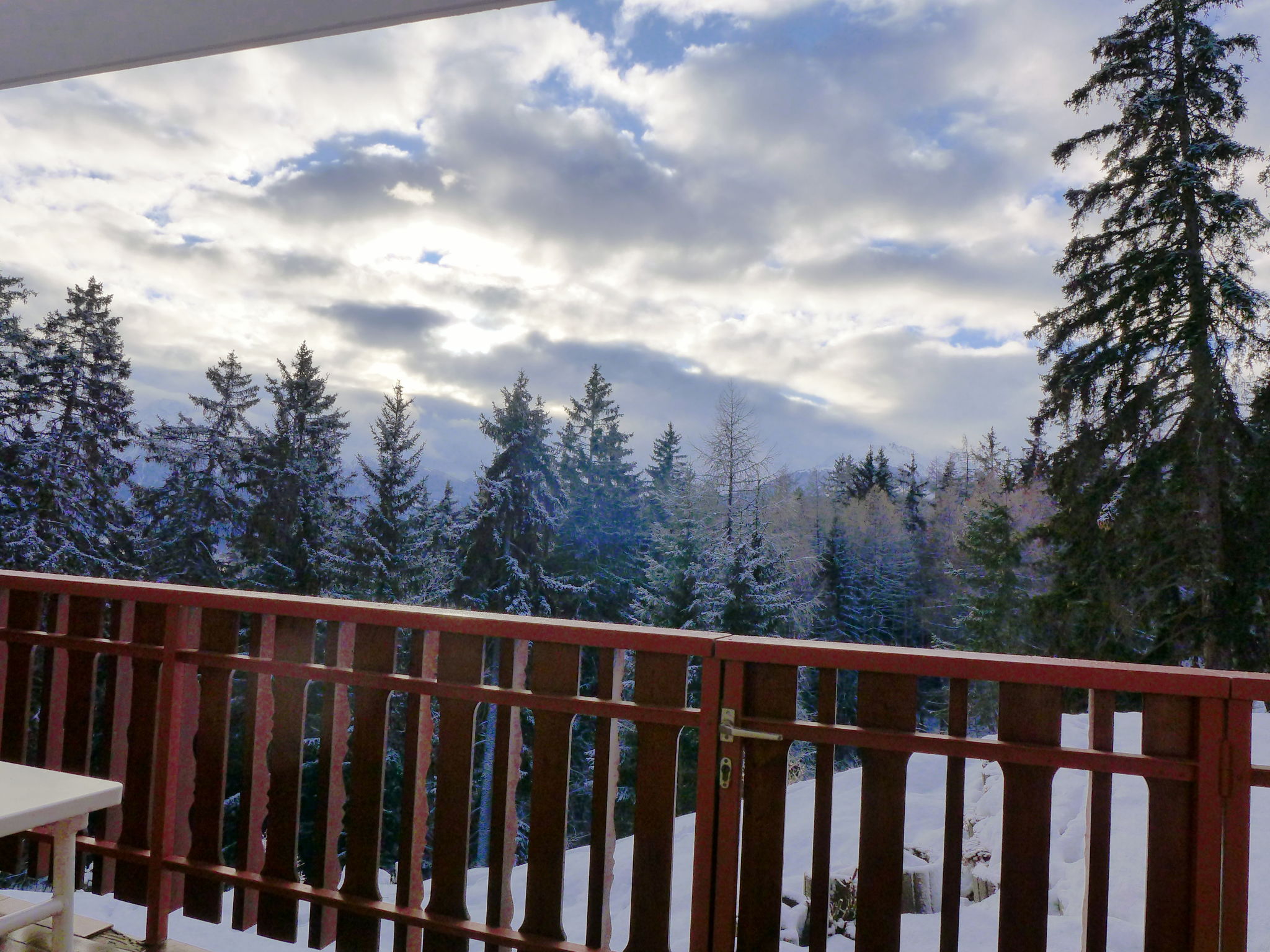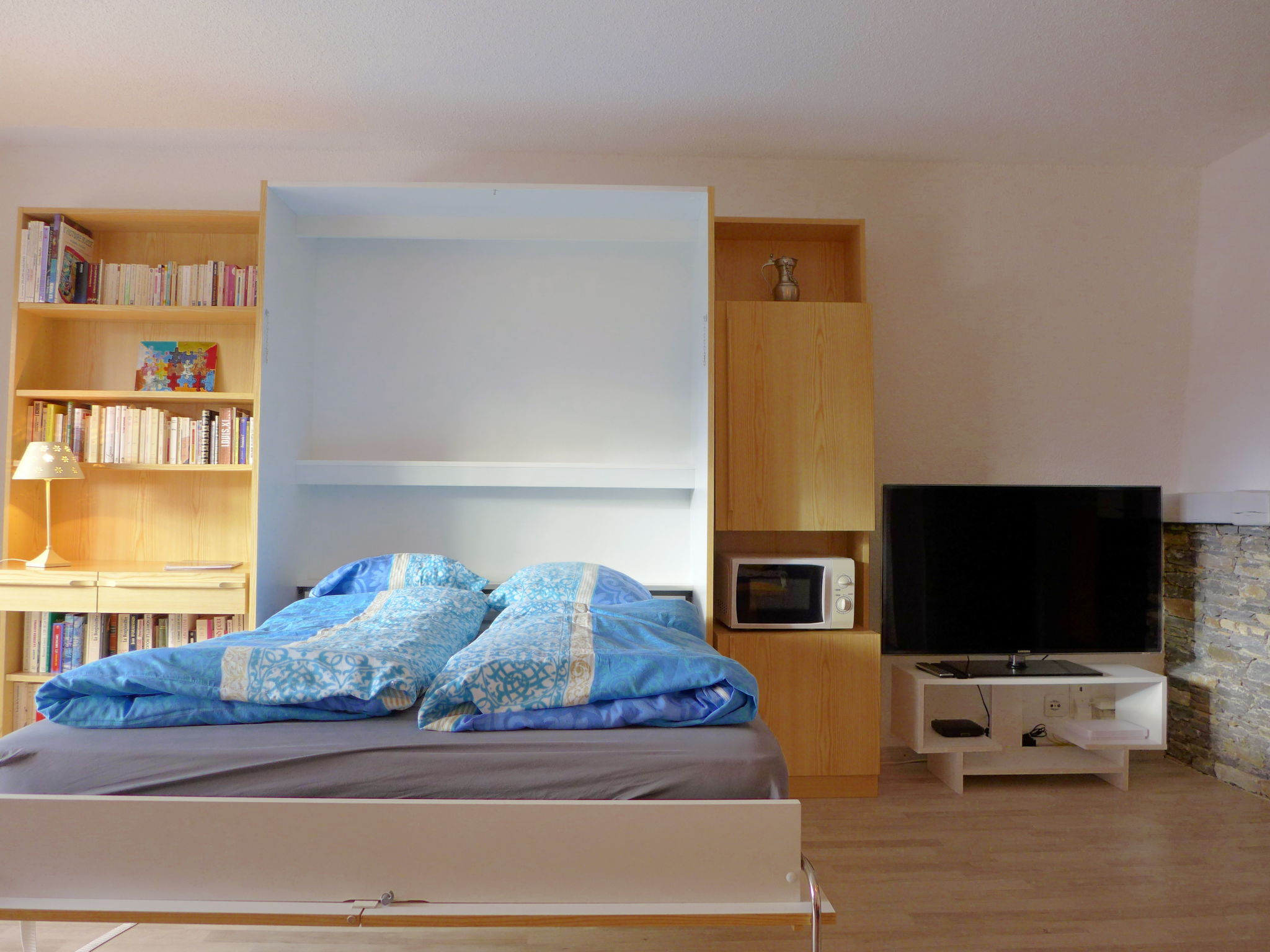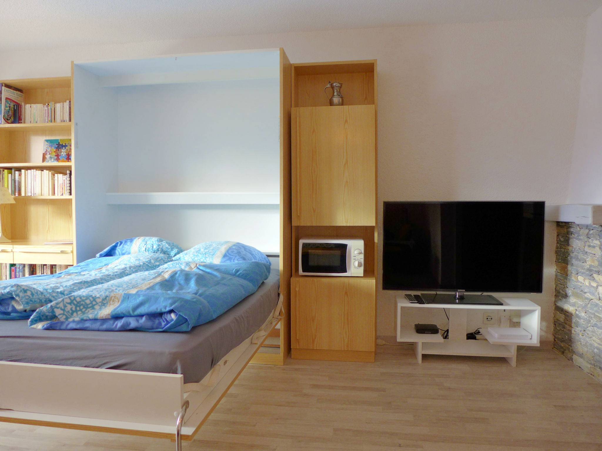 1-Zimmer-Studio 35 m2, im erhöhten Erdgeschoss. Objekt geeignet für 2 Erwachsene + 1 Kind. Wohn-/Esszimmer mit 1 Diwanbett (90 cm, Länge 187 cm), 1 franz. Wandklappbett (135 cm, Länge 190 cm), Kabel-TV mit Flachbildschirm. Küche (3 Kochplatten, Backofen, Geschirrspüler, Toaster, Wasserkocher, Mikrowelle, elektrische Kaffeemaschine, Racletteofen). Bad/Bidet/WC. Grosser Balkon, Südlage. Balkonmöbel. Eingeschränkte Sicht auf den Wald. Zur Verfügung: Bügeleisen, Babybett bis 2 Jahre, Haartrockner. Internet (Wireless LAN, gratis). Garage Nr. 1, Höhe 200 cm, Breite 210 cm. Bitte beachten: Nichtraucher-Unterkunft. Faltbares Babybett ohne Bettwäsche und ohne Decke.