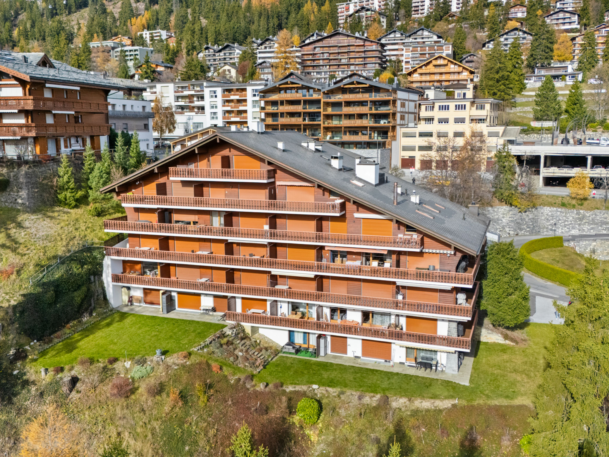 Mehrfamilienhaus "Les Faverges". Im Ort, 200 m vom Zentrum. Im Hause: Fahrstuhl, Skiraum. Parkplatz (beschränkte Anzahl) beim Haus, öffentliches Parkhaus in 100 m, extra. Bushaltestelle "Montana Poste" 100 m. Skisportanlagen 1 km. Bitte beachten: In diesem Haus sind weitere Ferienwohnungen mietbar. Das Gebäude wurde auf einem geneigten Grundstück erbaut. Die Stockwerke werden als Ebenen betrachtet, die ab Residenzboden nummeriert sind.