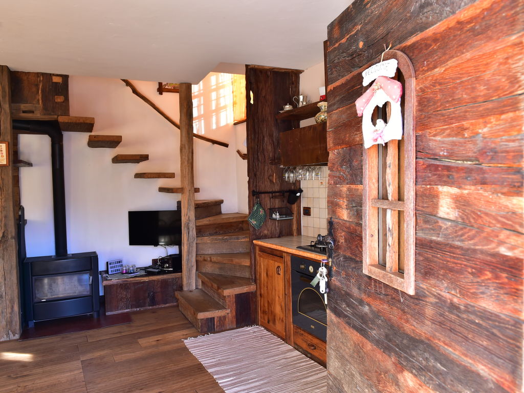3-Zimmer-Haus, 2 Etagen, ca. 65 m². Zugang über kurze Außentreppe ins Erdgeschoss: Wohnraum mit Sitzcouch, Pellettofen, Essplatz und Küchenzeile (4 Flammen, Backofen, Kühlschrank, Gefrierschrank, Kaffeemaschine, Wasserkocher, Toaster). Vom Wohnraum offene Holztreppe (kein Geländer) ins Obergeschoss (hoher offener Holzdachstuhl): Schlafzimmer mit franz. Bett (1,60 m breit) und Ausgang auf kleinen überdachten Balkon. Schlafzimmer mit Einzel- und Ausziehbett (zusammenstellbar) sowie Hochbett. Dusche/WC. Es werden keine zusätzlichen Gebühren vor Ort fällig. Bettwäsche, Endreinigung und Stromkosten sind inkludiert. CIR: 014022-CNI-00002
