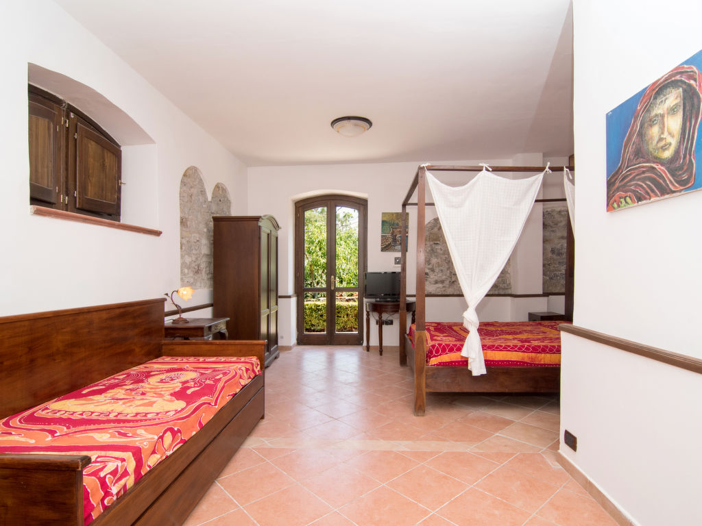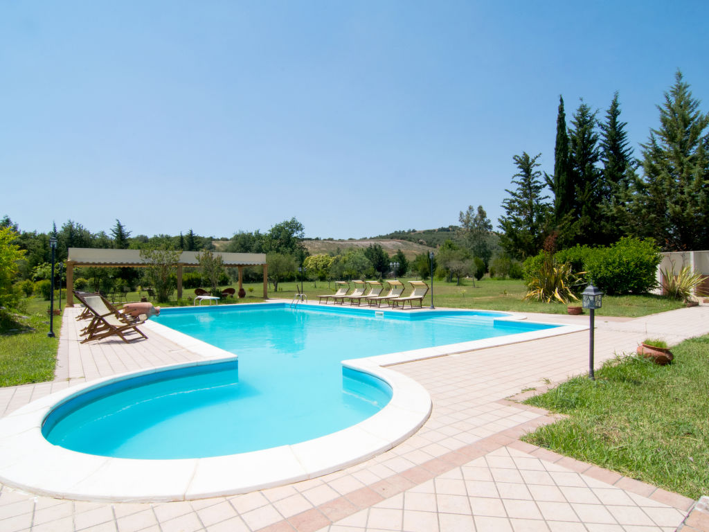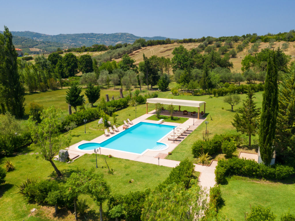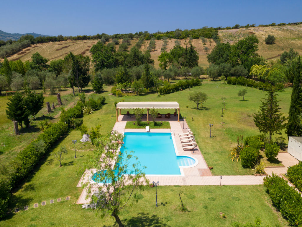 "Tenuta Valente", 5-Zimmer-Villa 200 m2 auf 2 Stockwerken. Geräumig und hell, teilweise renoviert im Jahre 2019, komfortabel und schön eingerichtet: 1 grosses Zimmer mit 4 Betten, Dusche/Bidet/WC, TV, Flachbildschirm, Klimaanlage und Warmluftheizung. Ausgang zum Gartensitzplatz. Grosses Wohn-/Esszimmer mit Esstisch, Küchenblock und TV. Ausgang zum Gartensitzplatz. Kochnische (4 Kochplatten, Backofen, Geschirrspüler, Mikrowelle, Tiefkühler, Grill) mit Esstisch. Obergeschoss: (Aussentreppe) 3 Doppelzimmer, jedes Zimmer mit Dusche/Bidet/WC und TV (Flachbildschirm), Klimaanlage. Ausgang zur Terrasse. Grosse Terrasse 150 m2, Gartensitzplatz, grosser Garten. Terrassenmöbel, Gartengrill, Liegestühle. Schöne Sicht auf den Garten und die Landschaft. Zur Verfügung: Waschmaschine, Bügeleisen, Fliegengitter, Haartrockner. Internet (Wireless LAN, gratis). Parkplatz. Bitte beachten: geeignet für Familien. Feuerlöscher, kein Fahrstuhl.
