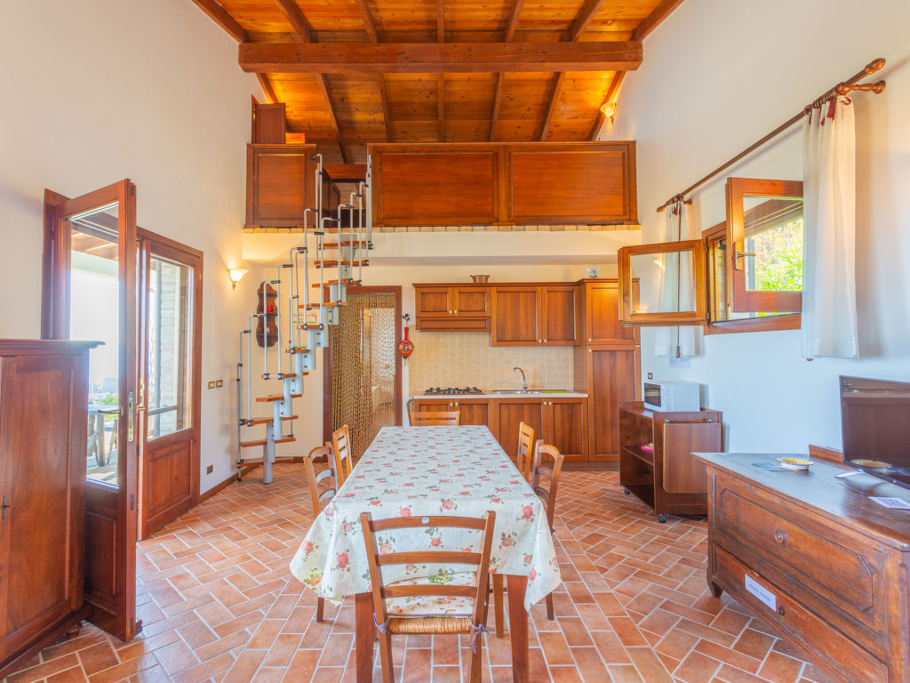 2-Zimmer-Haus, 2 Ebenen, ca. 75 m². Erdgeschoss: Wohnraum mit Sessel, Kamin, Essplatz, Küchenzeile (5 Flammen, Mikrowelle, Kühl-/Gefrierkombination, Kaffeemaschine, Toaster), Terrassenausgang. Schlafzimmer mit franz. Bett (1,60 m breit) und Einzelbett. Dusche/WC. Vom Wohnraum schmale Wendeltreppe zur Galerie (Dachschräge, eingeschränkte Stehhöhe, offen zu Wohnraum und Schlafzimmer) mit franz. Bett (1,60 m breit).