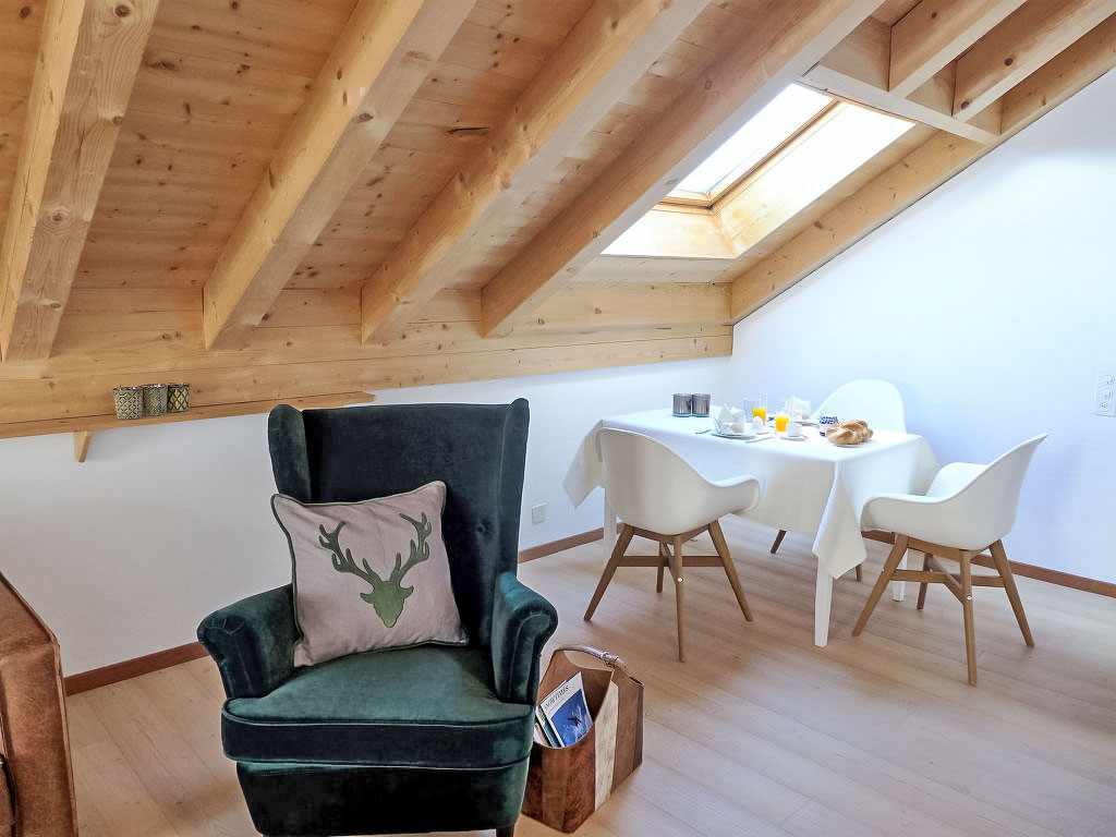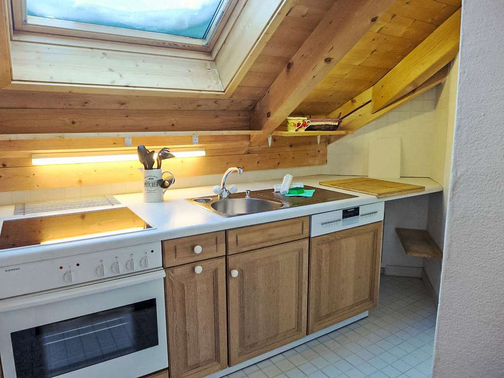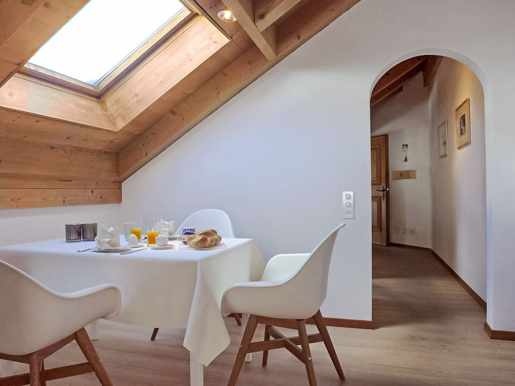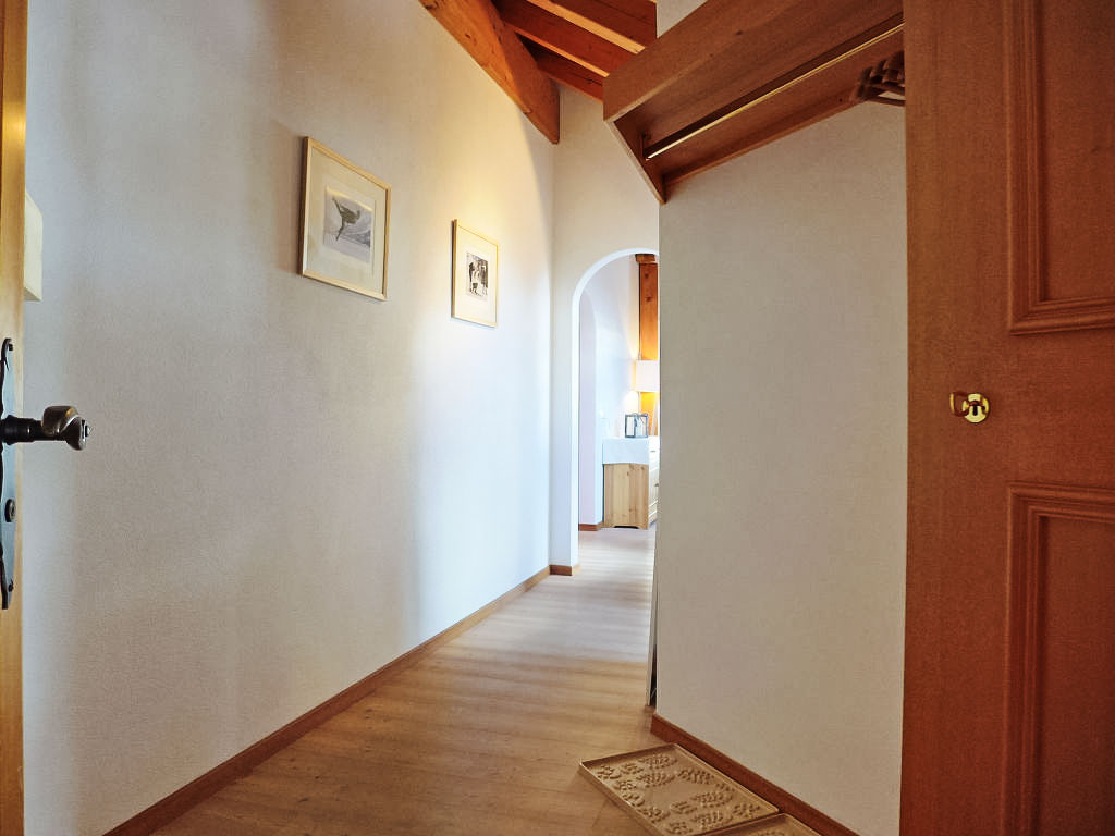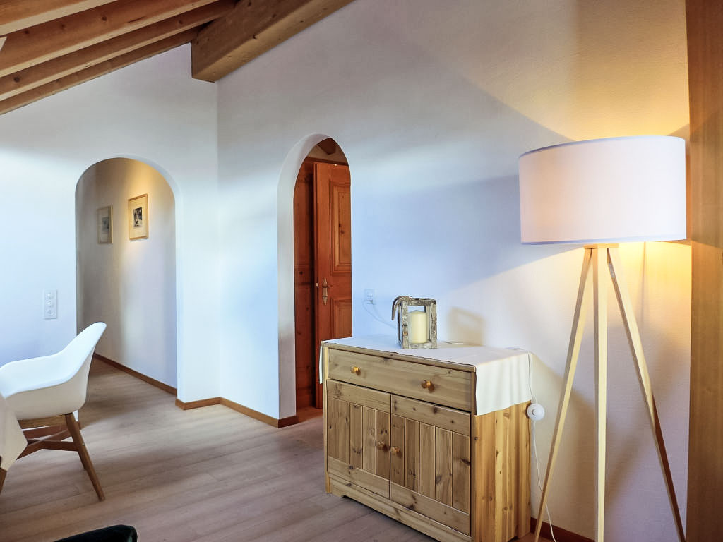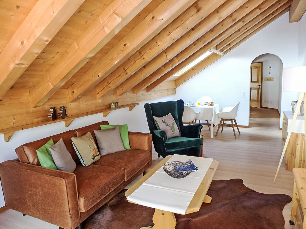 "Chesa Fuoll Alva C10", 2-Zimmer-Attikawohnung 60 m2, im Dachgeschoss. Abgeschrägt, geschmackvoll und gemütlich eingerichtet: offenes Wohn-/Esszimmer mit Dachfenster mit offenem Kamin und TV (Flachbildschirm). Ausgang zum Balkon, Richtung Westen. Abgeschrägt 1 Doppelzimmer mit 1 Doppelbett (2 x 80 cm, Länge 200 cm). Ausgang zum Balkon. Abgeschrägte, offene Küche (Backofen, Geschirrspüler, 4 Glaskeramikherd Platten, Toaster, Wasserkocher, elektrische Kaffeemaschine, Kapseln für die Kaffeemaschine (Nespresso) extra). Bad/WC. Holzböden. Liegestühle (2). Seitliche Sicht auf die Berge und die Landschaft. Zur Verfügung: Bügeleisen, Haartrockner. Internet (Wireless LAN, gratis). Garage Nr. 27, Höhe 220 cm, Breite 210 cm. Bitte beachten: Nichtraucher-Unterkunft. 1 Haustier/Hund erlaubt. :Fahrstuhl nur bis zum 2. Stock (steile Treppe zum Dachgeschoss).