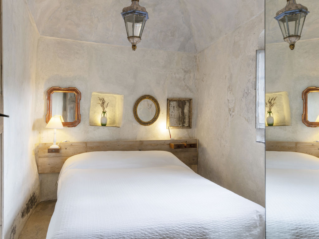 3-Zimmer-Wohnung 'Rosetta', 2. Etage (2 Ebenen), ca. 70 m². Zugang über steile, schmale Innentreppe. Wohnraum mit Sitzcouch, Essplatz und Pelletkaminofen, über steile Treppe zur Terrasse. Vom Wohnraum über einige Stufen zur Küche (4 Induktionsfelder, Mini-Backofen, Geschirrspüler, Kühlschrank, Kaffeemaschine) mit Essplatz für 2 Personen. Über Treppe hinunter zu Schlafzimmer mit franz. Bett (1,40 m breit, kleines Fenster), zu weiterem Schlafzimmer mit franz. Bett (1,60 m breit) sowie zu Dusche/WC. CITR: 008041-AGR-0006