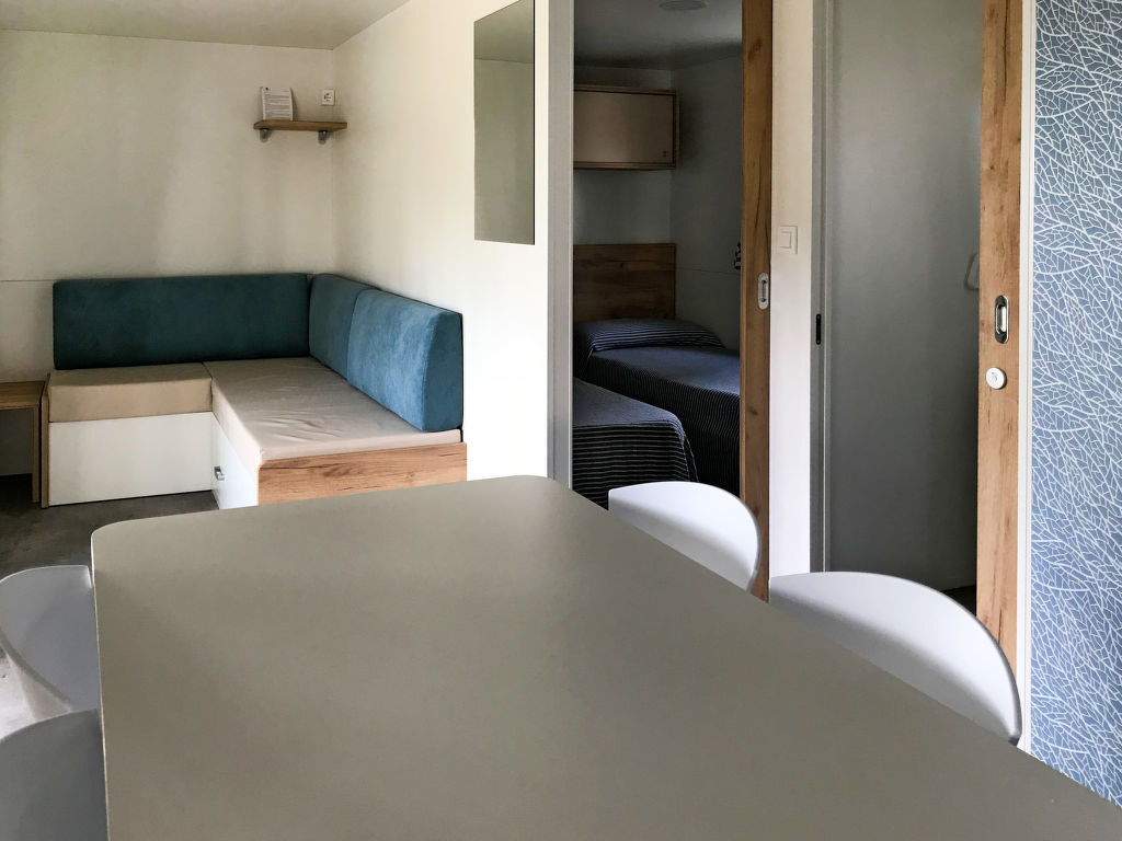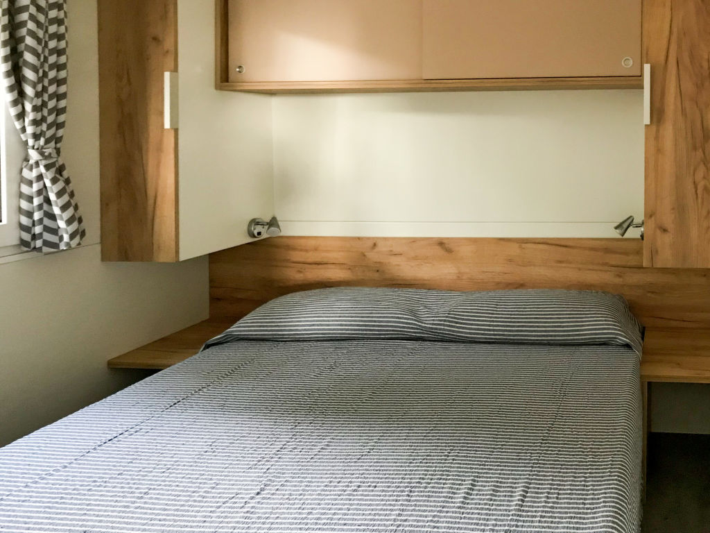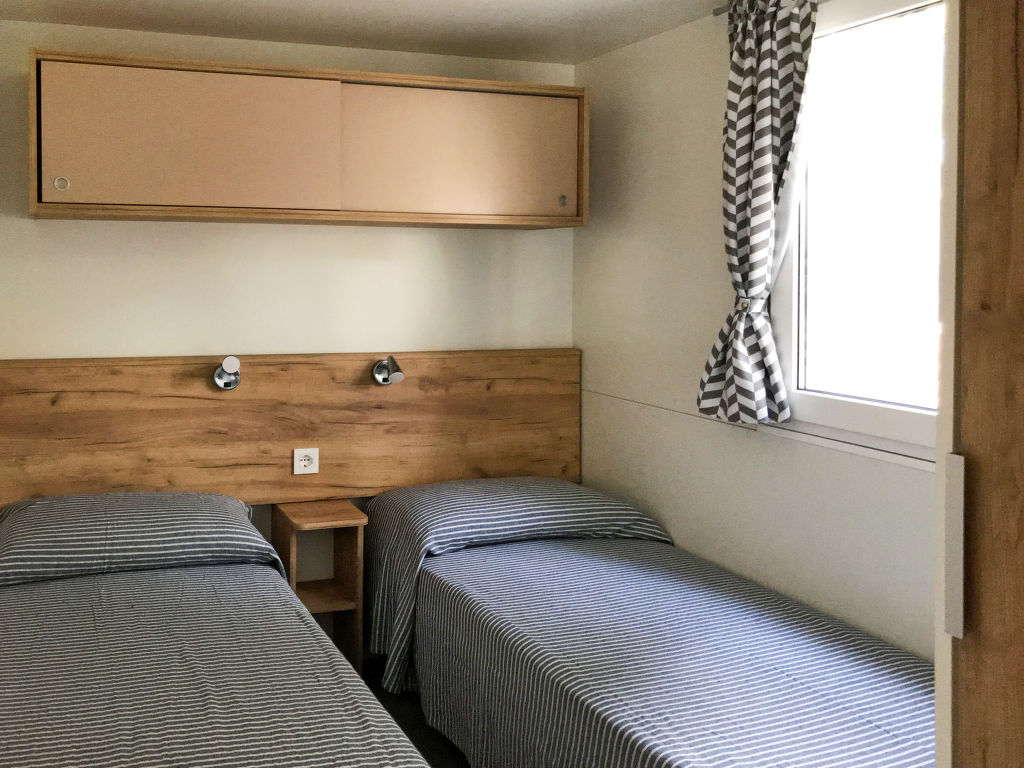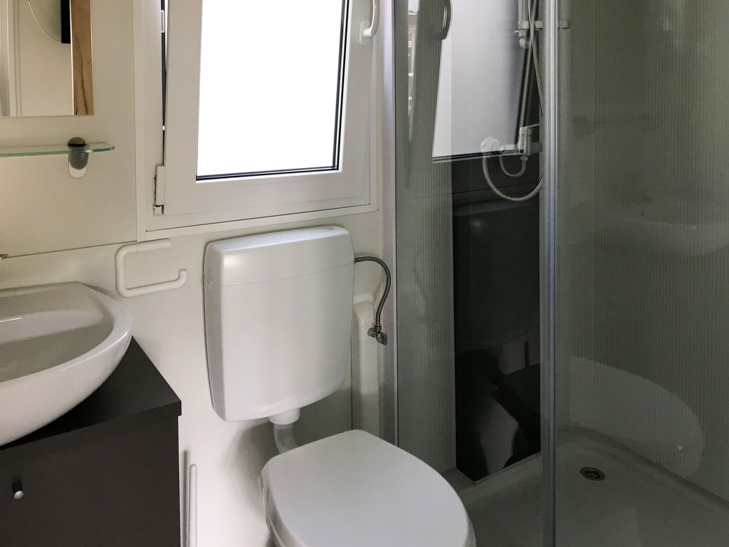 3-Zimmer-Mobilhome, ca. 32 m². Zugang über 4 Stufen. Wohn-/Schlafraum mit Doppelbettcouch, Essplatz, Küchenzeile (4 Flammen, Kühl-/Gefrierkombination), Terrassenausgang. Schlafzimmer mit franz. Bett (1,60 breit) und sep.WC. Zweibettzimmer (Betten 0,80 m breit). Dusche/WC. Strandentfernung ca. 400-500 m.
