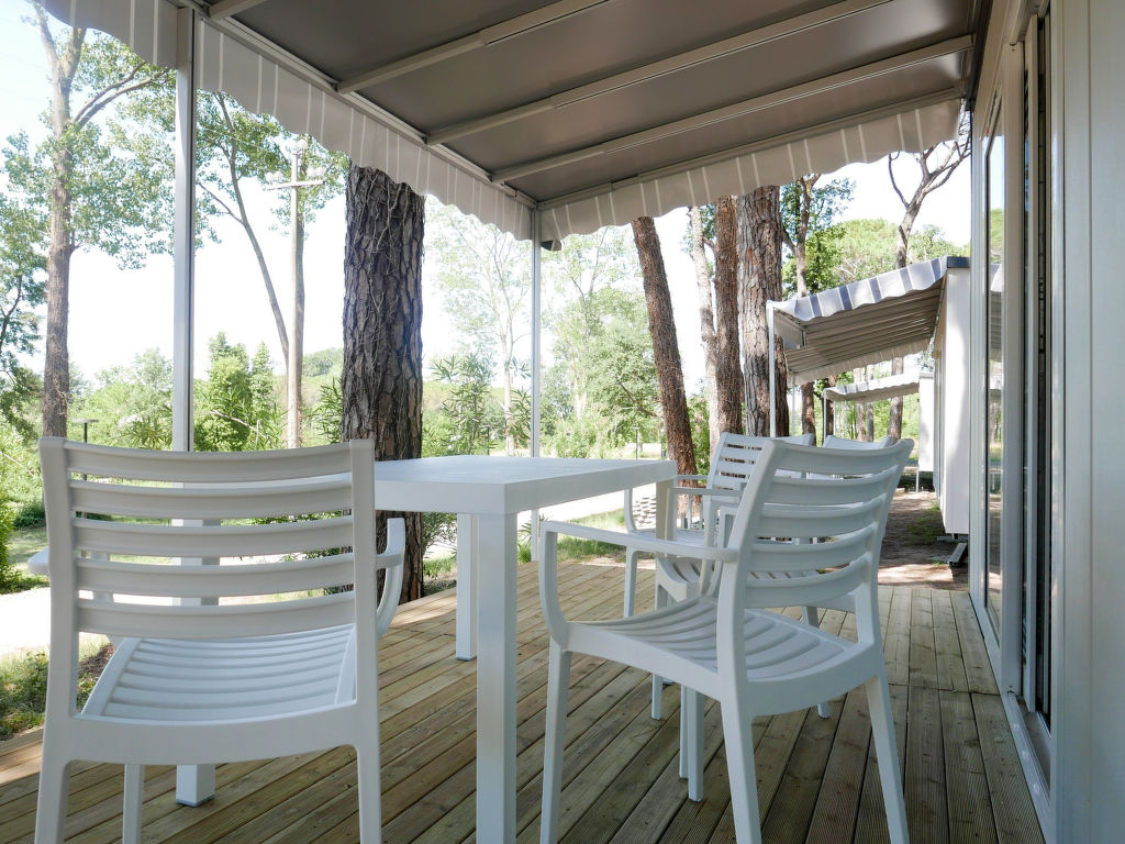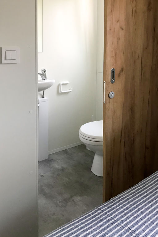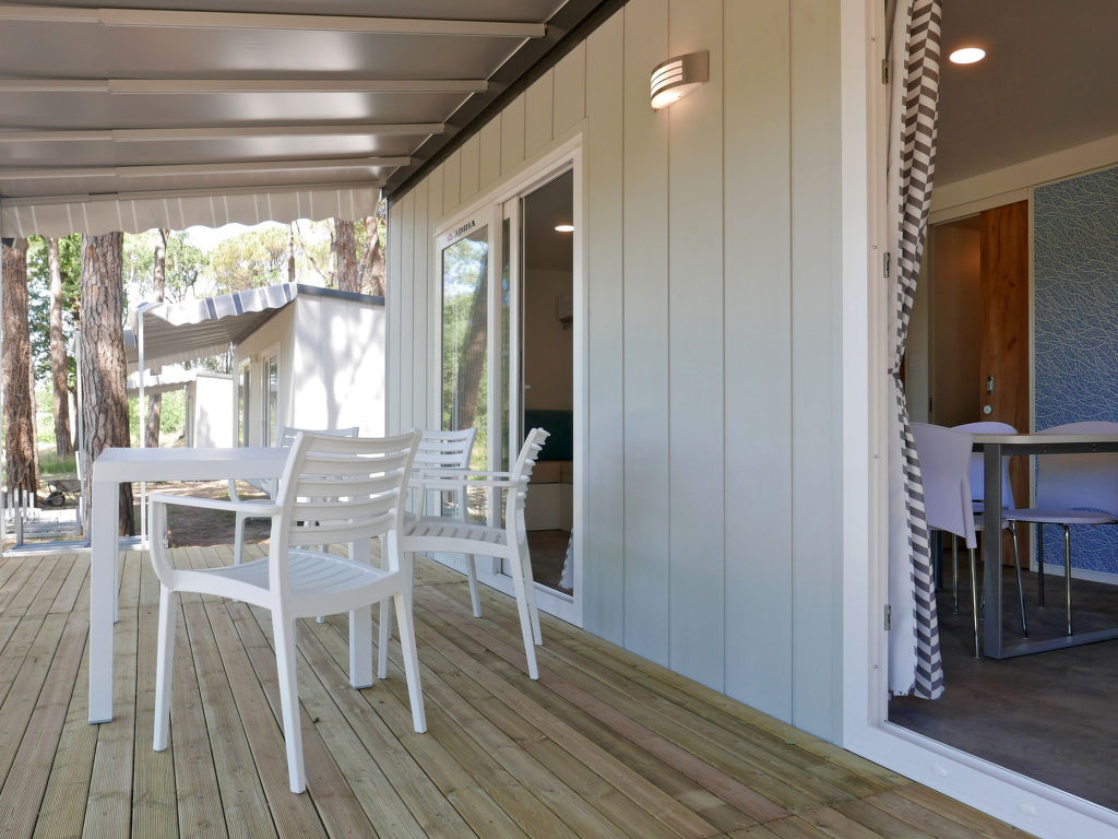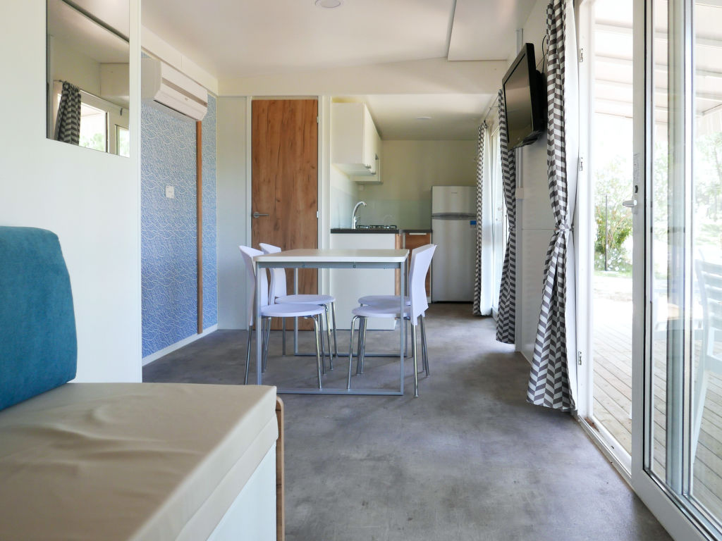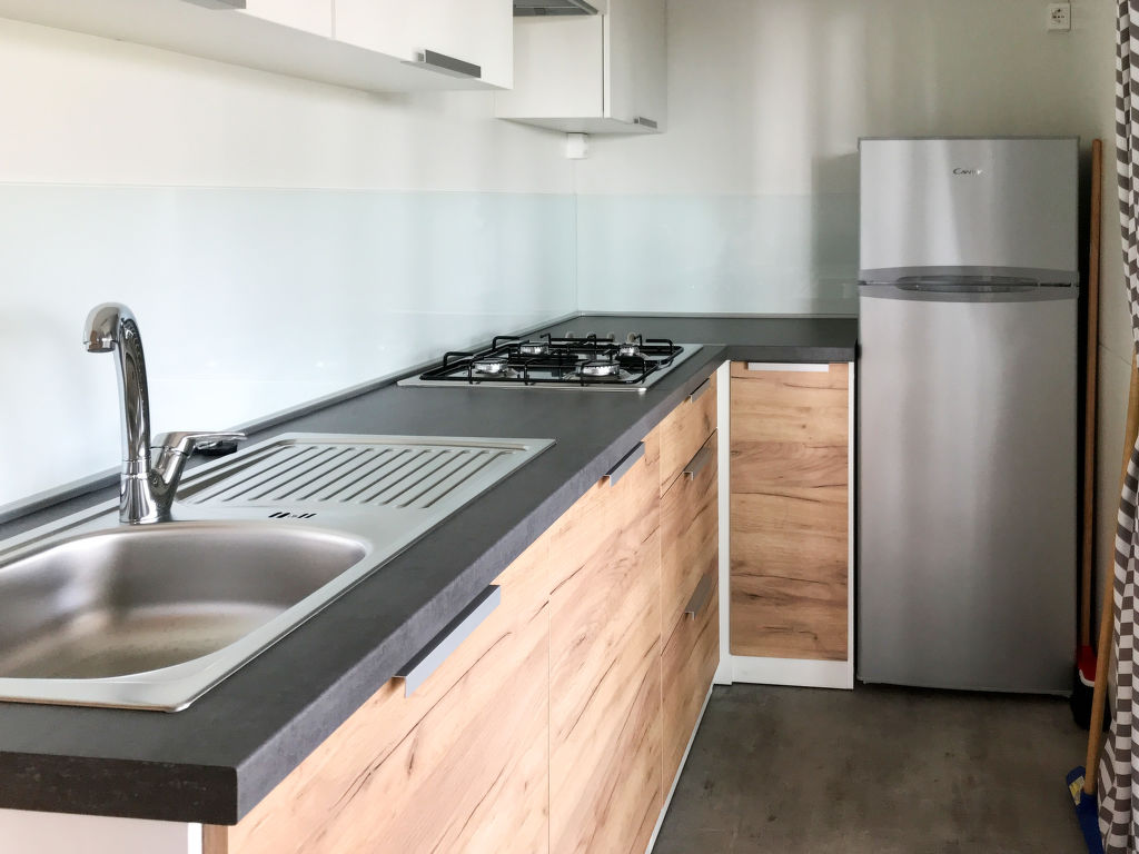 3-Zimmer-Mobilhome, ca. 32 m². Zugang über 4 Stufen. Wohn-/Schlafraum mit Doppelbettcouch, Essplatz, Küchenzeile (4 Flammen, Kühl-/Gefrierkombination), Terrassenausgang. Schlafzimmer mit franz. Bett (1,60 breit) und sep.WC. Zweibettzimmer (Betten 0,80 m breit). Dusche/WC. Strandentfernung ca. 400-500 m.