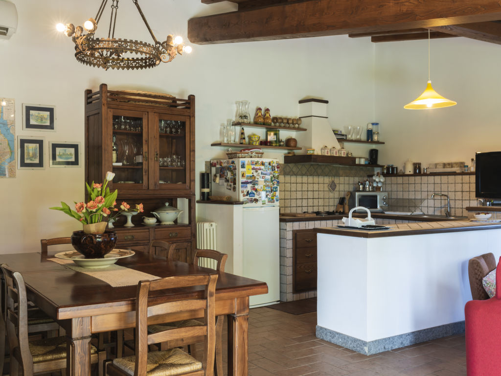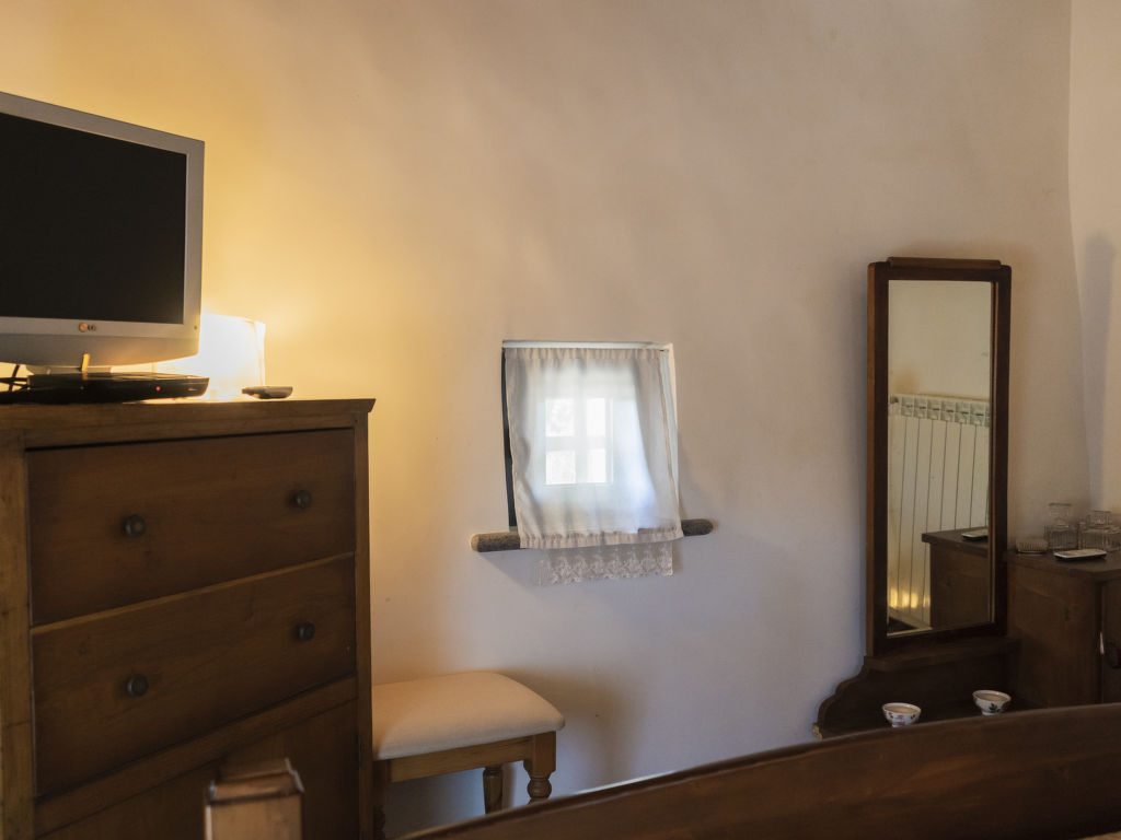 2-Zimmer-Haus 80 m2 auf 2 Stockwerken. Rustikal und gemütlich eingerichtet: Wohn-/Esszimmer mit 1 Diwanbett, offenem Kamin, Sat-TV und Klimaanlage. Ausgang zum Garten, zur Terrasse. 1 offenes Zimmer mit 1 Klappbett. Kochnische (Backofen, 4 Flammen, Mikrowelle, Tiefkühler). Dusche/WC. G-Heizung. Obergeschoss: offen 1 Doppelzimmer. Holzböden. 2 Terrassen überdacht. Terrassenmöbel, Gartengrill, Liegestühle. Schöne Sicht auf die Landschaft. Zur Verfügung: Waschmaschine, Fliegengitter, Kinderhochstuhl, Babybett. Internet (Wireless LAN, gratis). 2 kleine Haustiere/Hunde erlaubt. Flexibilität bei der Bettenaufteilung: Es stehen mehr Schlafmöglichkeiten zur Verfügung als die maximal zugelassene Personenzahl, diese darf dennoch nicht überschritten werden.