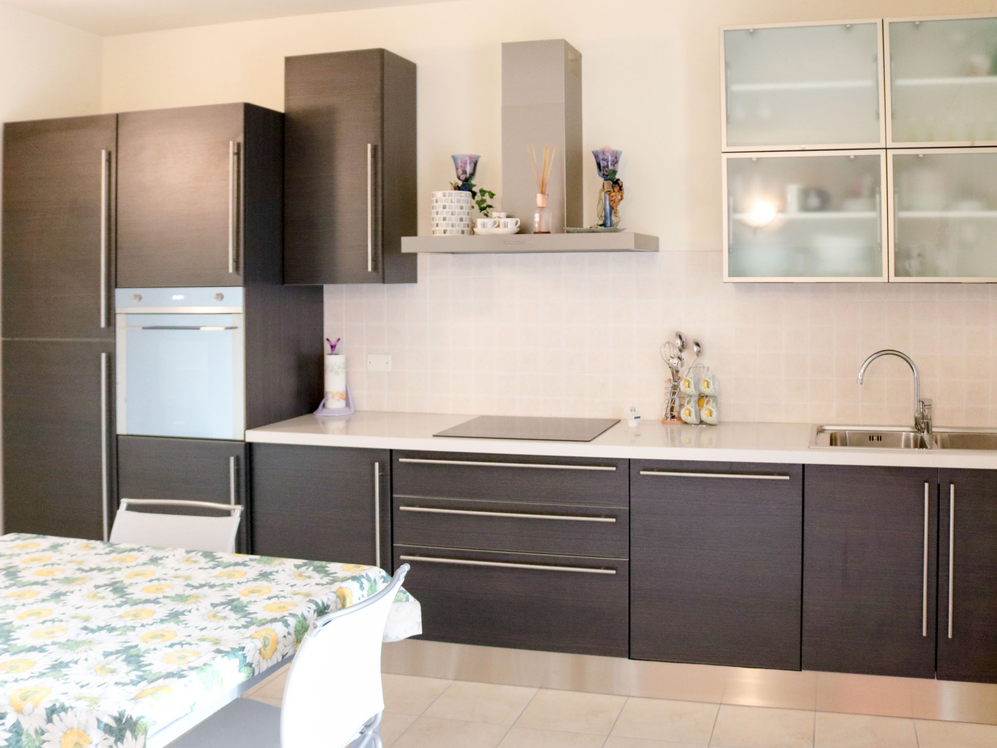 3-Zimmer-Wohnung, Erdgeschoss, ca. 60 m². Wohn-/Schlafraum mit Bettcouch, Essplatz und Küchenzeile (4 Induktionsfelder, Backofen, Geschirrspüler, Kühl-/Gefrierkombination). Doppelzimmer, Gartenausgang. Schlafzimmer mit Etagenbett und Ausziehbett, Gartenausgang. Dusche/WC. Flexibilität bei der Bettenaufteilung: Es stehen mehr Schlafmöglichkeiten zur Verfügung als die maximal zugelassene Personenzahl, diese darf dennoch nicht überschritten werden. CIR:M0230430470