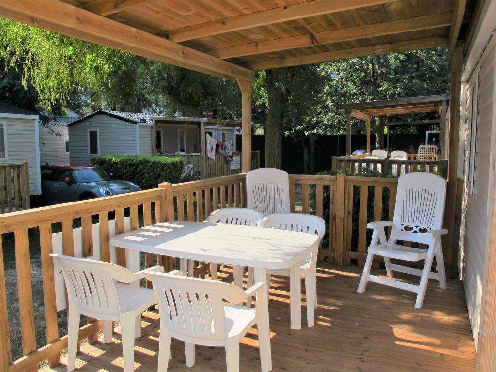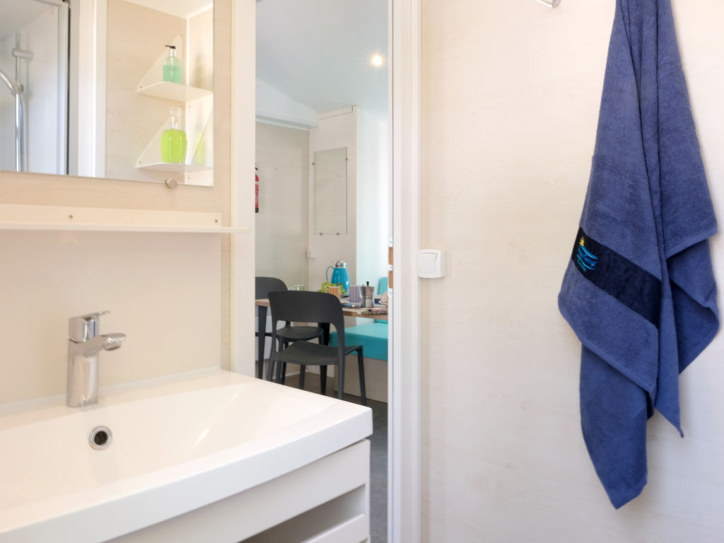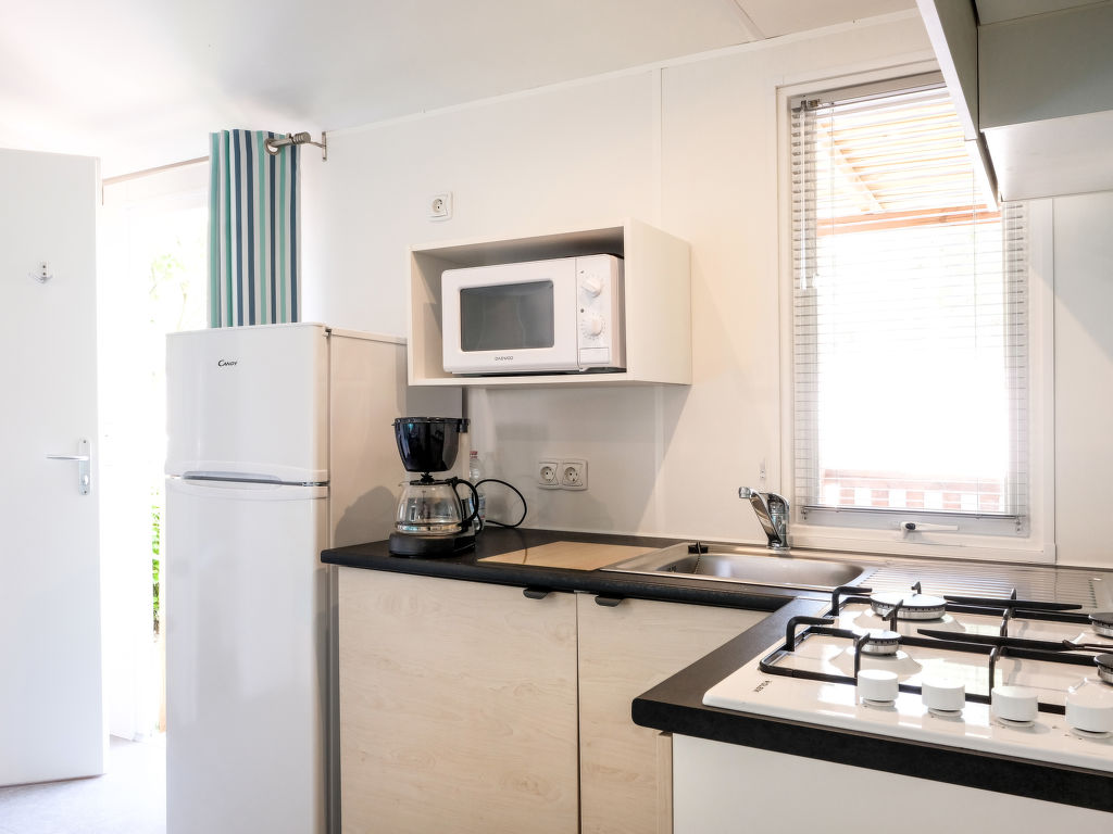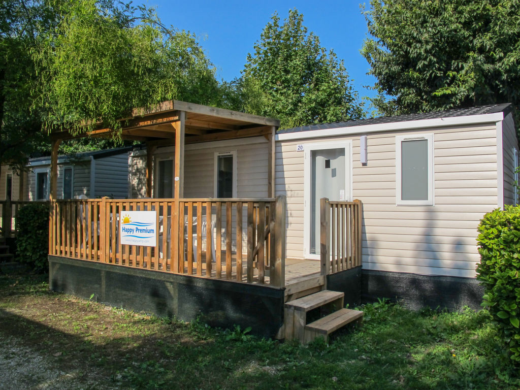 "Happy Premium", 4-Zimmer-Mobilheim 30 m2. Komfortabel eingerichtet: Wohn-/Schlafzimmer mit 1 Diwanbett, Esstisch, E-Heizung und Klimaanlage. 1 Zimmer mit 1 franz. Bett (140 cm). 2 Zimmer, jedes Zimmer mit 2 Betten (70 cm). Offene Küche (4 Kochplatten, Mikrowelle, Tiefkühler, elektrische Kaffeemaschine). Dusche/WC. Terrasse teilweise überdacht. Terrassenmöbel, Elektrogrill (mobil), Liegestühle (2). Zur Verfügung: Fliegengitter. Bitte beachten: Nichtraucher-Unterkunft. Maximal 1 kleines Haustier/Hund erlaubt.