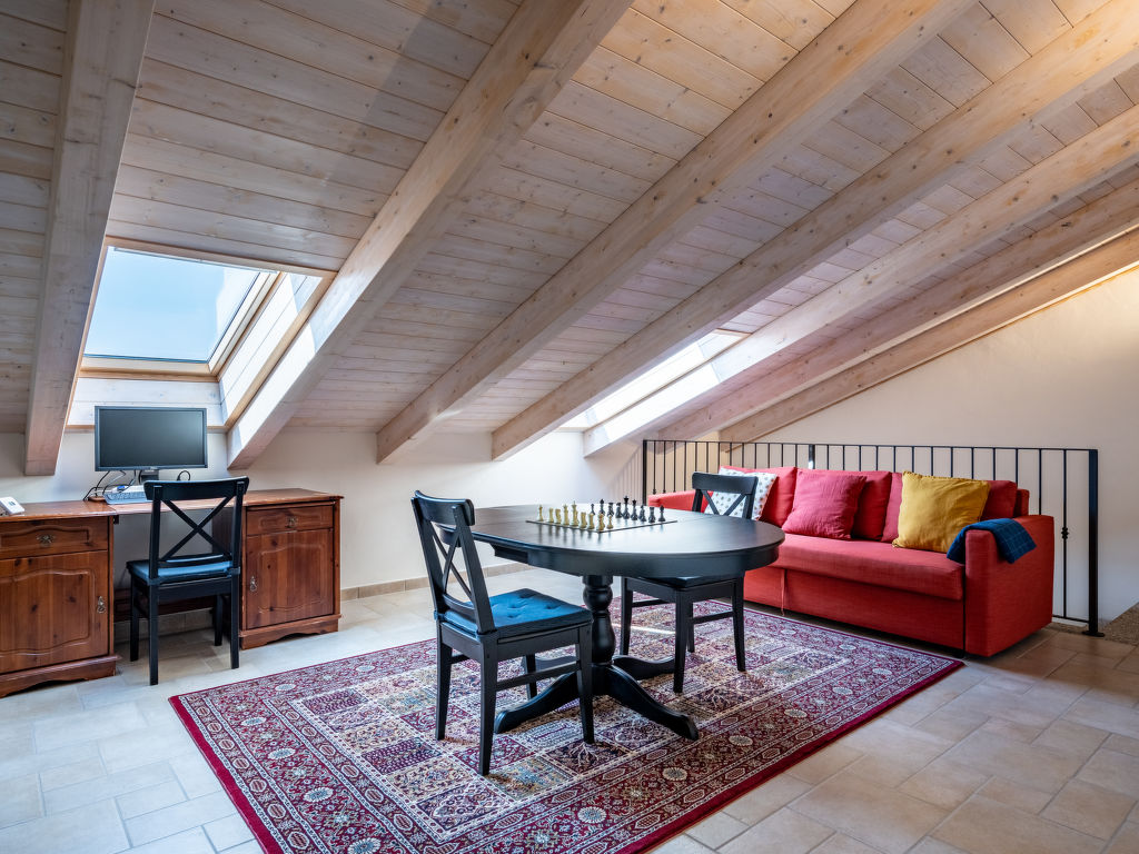 10-Zimmer-Haus, 3 Etagen, ca. 400 m². Erdgeschoss: Wohnraum mit Sitzgruppe, Kamin (Einsatz) und Essplatz. Große Küche (6 Flammen, 2x Backofen, Geschirrspüler, amerikanischer Kühlschrank, kleiner Gefrierschrank, Kaffeemaschine, Wasserkocher, Toaster), Terrassenausgang. Dusche/WC. 1. Etage: Wohnraum mit Sitzgruppe, Kamin (Einsatz)und Balkonausgang. 4 Doppelzimmer, davon 3 mit Balkonausgang. Dusche/WC. Bad/Dusche/WC. Dachgeschoss (nicht störende Dachschräge): Wohn-/Schlafraum mit Sitzgruppe/Doppelbettcouch (als Zusatzbetten, siehe Nebenkosten). 3 Doppelzimmer. Dusche/WC. Bei Belegung mit weniger Personen als der maximalen Personenzahl steht eine Etage nicht zur Verfügung. CIR: 00613500001