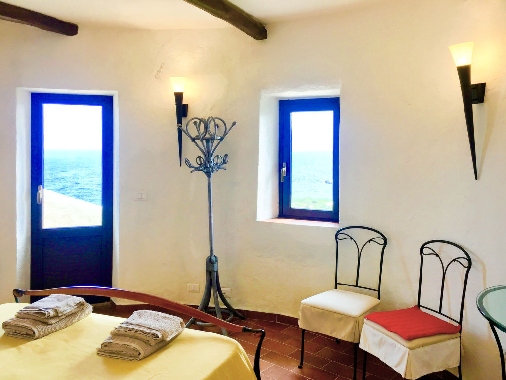 "Torre d'amore (STT200)", 3-Zimmer-Haus 55 m2 auf 3 Stockwerken. Rustikal eingerichtet: 1 Zimmer mit 1 Doppeldiwanbett (150 cm). Dusche/WC. Obergeschoss: Wohnküche (Geschirrspüler, 4 Glaskeramikherd Platten, Wasserkocher, Mikrowelle, Tiefkühler, elektrische Kaffeemaschine) mit Esstisch, Sat-TV. 2. Obergeschoss: 1 Zimmer mit 1 franz. Bett (160 cm), Dusche/WC, E-Heizung und Klimaanlage. Terrasse. Terrassenmöbel, Liegestühle (2). Panoramasicht auf das Meer und die Landschaft. Zur Verfügung: Waschmaschine, Kinderhochstuhl, Babybett. Internet (Wireless LAN, gratis). 1 Haustier/Hund erlaubt.
