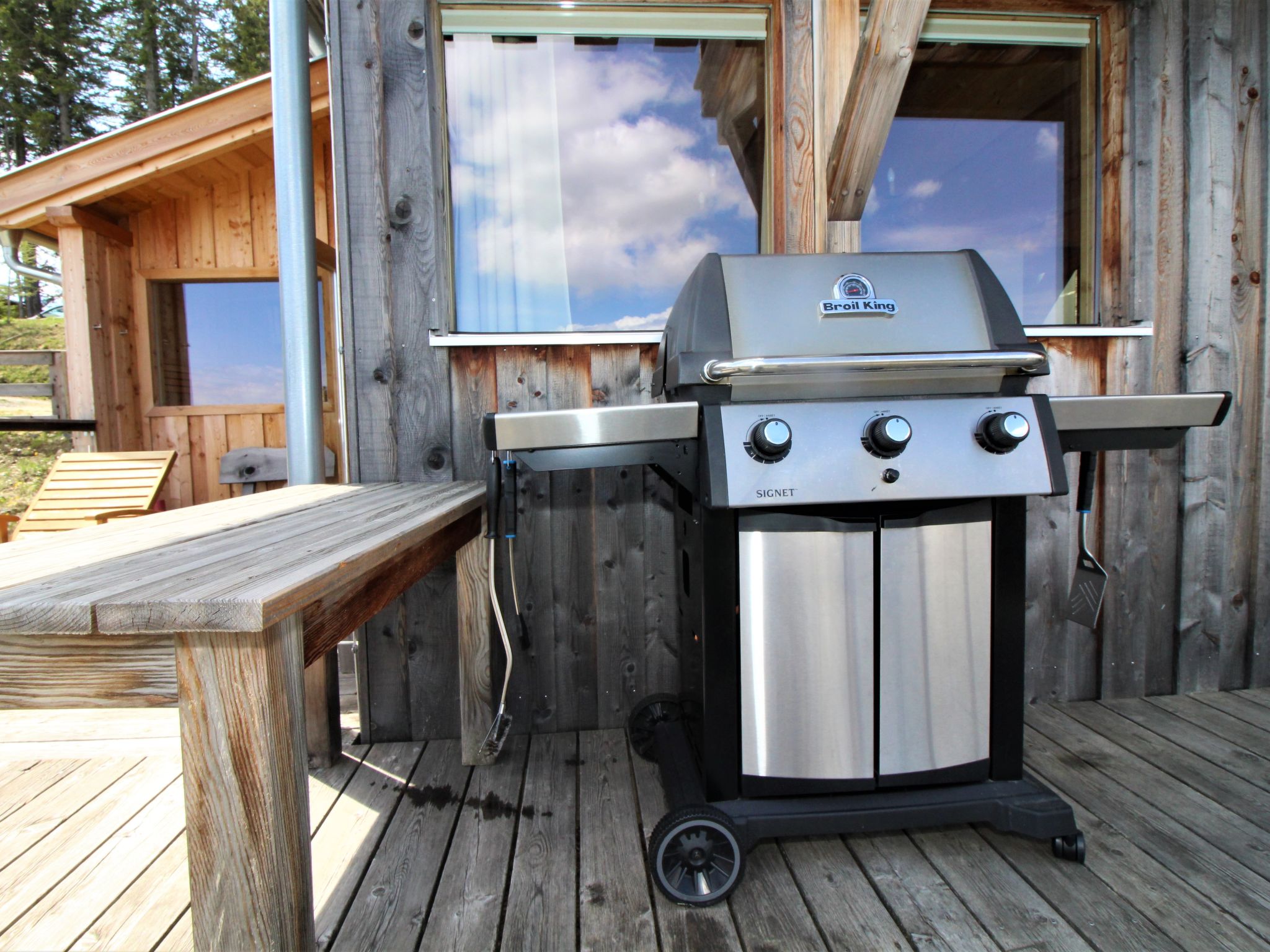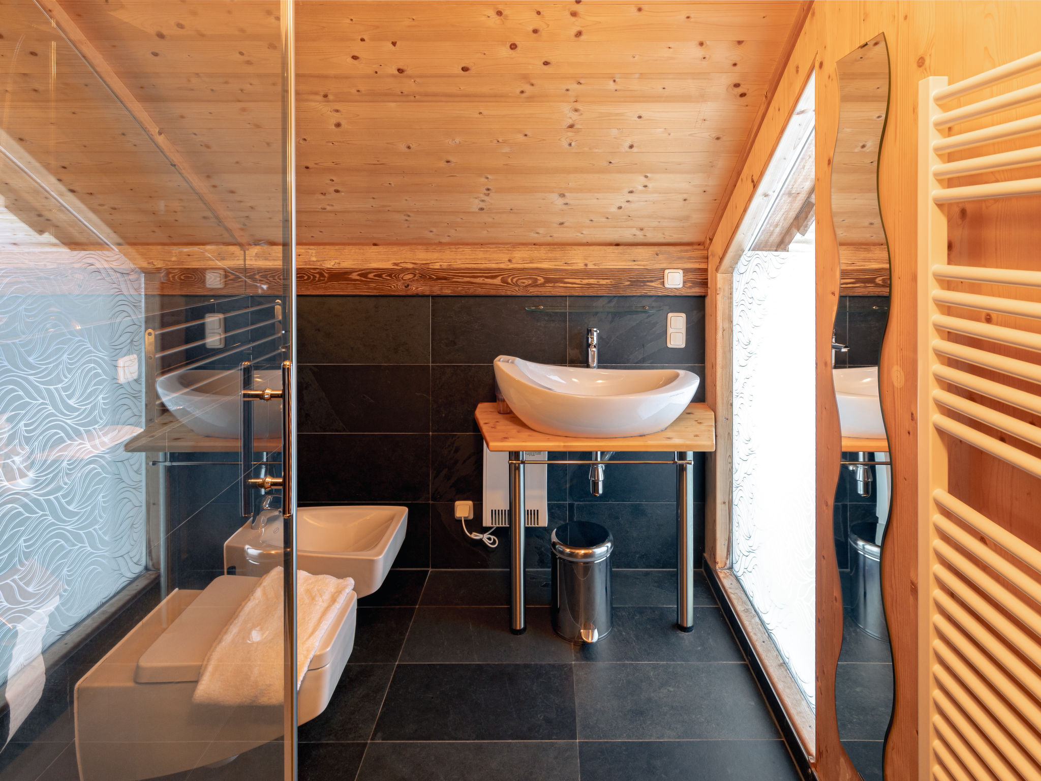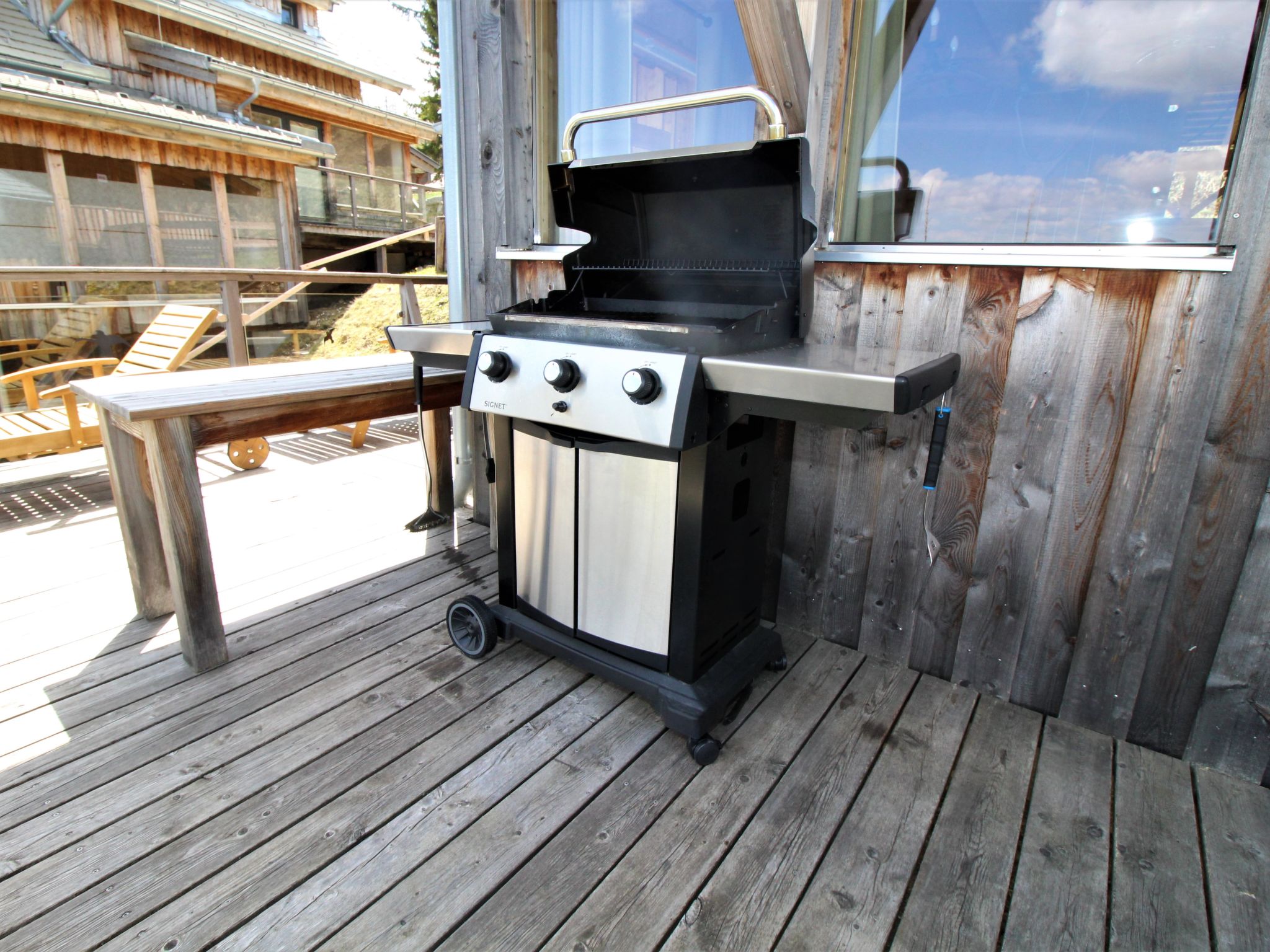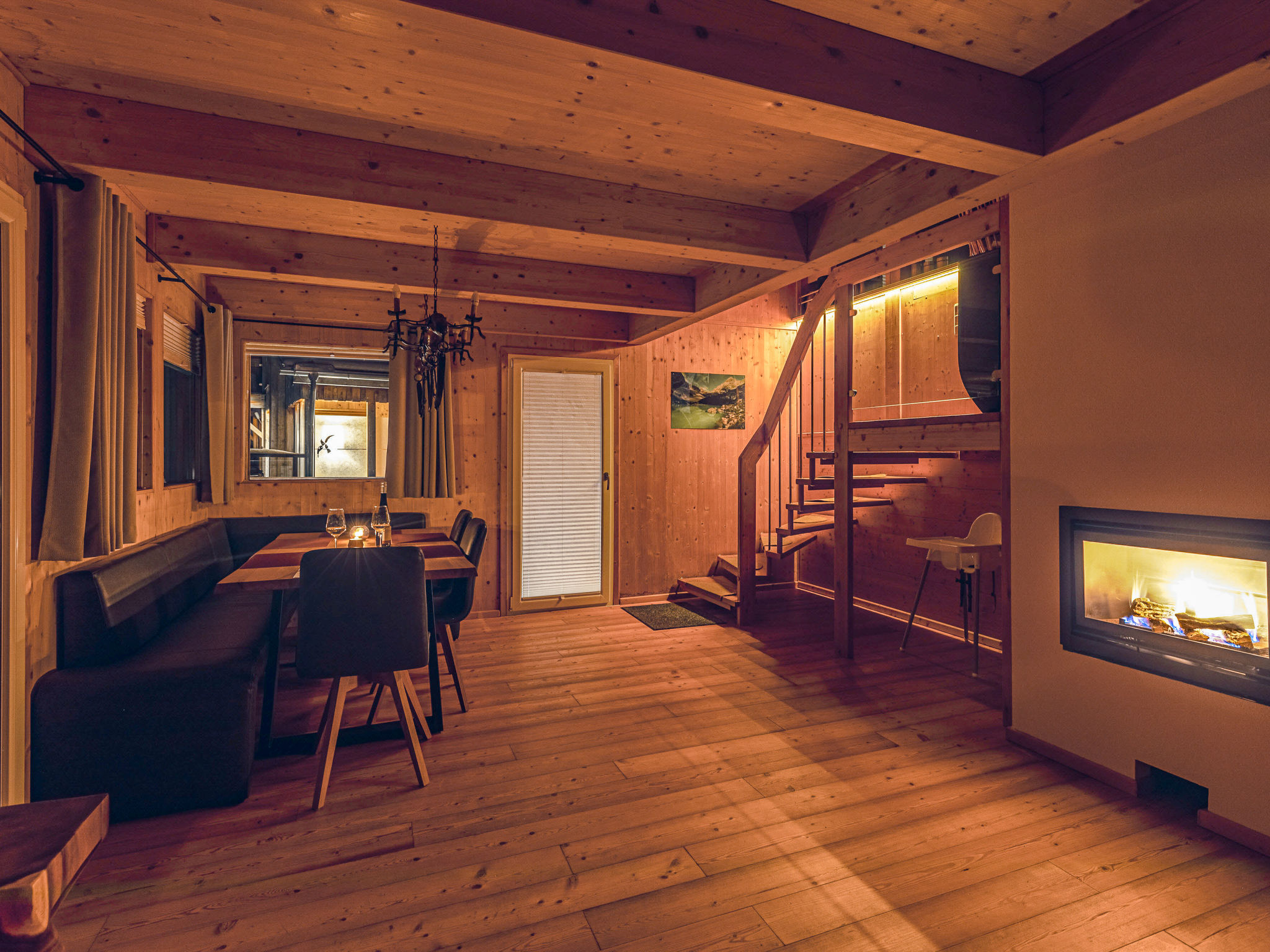 4-Zimmer-Chalet 130 m2. Geräumig, teilweise abgeschrägt, luxuriös und geschmackvoll eingerichtet: offene Küche (Backofen, Geschirrspüler, 4 Induktionskochplatten, Wasserkocher, Tiefkühler, elektrische Kaffeemaschine) mit kleiner Bar. Bad/Dusche, sep. WC, Whirlbadewanne, Sauna. Unteres Geschoss: offenes grosses Wohn-/Esszimmer mit Panoramafenster mit Esstisch, Sat-TV, Digital-TV und G-Heizofen. Ausgang zur Terrasse. Obergeschoss: 1 Doppelzimmer mit Dusche/Bidet/WC. Ausgang zum Balkon. Dachgeschoss: 2 Doppelzimmer. Bad/Bidet/WC, Doppelwaschbecken mit Eckbadewanne. E-Heizung, G-Heizung. Kleiner Balkon, grosse Terrasse. Terrassenmöbel, Gartengrill, Liegestühle. Herrliche Panoramasicht auf das Tal und die Landschaft. Zur Verfügung: Bügeleisen, Haartrockner. Internet (Wireless LAN, gratis). Bitte beachten: Nichtraucher-Haus. Rauchmelder, Feuerlöscher. Separater Gasgrill im Außenbereich. Die Außensauna ist eine finnische Trockensauna mit herrlicher Panoramasicht. Nicht inkludiert: Aufgussöle/Düfte. Aufgrund der geografischen Lage kann ein Internetzugang nicht garantiert werden.
