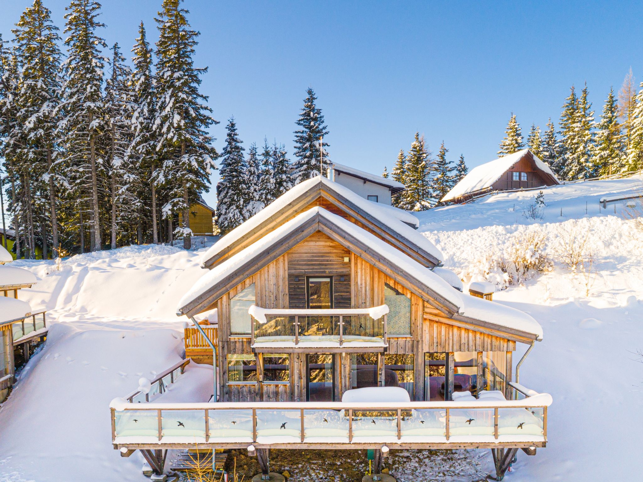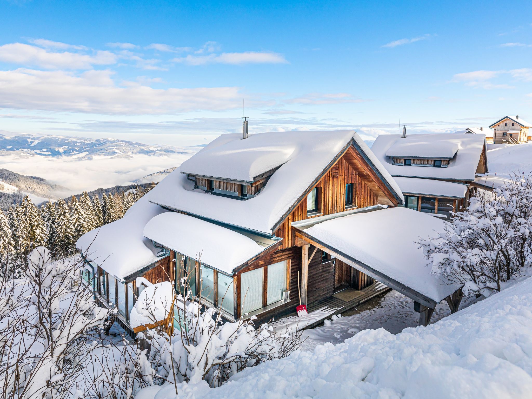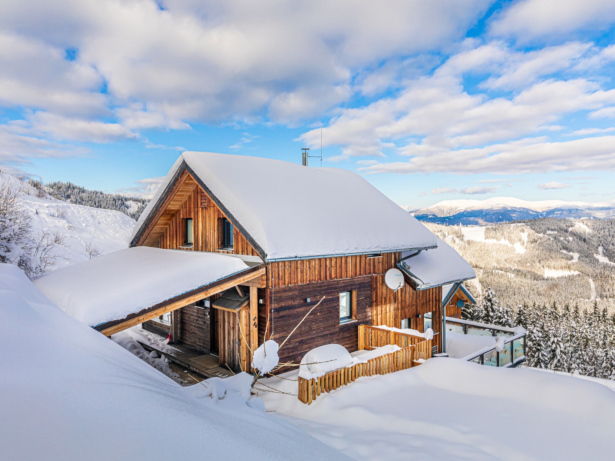 Klippitztörl: Grosses, luxuriöses Chalet "Panoramo", 1'600 m.ü.M., auf 4 Stockwerken. Im Ortsteil Kliening, sonnige Lage am Hang, 600 m vom Skigebiet. Zur Alleinbenutzung: naturbelassenes Grundstück. Im Hause: Wireless LAN, Sauna, Infrarotwärmekabine, Sonnenterrasse, Skiraum, Waschmaschine, Wäschetrockner, Skischuhtrockner. Holprige Zufahrt bis zum Haus (1 km Naturweg). Im Winter bitte Schneeketten mitbringen. Parkplatz (für 2 Autos, überdacht) beim Haus. Lebensmittelgeschäft 15 km, Restaurant 1 km, See Längssee 35 km. Wanderwege ab Haus 10 m, Sessellift 600 m, Skipisten, Skiverleih 300 m, Skischule 2 km, Schlittelbahn 2 km. Nahe gelegene Sehenswürdigkeiten: Sommerrodelbahn Klippitztörl 2 km, Klettergarten 2 km. Bekannte Seen in der Umgebung sind gut erreichbar: Längssee 35 km, Klopeinersee 60 km. Wandergebiete: Koralm, Saualm, Lavantaler Alpen. Bitte beachten: Fahrzeug empfohlen. Bei guter Schneelage Zufahrt mit den Skiern bis zum Haus. Selbstbedienungsautomat für Verpflegung und Dinge des täglichen Bedarfs in 500m. Laut Auskunft des Providers kann der WLAN-Empfang aufgrund der geografischen Lage am Berg nicht durchgehend gewährleistet werden und ist stark witterungsabhängig.