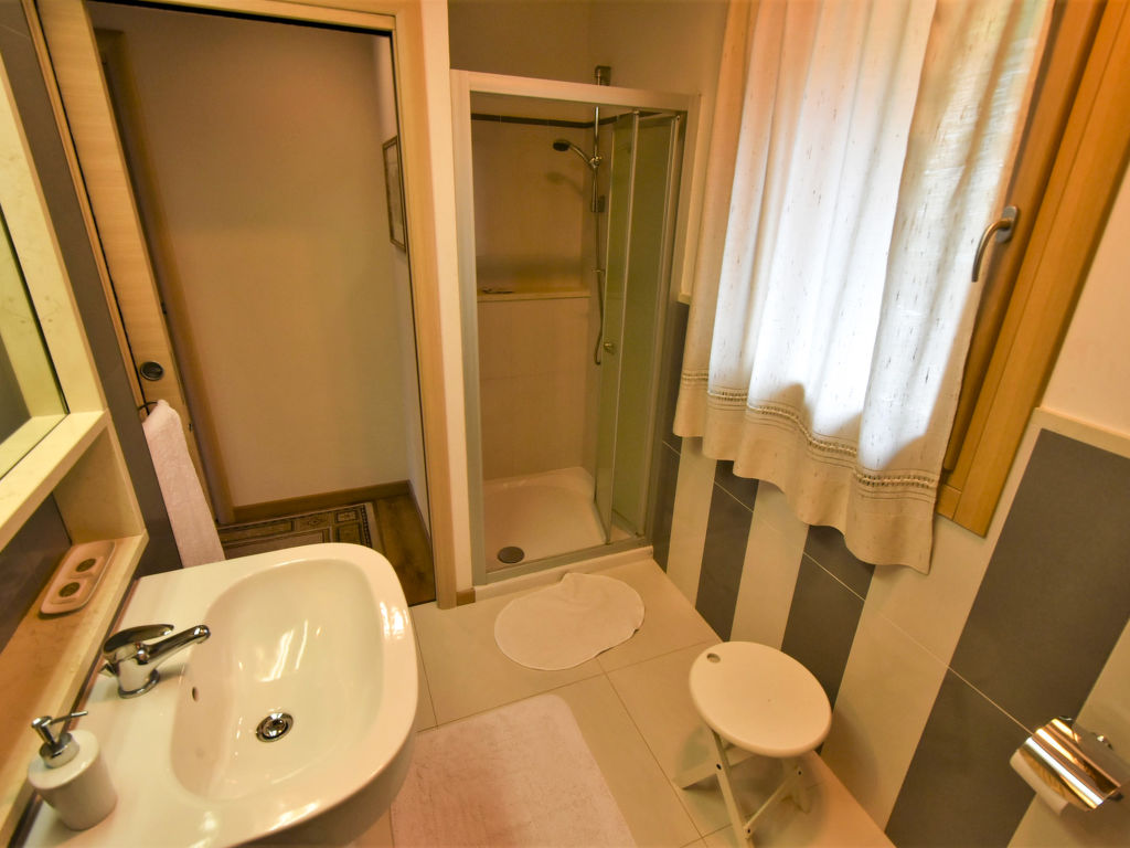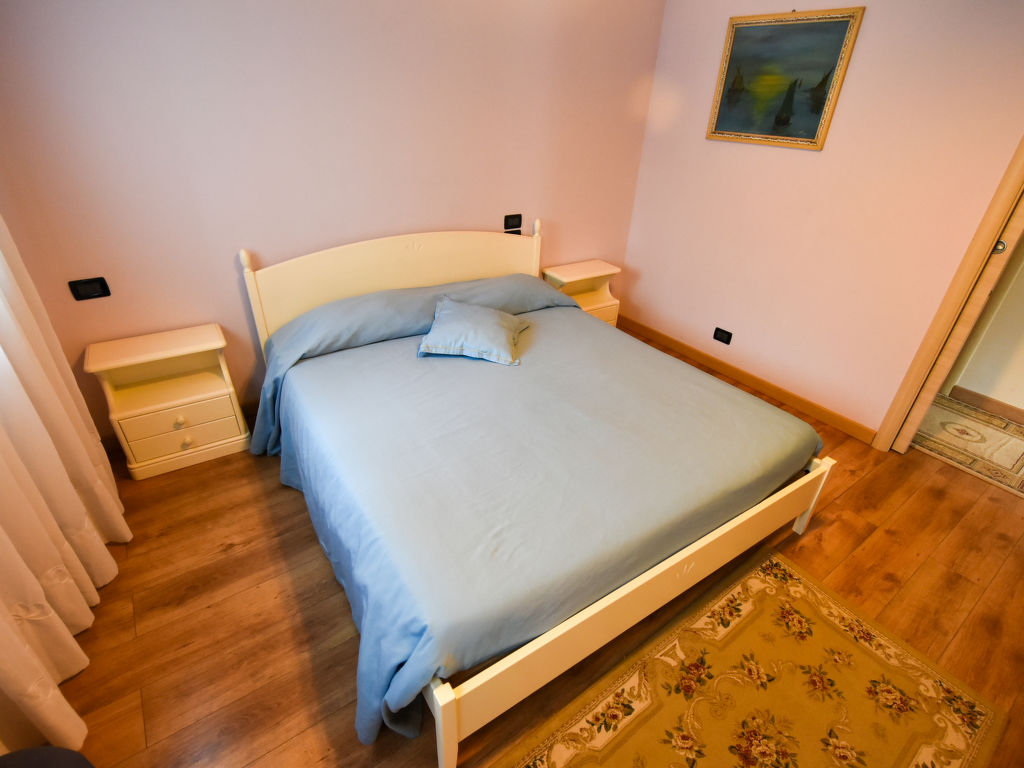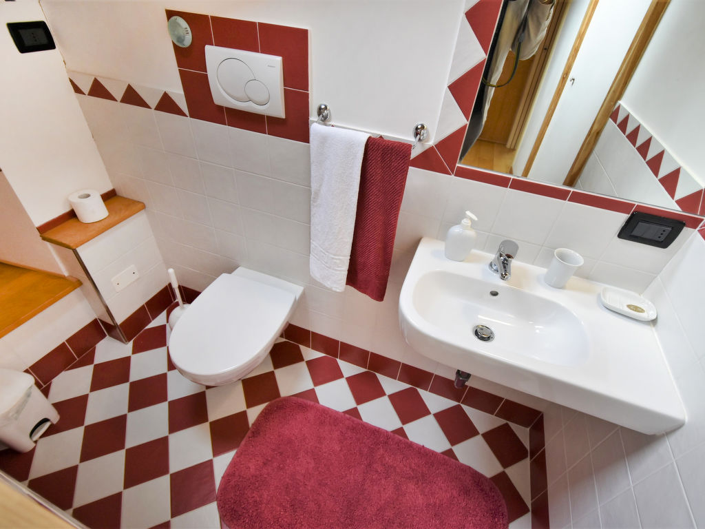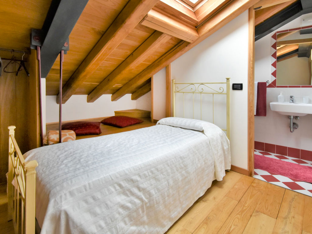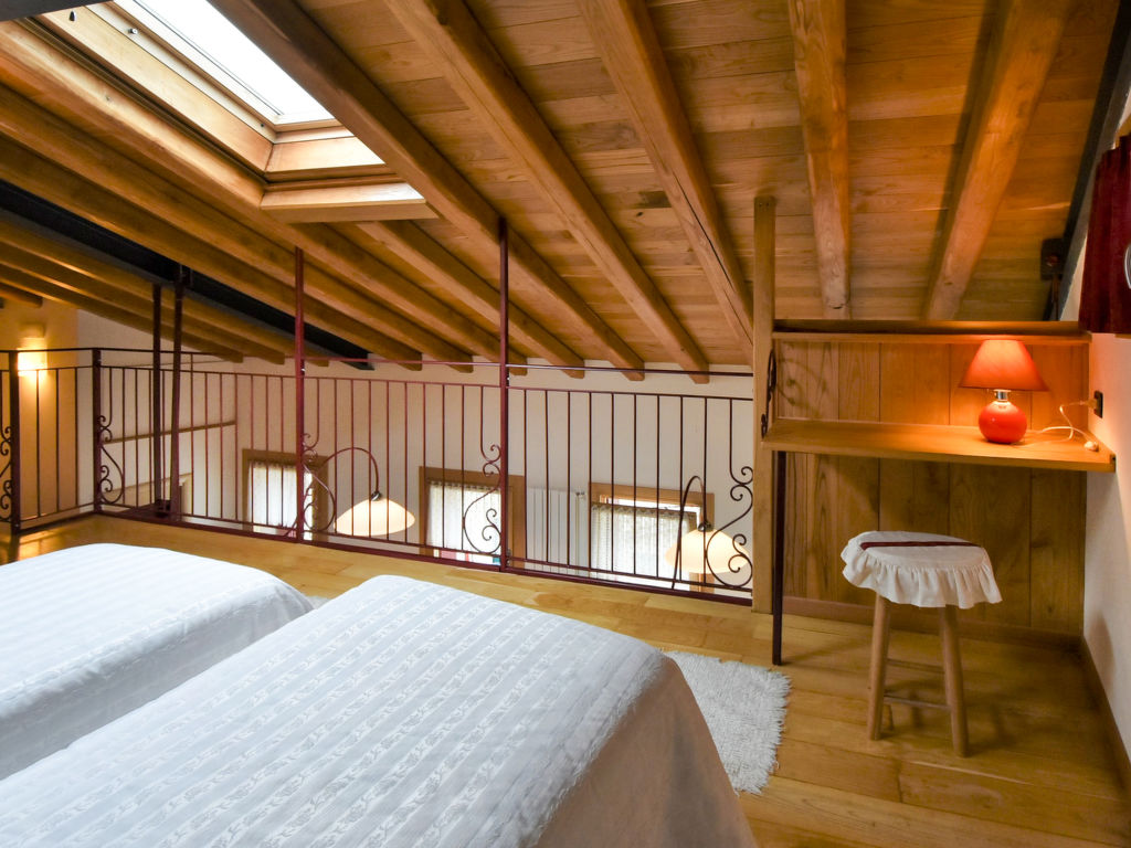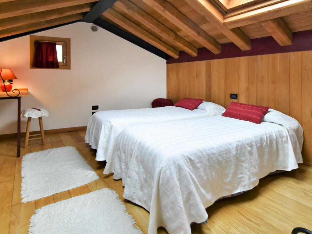 "Gustet Quadri 5", 4-Zimmer-Wohnung 80 m2 auf 2 Stockwerken im 1. Stock. Geräumig und hell, teilweise abgeschrägt, zweckmässig und komfortabel eingerichtet: grosses Wohn-/Esszimmer mit Esstisch und TV (Flachbildschirm). Ausgang zum Garten. 1 Doppelzimmer. Kochnische (4 Flammen, Toaster, Wasserkocher, Mikrowelle, Tiefkühler). Dusche/Bidet/WC. Obergeschoss: offene Galerie mit Dachfenster mit 2 Betten. 1 abgeschrägtes Zimmer mit Dachfenster mit 1 Bett und sep. WC. Heizung, Klimaanlage (extra). Parkettböden. Terrassenmöbel, Liegestühle. Zur Verfügung: Waschmaschine, Haartrockner. Internet (Wireless LAN, gratis). Bitte beachten: Nichtraucher-Haus. CIR: M0260420010