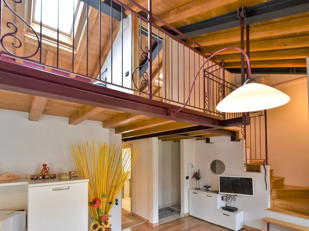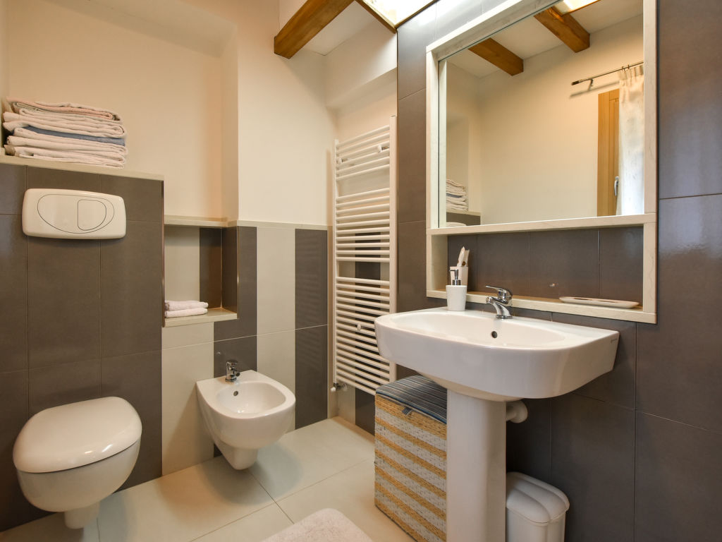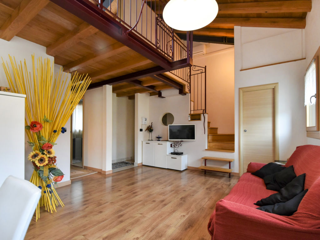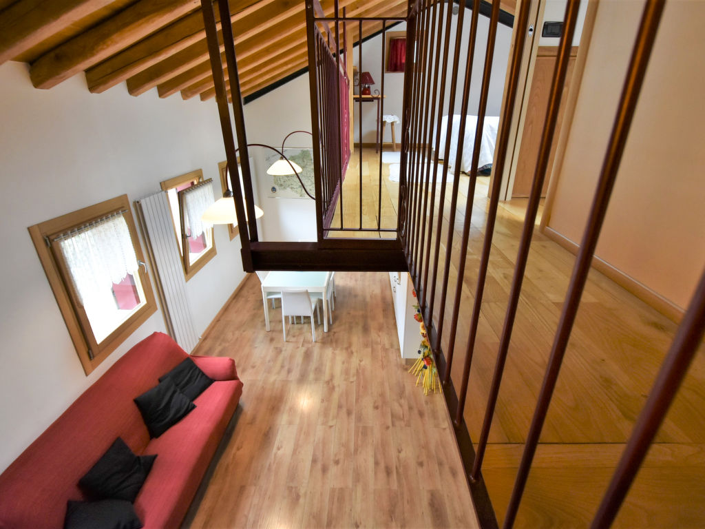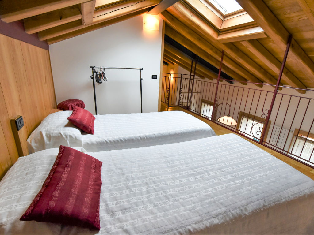 "Gustet Quadri 5", 4-Zimmer-Wohnung 80 m2 auf 2 Stockwerken im 1. Stock. Geräumig und hell, teilweise abgeschrägt, zweckmässig und komfortabel eingerichtet: grosses Wohn-/Esszimmer mit Esstisch und TV (Flachbildschirm). Ausgang zum Garten. 1 Doppelzimmer. Kochnische (4 Flammen, Toaster, Wasserkocher, Mikrowelle, Tiefkühler). Dusche/Bidet/WC. Obergeschoss: offene Galerie mit Dachfenster mit 2 Betten. 1 abgeschrägtes Zimmer mit Dachfenster mit 1 Bett und sep. WC. Heizung, Klimaanlage (extra). Parkettböden. Terrassenmöbel, Liegestühle. Zur Verfügung: Waschmaschine, Haartrockner. Internet (Wireless LAN, gratis). Bitte beachten: Nichtraucher-Haus. CIR: M0260420010
