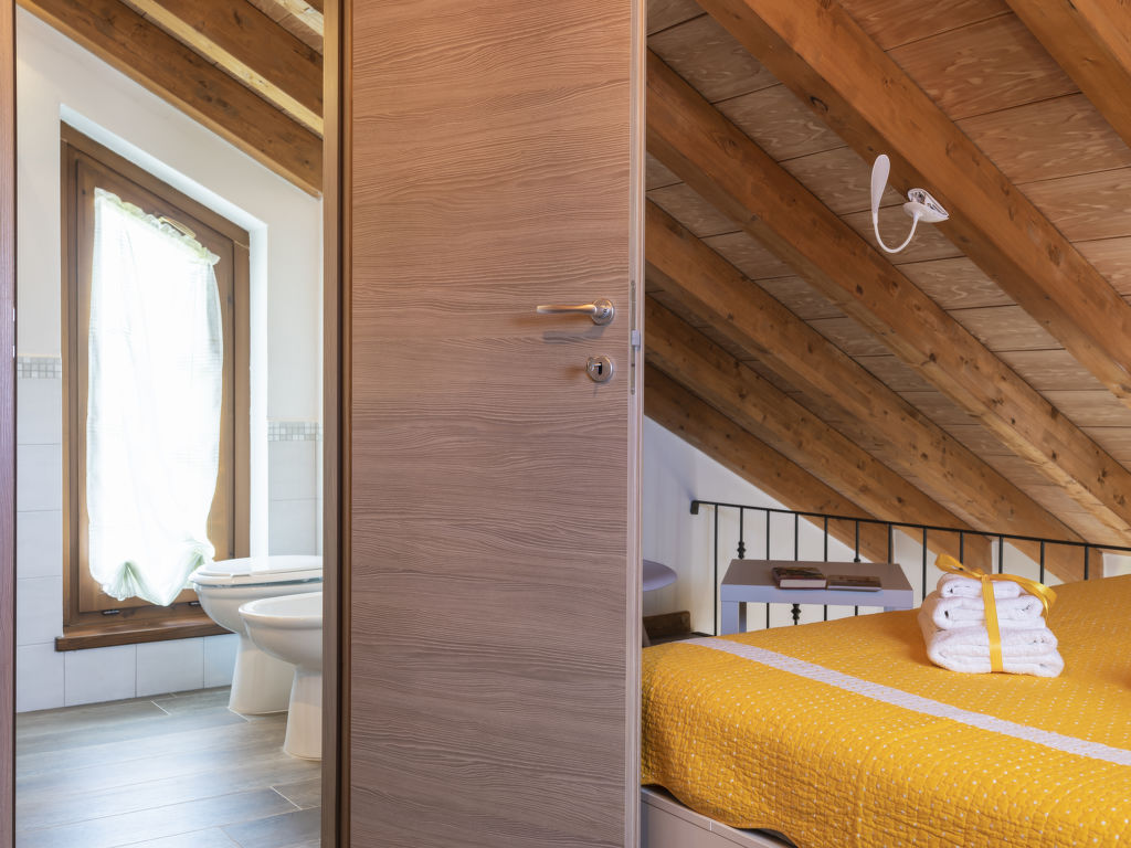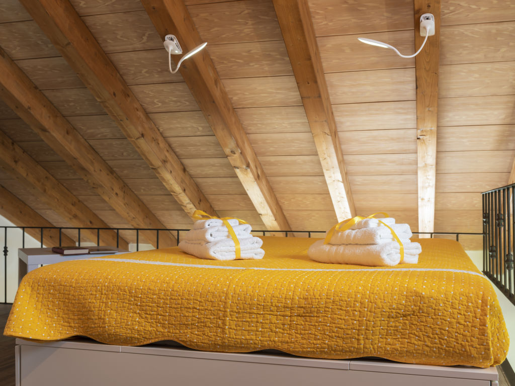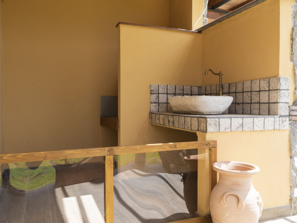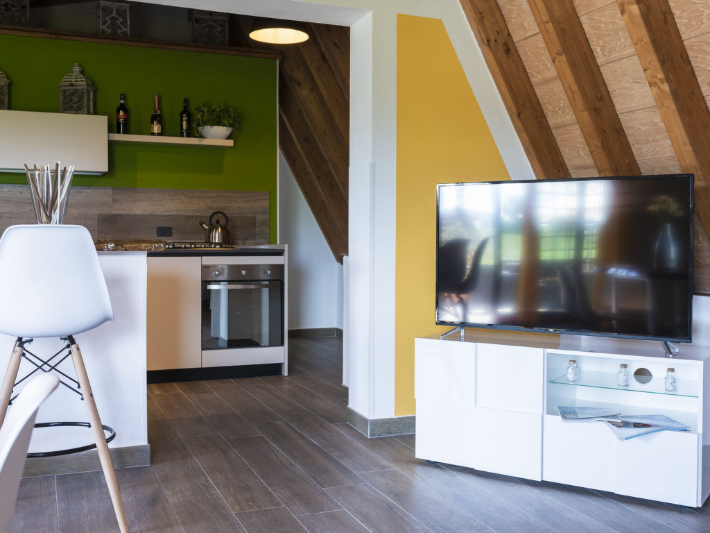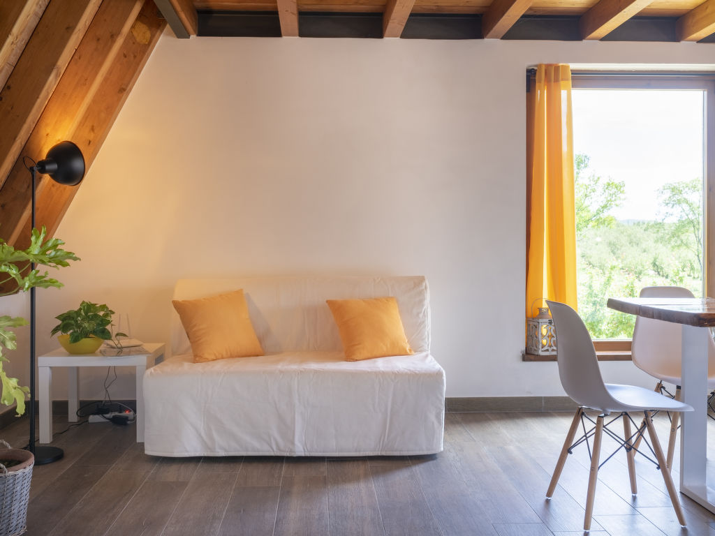 "Melograno", 2-Zimmer-Chalet 60 m2 auf 2 Stockwerken, im erhöhten Erdgeschoss. Modern und stilvoll eingerichtet: offenes Wohn-/Esszimmer mit 1 Doppeldiwanbett und TV (Flachbildschirm). Ausgang zur Terrasse. Offene Küche (Backofen, Geschirrspüler, 4 Flammen, Toaster, Tiefkühler, elektrische Kaffeemaschine). Ausgang zur Terrasse. Sep. WC. E-Heizung, Klimaanlage. Obergeschoss: abgeschrägte, offene Galerie mit 1 Doppelbett (140 cm). Dusche/Bidet/WC. Terrasse 45 m2. Terrassenmöbel. Schöne, auf die Landschaft. Zur Verfügung: Internet (Wireless LAN).