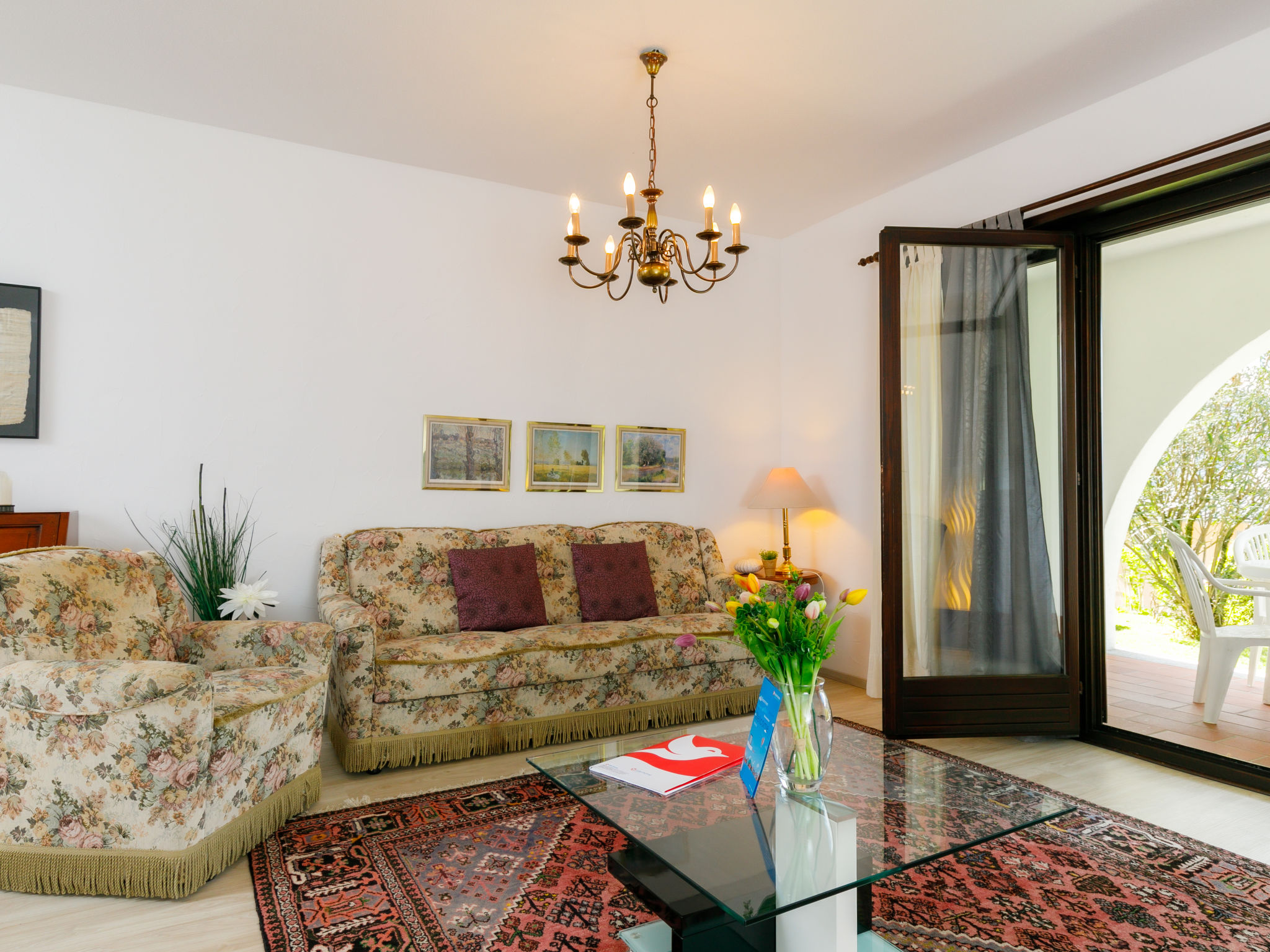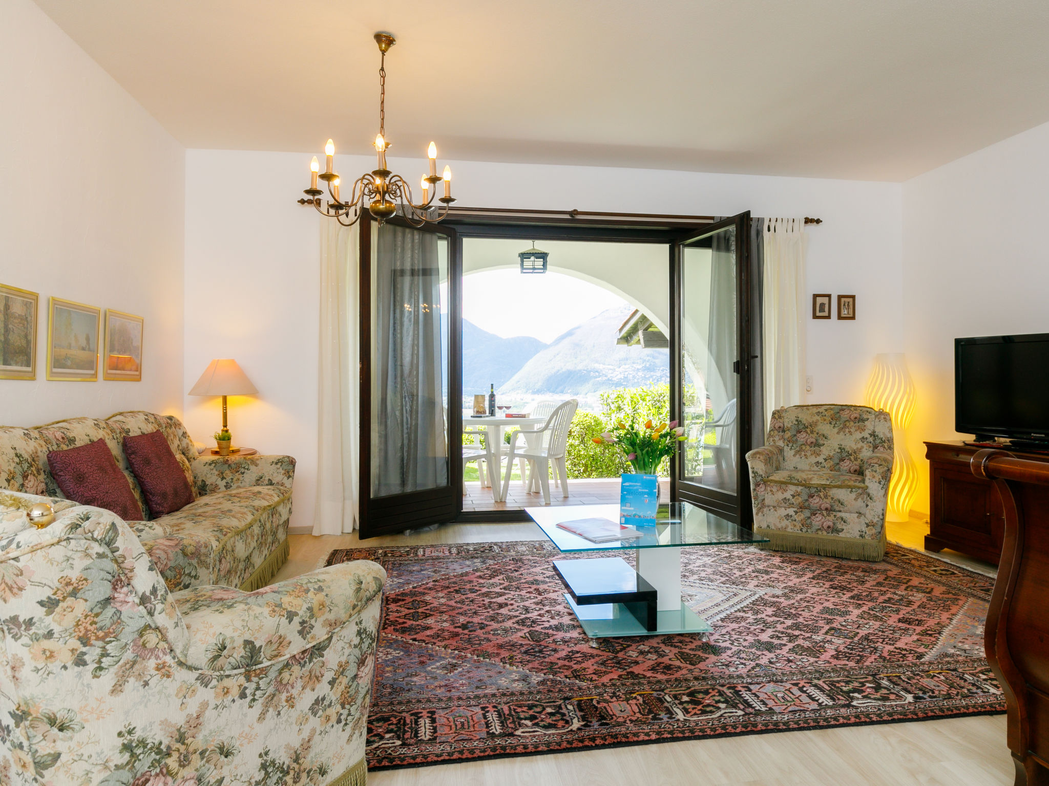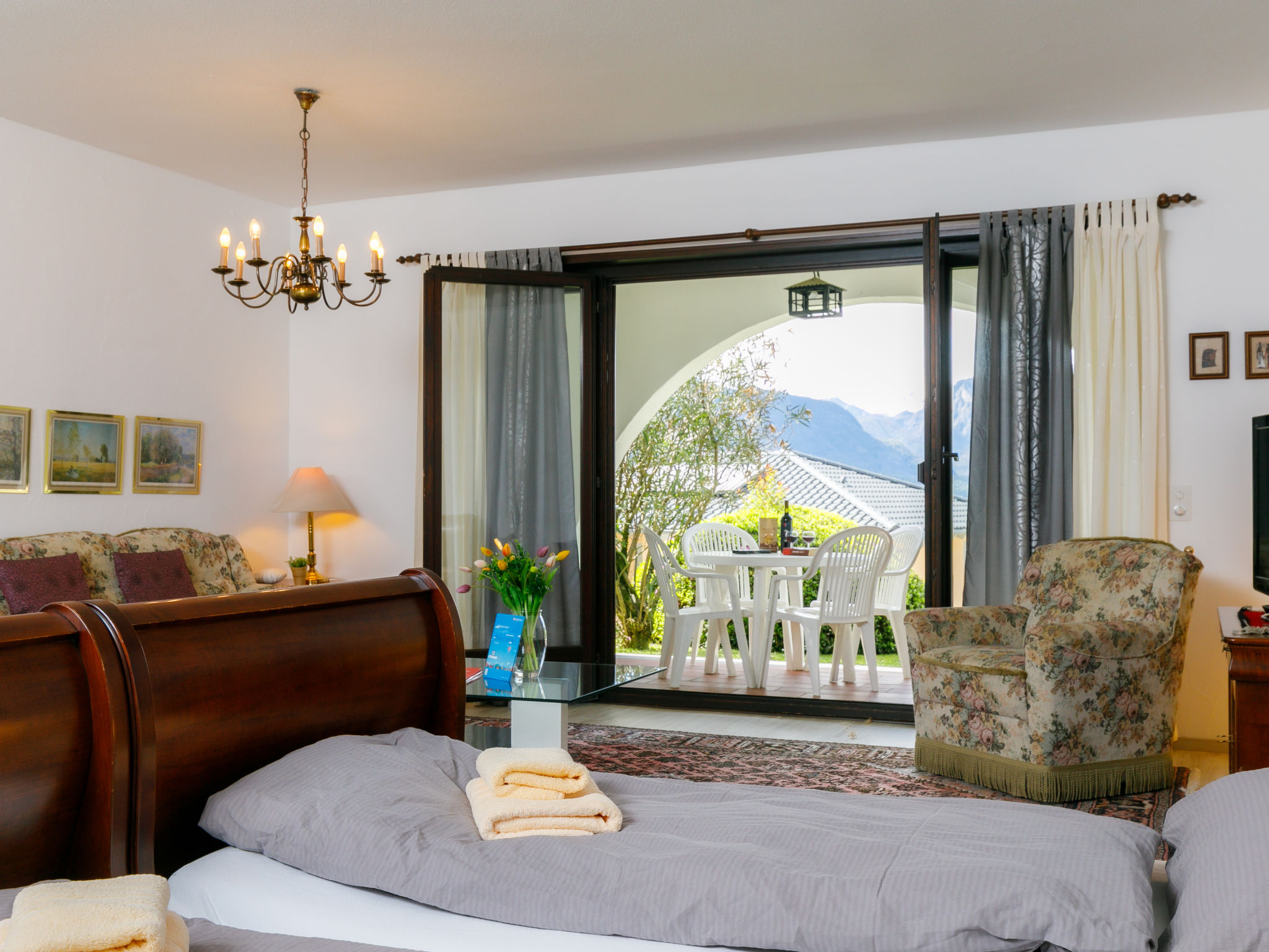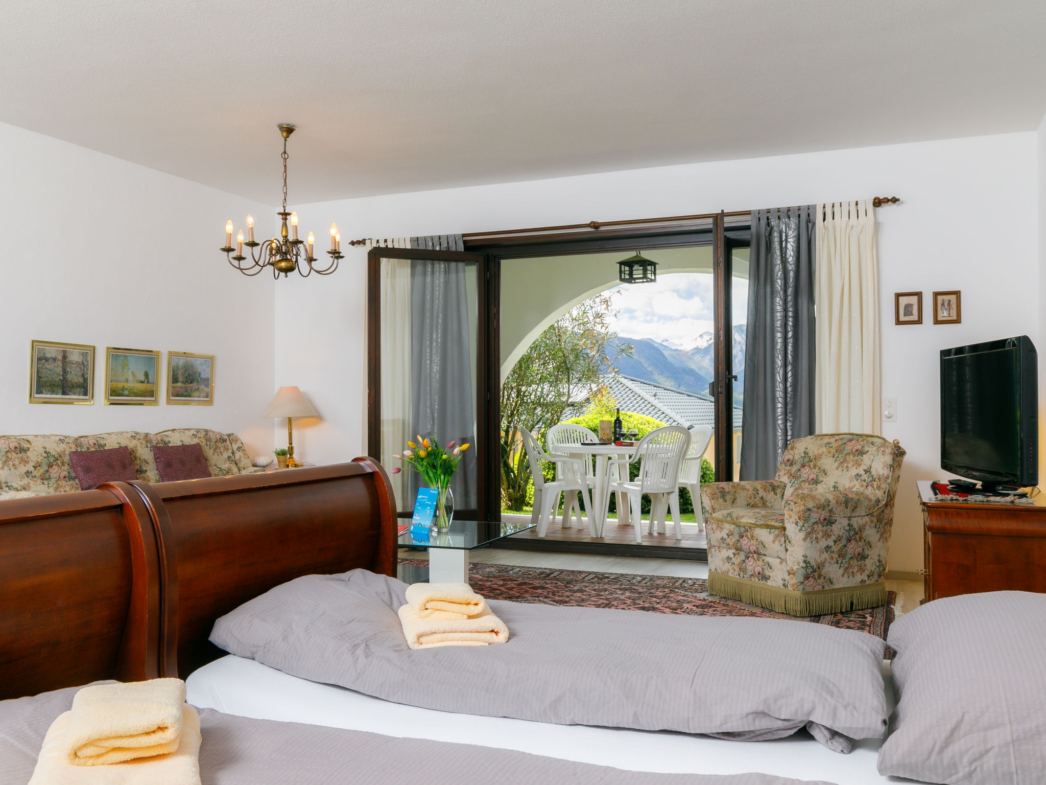 "Appartment 23", 1-Zimmer-Wohnung 65 m2, im Erdgeschoss, Südwestlage. Geräumig, komfortabel und rustikal eingerichtet: offenes Wohn-/Schlafzimmer mit 2 Betten (90 cm, Länge 200 cm), Kabel-TV, Flachbildschirm und Radio. Ausgang zur Terrasse. Kleine, offene Küche im Eingang (4 Kochplatten, Backofen). Bad/WC. Gartensitzplatz teilweise überdacht, Westlage und Südlage. Terrassenmöbel, Liegestühle (2). Sehr schöne Sicht auf den See, die Berge und die Landschaft. Zur Verfügung: Internet (Wireless LAN, gratis). Bitte beachten: Nichtraucher-Unterkunft.