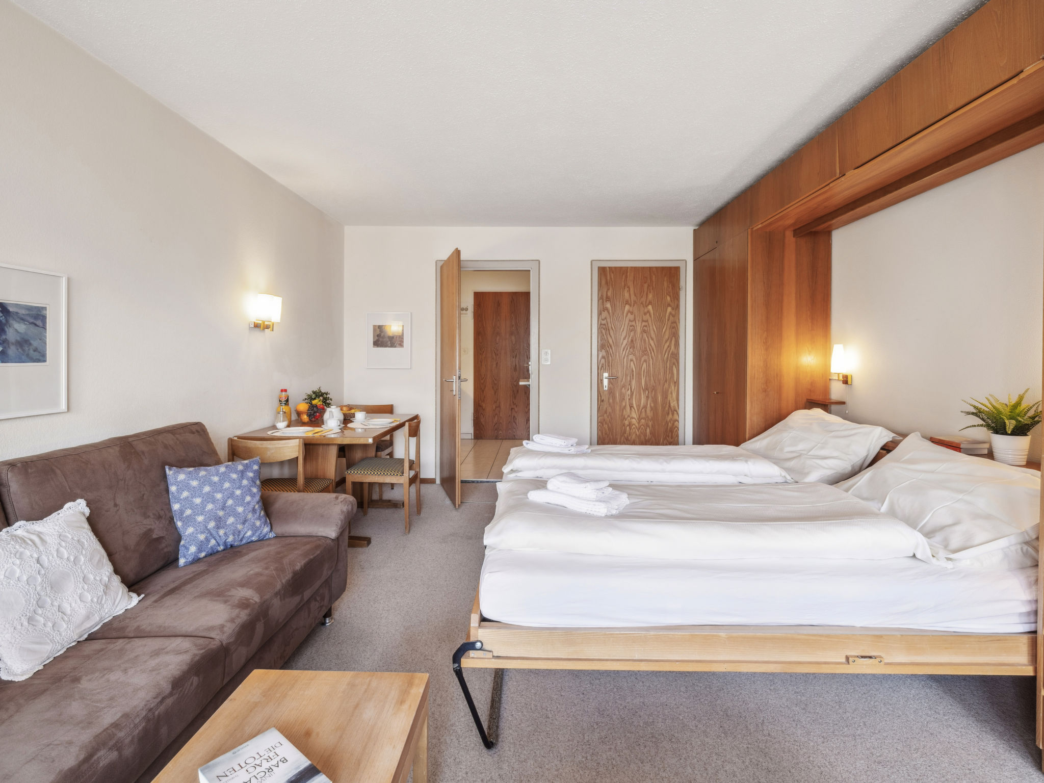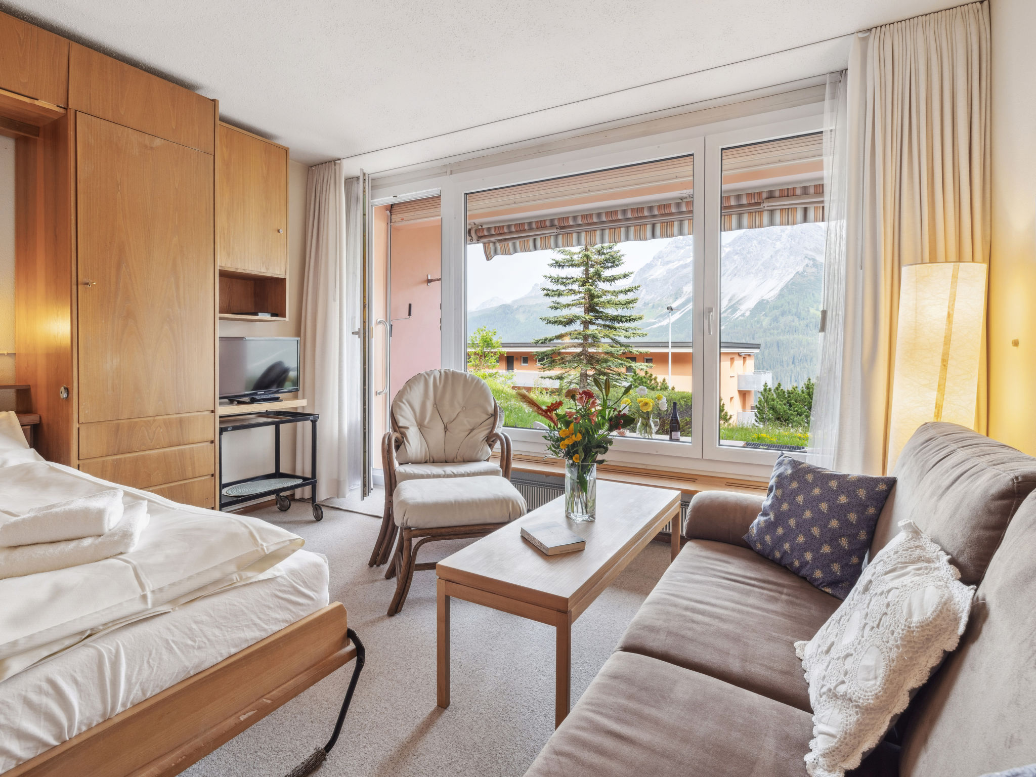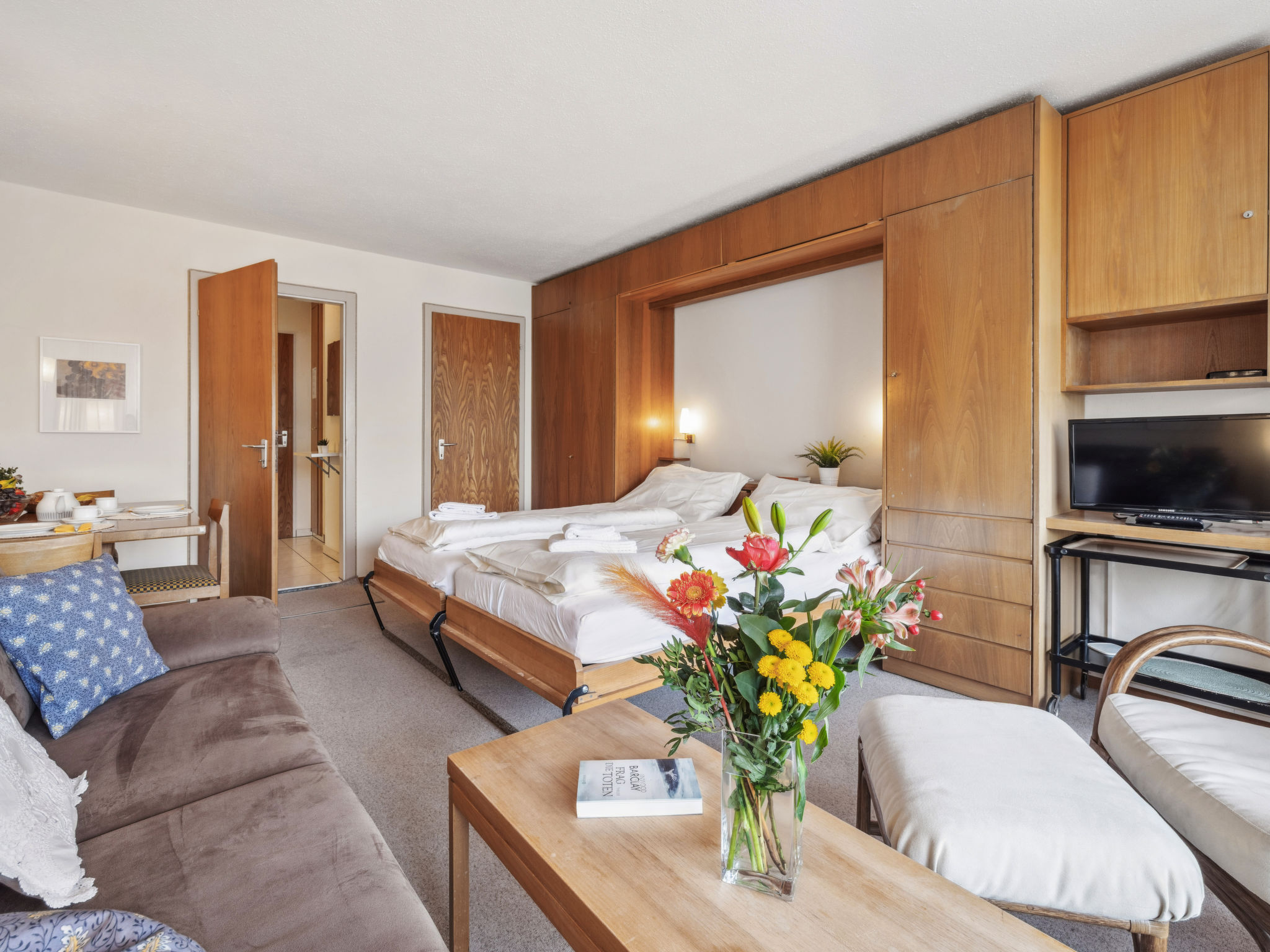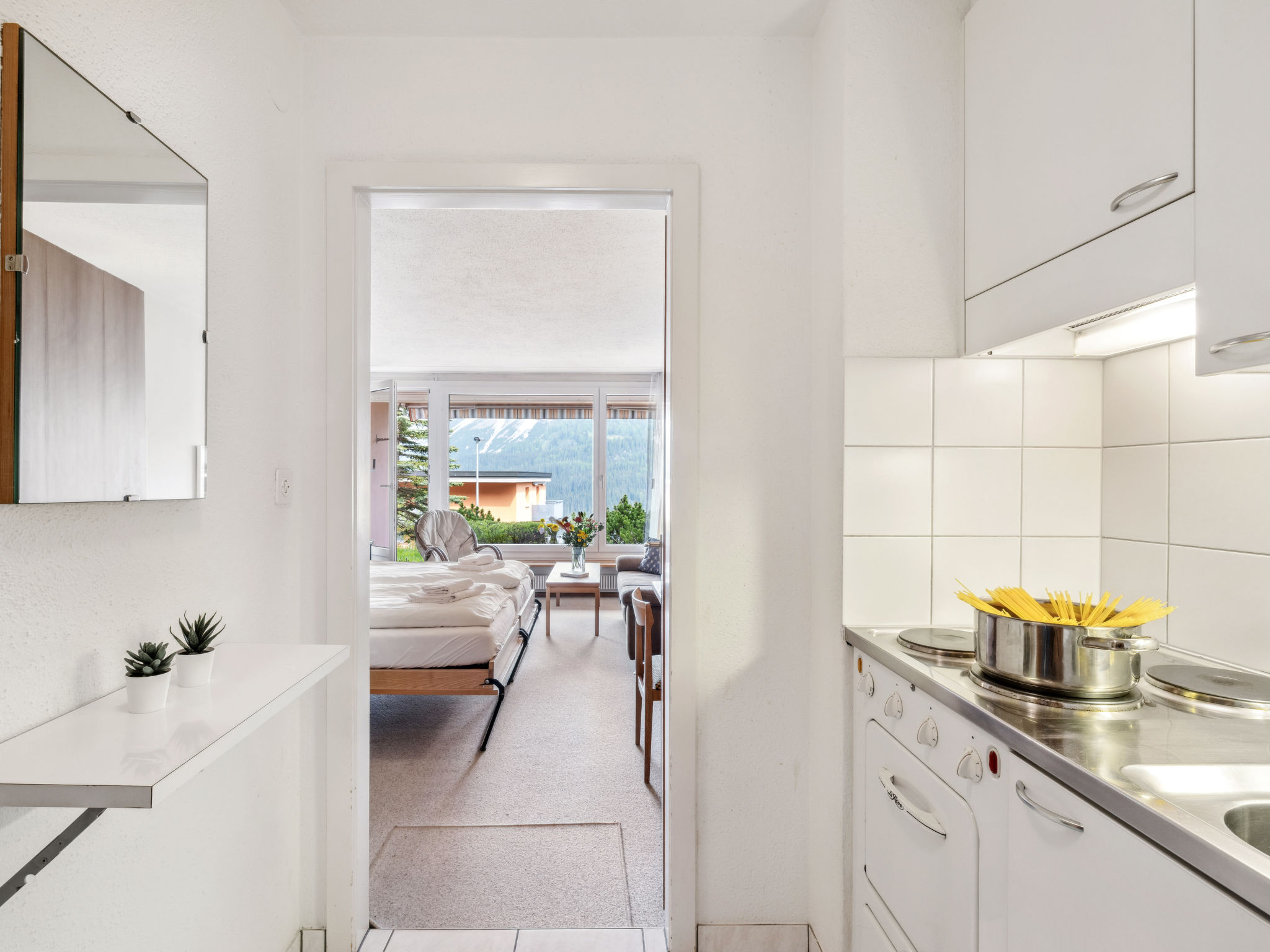 1-Zimmer-Wohnung 28 m2, im Erdgeschoss, Ostlage. Gemütlich eingerichtet: Wohn-/Esszimmer mit 2 Wandschrankbetten und Sat-TV (Flachbildschirm). Ausgang zum Gartensitzplatz. Kochnische (3 Kochplatten, Backofen). Dusche/WC. Gartensitzplatz. Terrassenmöbel. Schöne Sicht auf die Berge, die Landschaft und die Ortschaft. Zur Verfügung: Internet (Wireless LAN, gratis). Bitte beachten: Nichtraucher-Unterkunft.