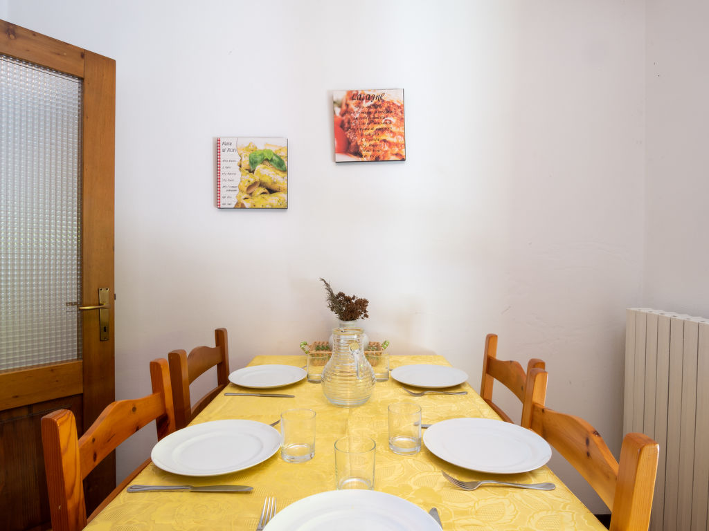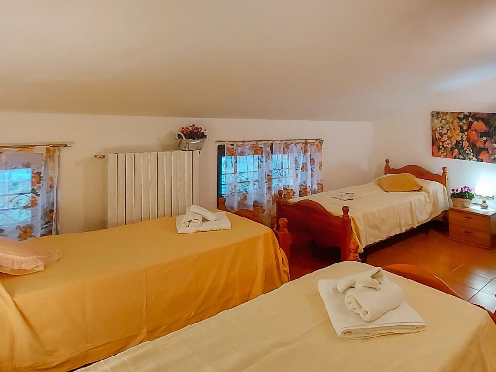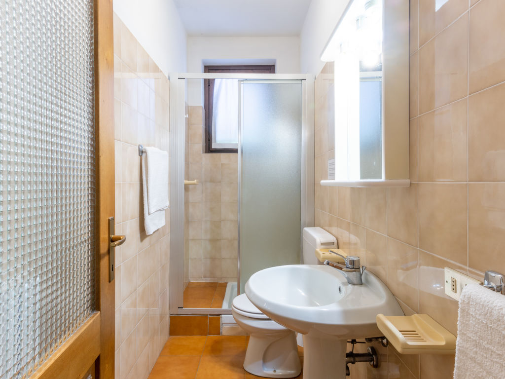 3-Zimmer-Haushälfte, 2 Etagen, ca. 100 m². Erdgeschoss (zum Tal 1. Etage): Wohnraum mit Sitzgruppe, Essplatz und Balkonausgang. Küche (4 Flammen, Backofen, Mikrowelle, Geschirrspüler, Kühlschrank, Kaffeemaschine) mit Essplatz und Terrassenausgang. Dusche/WC. Vom Wohnraum Treppe ins Dachgeschoss: Schlafzimmer mit franz. Bett (1,60 m breit). Schlafzimmer (Dachschräge) mit 4 Einzelbetten (davon 2 zusammenstellbar). Bad/WC. CIR:097023-CIM-00005