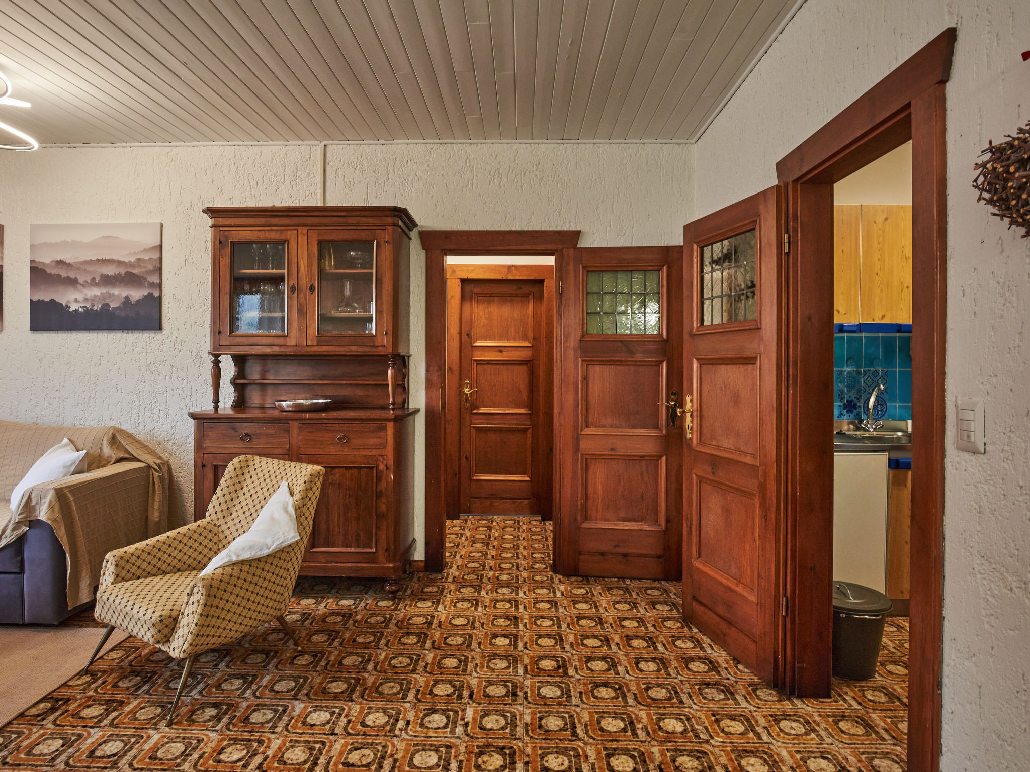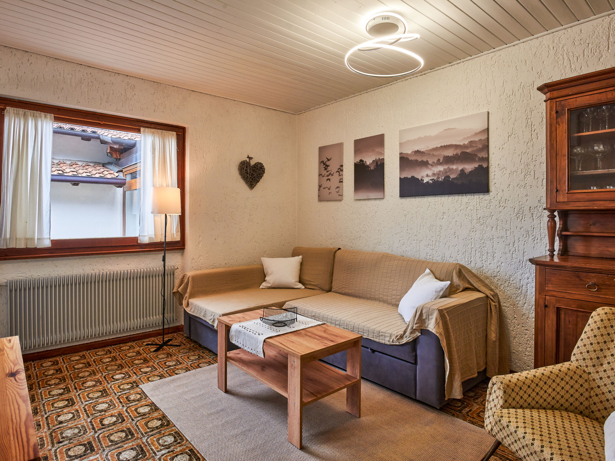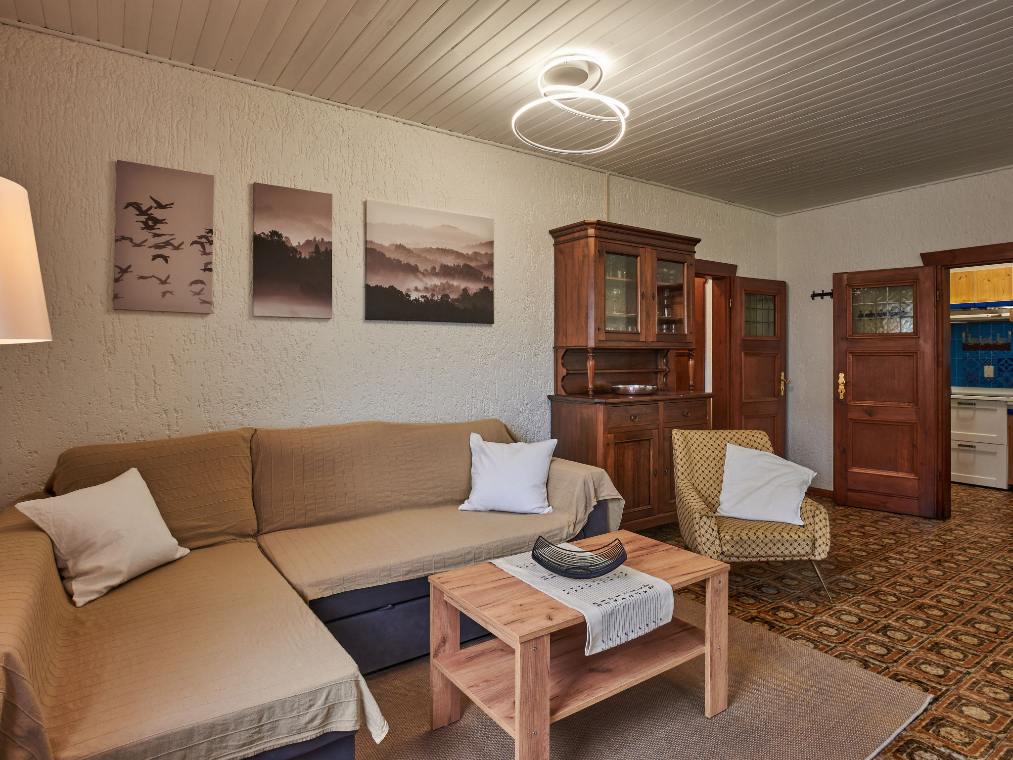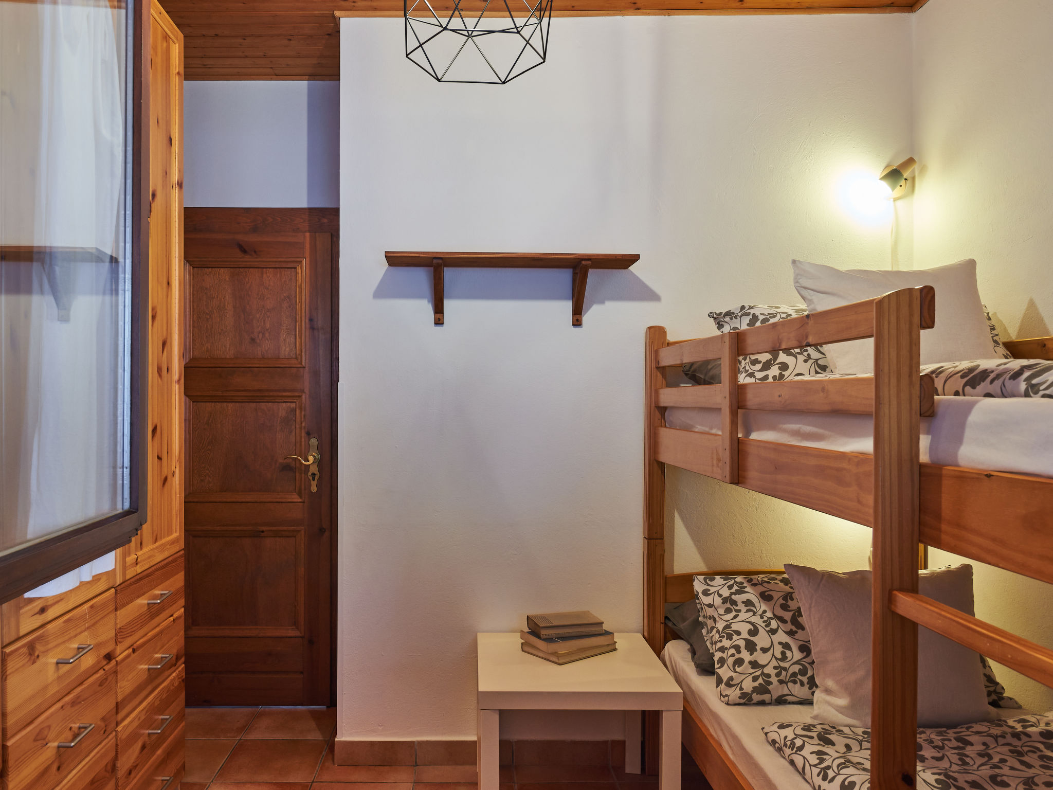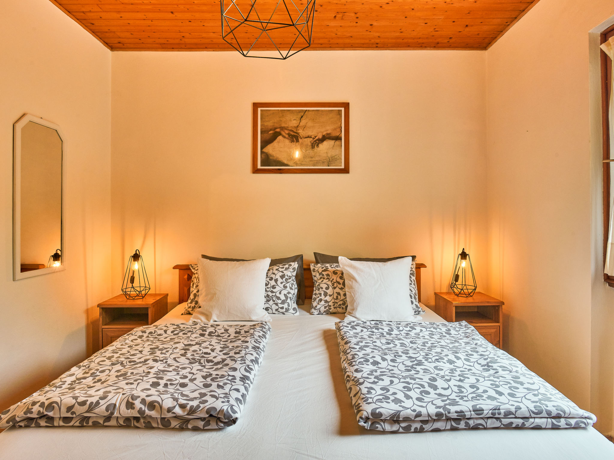 3-Zimmer-Haus 55 m2, im erhöhten Erdgeschoss. Rustikal eingerichtet: Wohn-/Schlafzimmer mit 1 Diwanbett (140 cm), Esstisch und Sat-TV. Ausgang zur Terrasse. 1 Doppelzimmer. 1 Zimmer mit 1 x 2 Etagenbetten. Kleine Küche (4 Induktionskochplatten, Toaster, Wasserkocher, elektrische Kaffeemaschine). Dusche/Bidet/WC. Ölheizung (extra). Terrasse überdacht. Terrassenmöbel, Liegestühle (2). Fernsicht auf den See. Zur Verfügung: Internet (Wireless LAN, gratis). Bitte beachten: Nichtraucher-Unterkunft. CIR:M0230450258