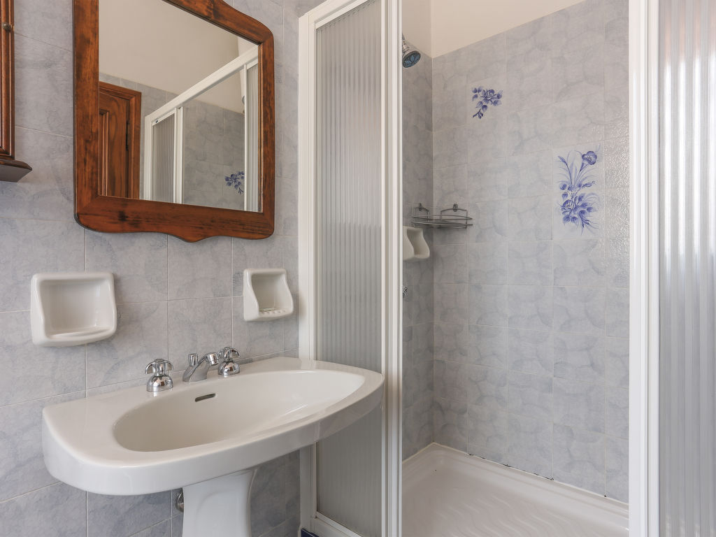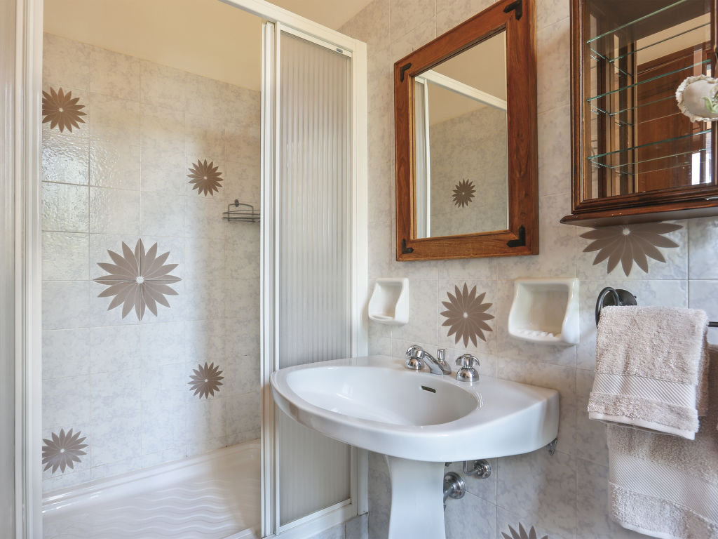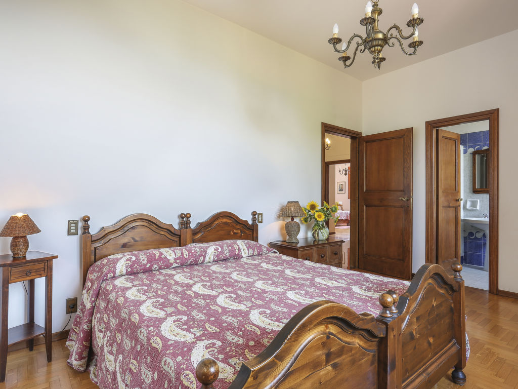 10-Zimmer-Haus, 4 Etagen, ca. 380 m². Haupteingang über Außentreppe in 1. Etage (zum Hang hin Erdgeschoss): Großer Wohnraum mit Sitzgruppen um den an 4 Seiten offenen Kamin, Essplatz, mehrere Ausgänge zur überdachten Loggia (Mobiliar). Küche (5 Flammen, Backofen, Geschirrspüler, Kühlschrank, Kaffeemaschine, Wasserkocher, Toaster) mit Gartenausgang zu Terrasse. Sep.WC. Vom Wohnraum über Innentreppe in 2. Etage: 3 Doppelzimmer (2 davon zusätzlich mit Schlafsessel). Zweibettzimmer. Alle Schlafzimmer mit eigener Dusche/WC. Weiter über Innentreppe in 3. Etage: Im Turmzimmer mit spektakulärem Ausblick (Fensterfront an drei Seiten) Wohnraum mit Sitzgruppe. Von der Eingangsdiele über Innentreppe zum Erdgeschoss: Großer Wohn-/Schlafraum mit Doppelbettcouch, Kochnische mit Panoramafenster und Terrassen-/Gartenausgang. Diele. 2 Doppelzimmer. Zweibettzimmer. 2x Dusche/Bidet/WC. Weiterer Gartenausgang. Hinweis: Bei Buchung zum Preis für 10 Personen bleibt das Erdgeschoss verschlossen. Bei Buchung zum Preis für 8 Personen stehen außerdem die 2 Schlafsessel in der 2. Etage nicht zur Verfügung. Bei Belegung mit weniger Personen als der maximalen Personenzahl steht eine Etage nicht zur Verfügung.