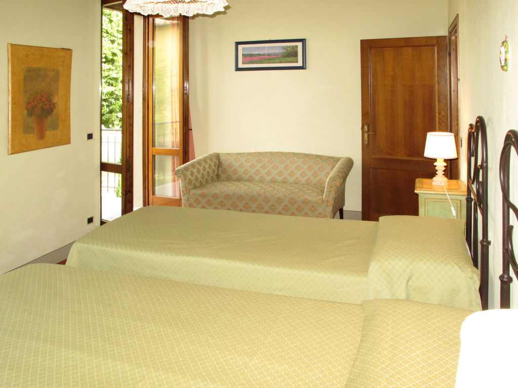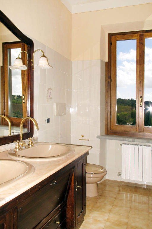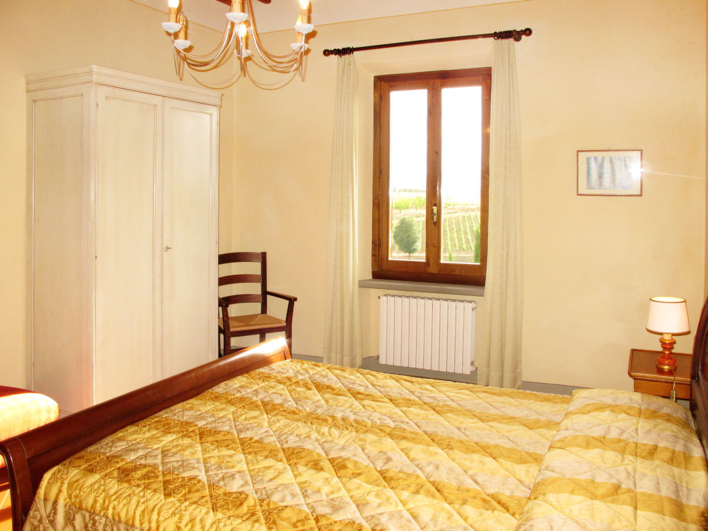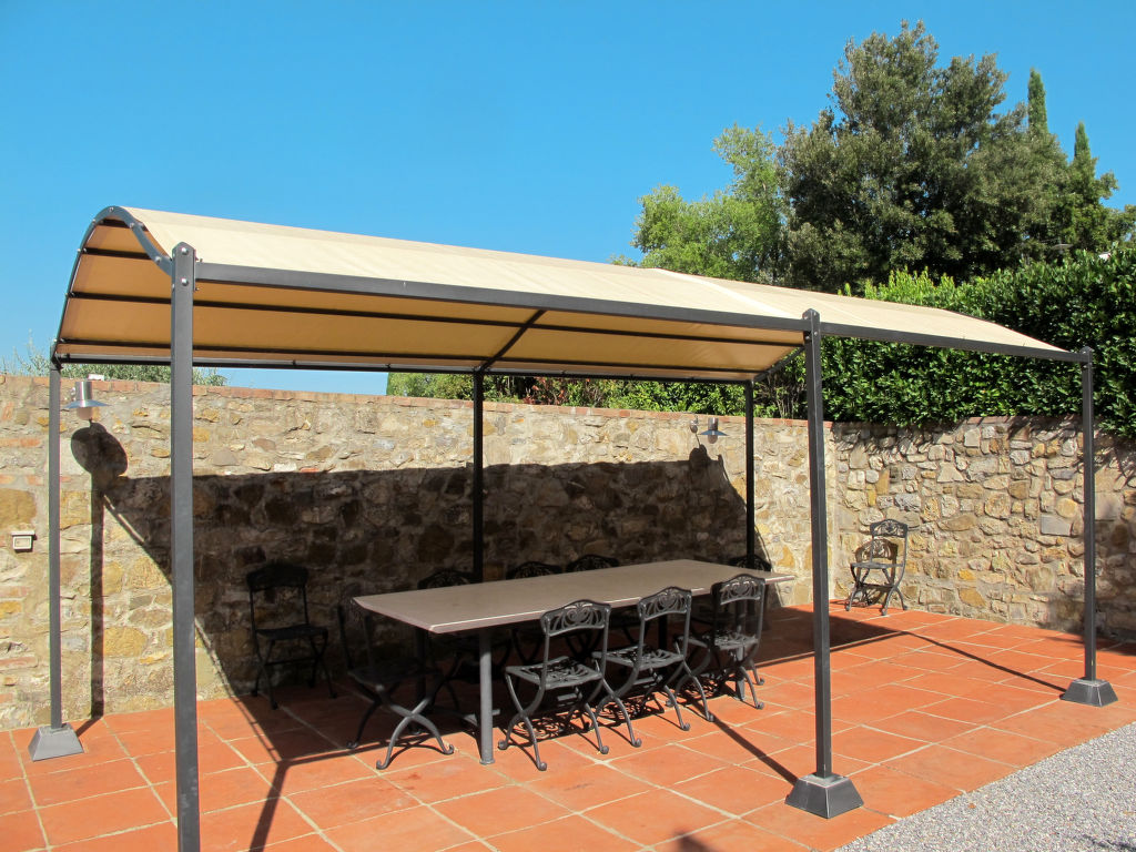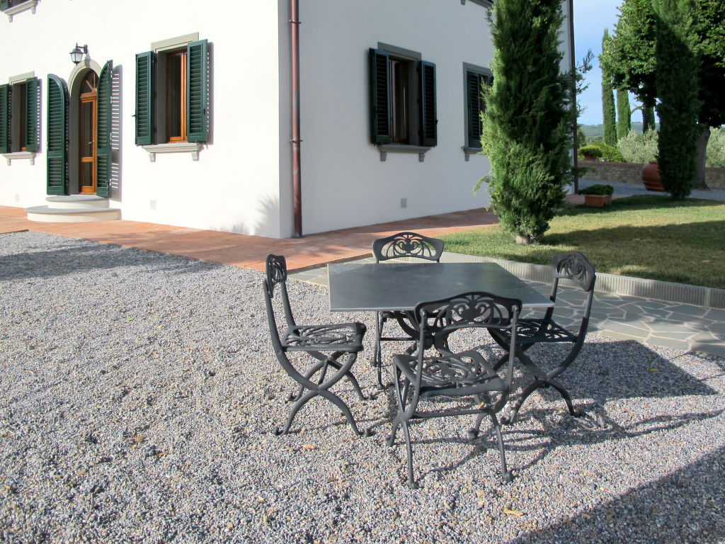 "Le Gallozzole", 7-Zimmer-Villa 200 m2 auf 2 Stockwerken, im Erdgeschoss. Antik und geschmackvoll eingerichtet: Wohnzimmer mit offenem Kamin und Sat-TV. Ausgang zur Terrasse. 1 Zimmer mit 1 franz. Bett (160 cm). Offenes Esszimmer. Küche (Backofen, Geschirrspüler, 5 Flammen, elektrische Kaffeemaschine) mit kleinem Esstisch. Dusche/Bidet/WC, sep. WC. Obergeschoss: 2 Zimmer, jedes Zimmer mit 1 franz. Bett (160 cm). 2 Zimmer, jedes Zimmer mit 2 Betten (80 cm). 2 Duschen/Bidet/WC. G-Heizung. Komfortable Einrichtung im Landhausstil. 2 grosse Terrassen, Laube. Terrassenmöbel, Gartengrill, Liegestühle. Sehr schöne Panoramasicht auf die Landschaft und den Wald. Zur Verfügung: Waschmaschine. Bitte beachten: Nichtraucher-Unterkunft.