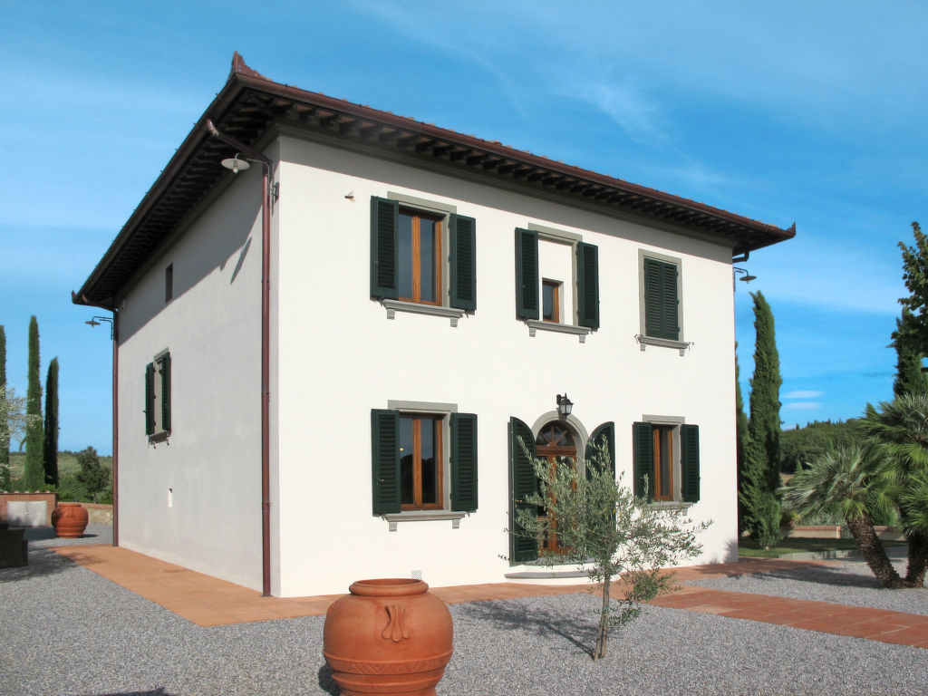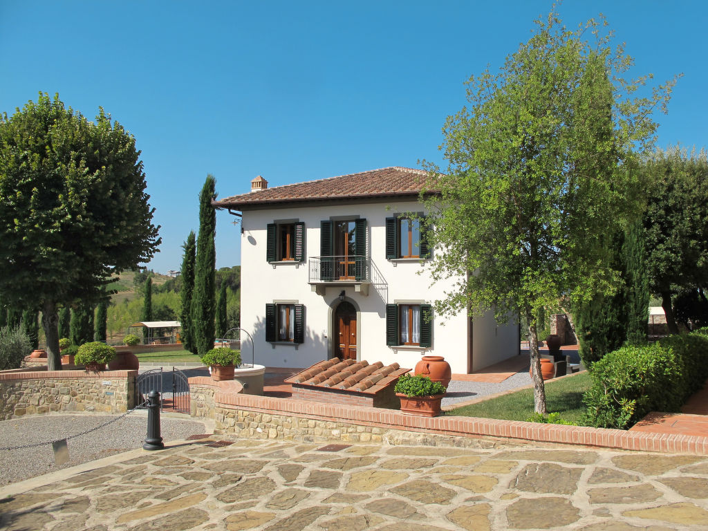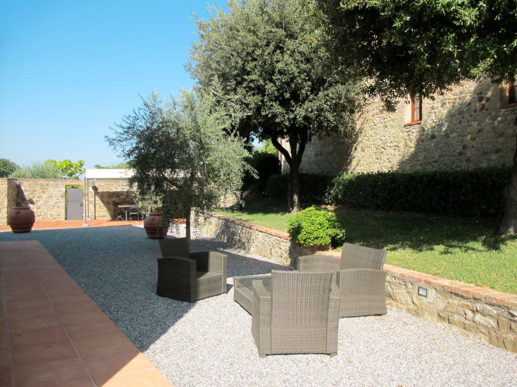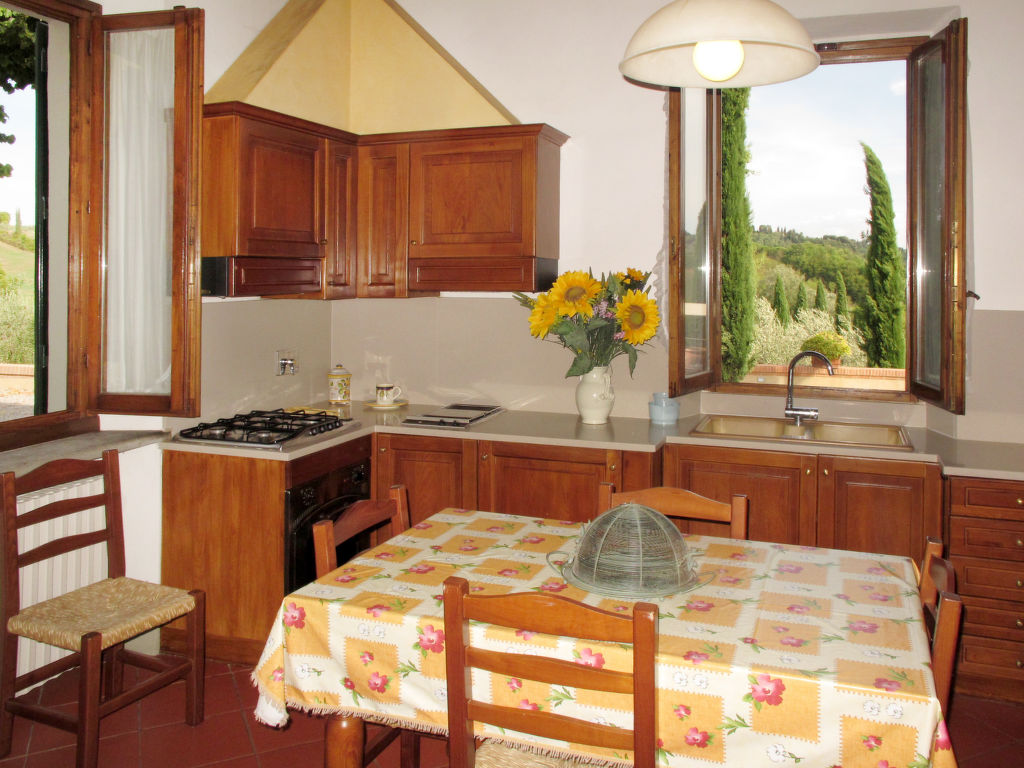 "Le Gallozzole", 7-Zimmer-Villa 200 m2 auf 2 Stockwerken, im Erdgeschoss. Antik und geschmackvoll eingerichtet: Wohnzimmer mit offenem Kamin und Sat-TV. Ausgang zur Terrasse. 1 Zimmer mit 1 franz. Bett (160 cm). Offenes Esszimmer. Küche (Backofen, Geschirrspüler, 5 Flammen, elektrische Kaffeemaschine) mit kleinem Esstisch. Dusche/Bidet/WC, sep. WC. Obergeschoss: 2 Zimmer, jedes Zimmer mit 1 franz. Bett (160 cm). 2 Zimmer, jedes Zimmer mit 2 Betten (80 cm). 2 Duschen/Bidet/WC. G-Heizung. Komfortable Einrichtung im Landhausstil. 2 grosse Terrassen, Laube. Terrassenmöbel, Gartengrill, Liegestühle. Sehr schöne Panoramasicht auf die Landschaft und den Wald. Zur Verfügung: Waschmaschine. Bitte beachten: Nichtraucher-Unterkunft.