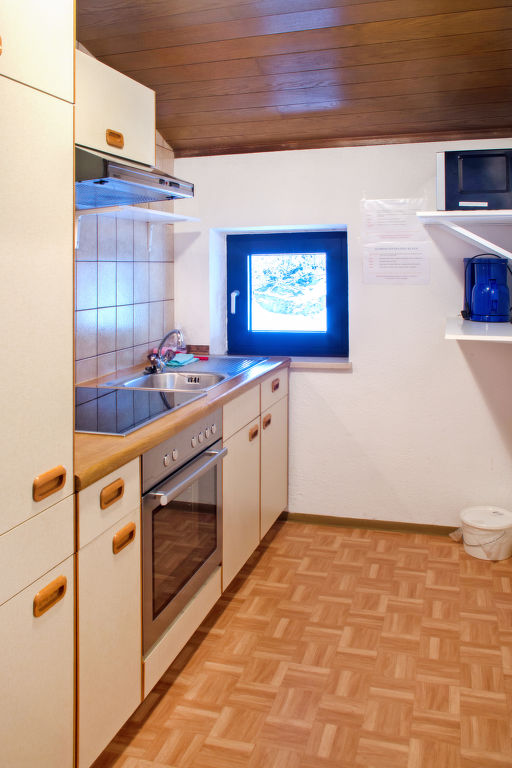 3-Zimmer-Wohnung, 3. Etage, ca. 40 m². Eingang in Esszimmer. Küche (4 Ceranfelder, Backofen, Mikrowelle, Kühlschrank, Kaffeemaschine, Wasserkocher, Toaster). 2 Doppelzimmer (eines davon mit Dachschräge) mit Waschbecken. Dusche/WC. Nebenkosten am Ort € 18 pro Person und Aufenthalt (je nach Belegung) plus Kurtaxe. Wäsche vorhanden. Kaution € 150 (in bar). Haustier nicht erlaubt.