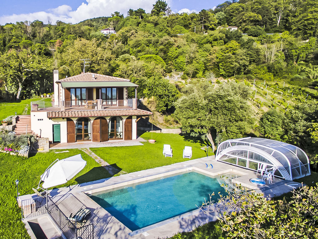 5-Zimmer-Villa 170 m2 auf 2 Stockwerken. Geräumig, schön und geschmackvoll eingerichtet: grosses Wohn-/Esszimmer mit offenem Kamin und Esstisch. Ausgang zum Garten, zum Schwimmbad. 1 Doppelzimmer. Ausgang zum Garten. 1 Zimmer mit 1 Bett und 1 Ausziehbett. Dusche/Bidet/WC, sep. WC. Obergeschoss: Wohn-/Esszimmer mit Panoramafenster mit TV (Flachbildschirm). Ausgang zur Terrasse. 1 Doppelzimmer. Kochnische (4 Kochplatten, Backofen, Geschirrspüler, Mikrowelle). Dusche/Bidet/WC, Hydromassage-Dusche. Grosse Terrasse teilweise überdacht. Terrassenmöbel. Panoramasicht auf das Meer und das Tal. Zur Verfügung: Waschmaschine, Haartrockner. Internet (Wireless LAN, gratis). 1 Haustier/Hund erlaubt.