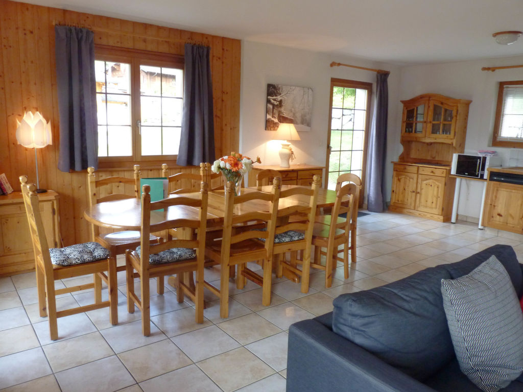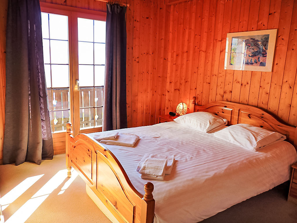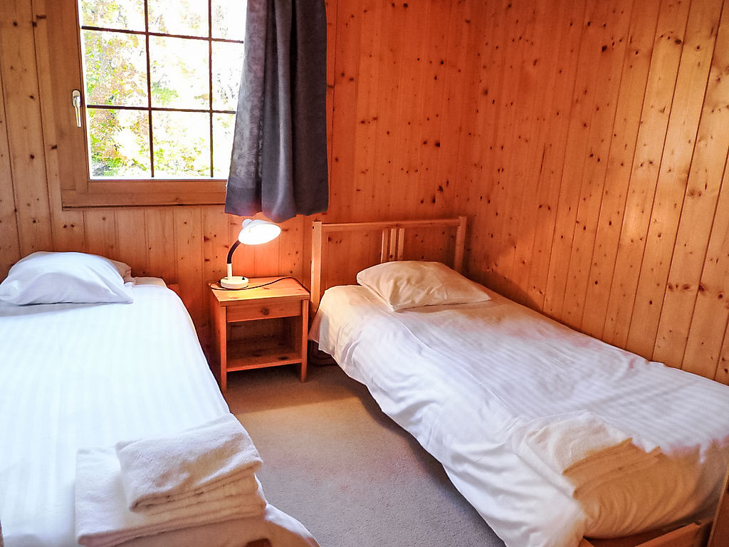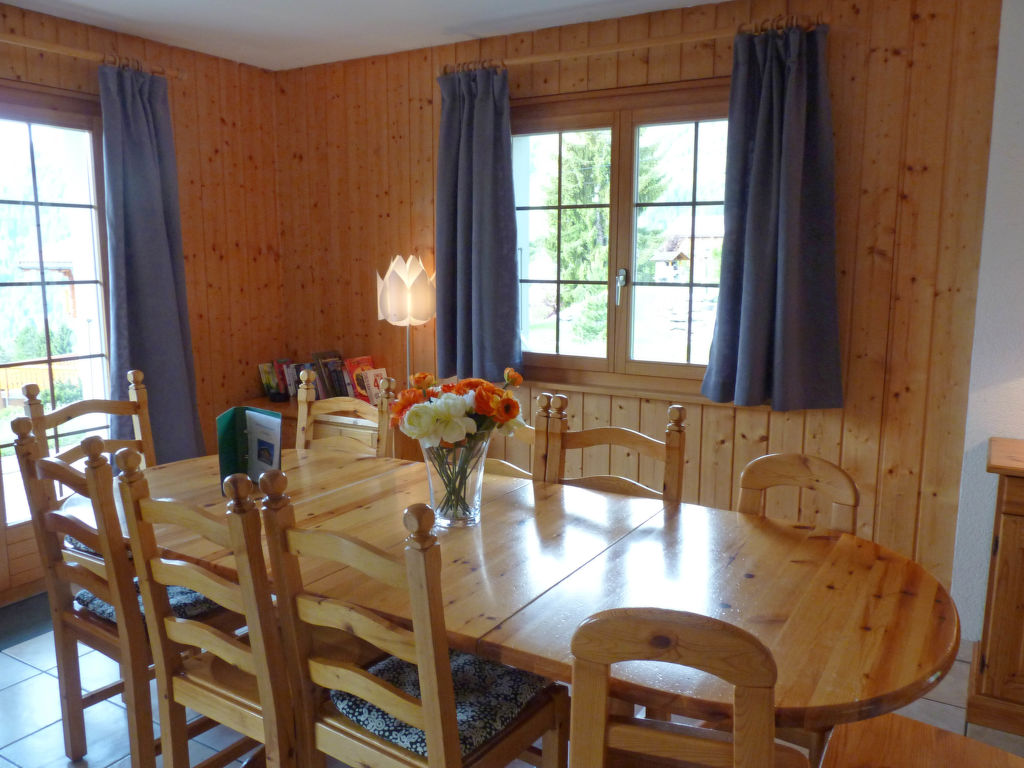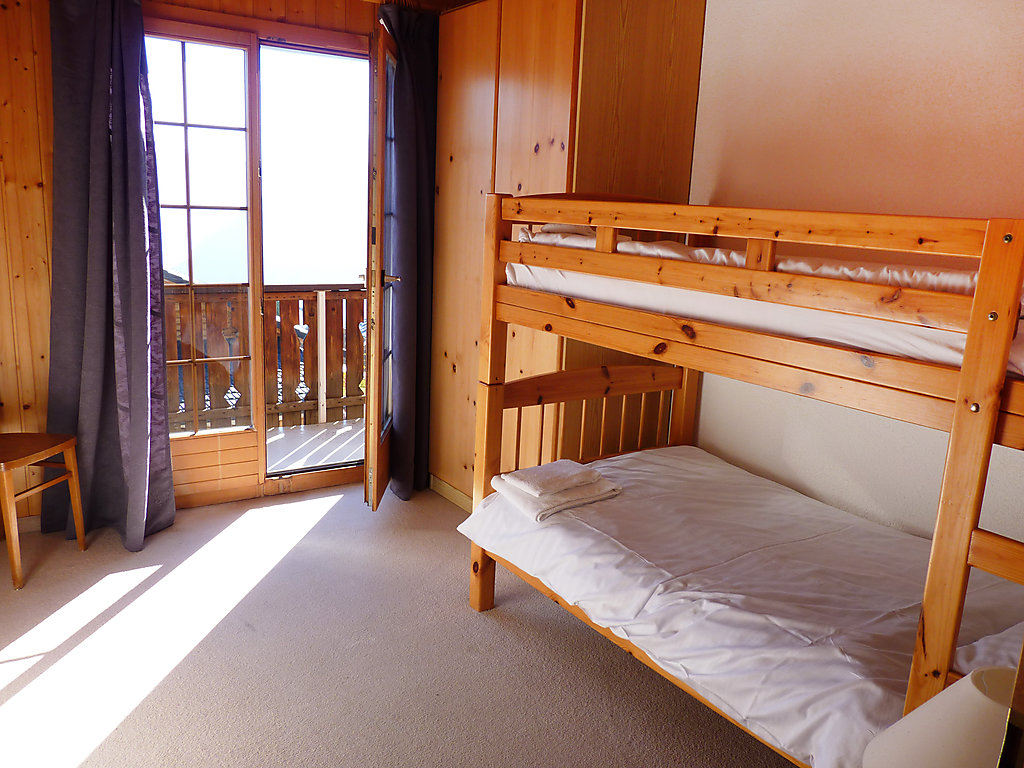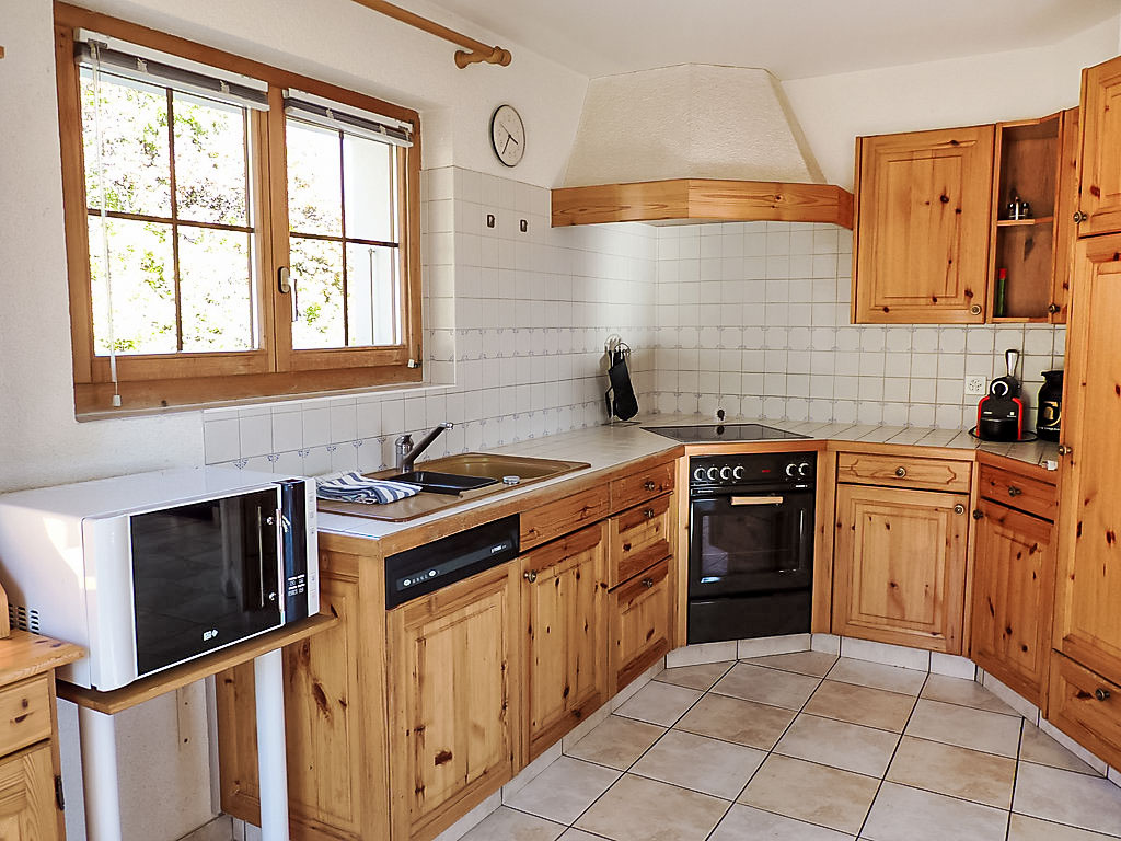 "Arche", 5-Zimmer-Chalet 180 m2 auf 2 Stockwerken. Komfortabel und geschmackvoll eingerichtet: Eingang mit sep. WC. Grosses Wohn-/Esszimmer mit Kabel-TV, CD, Stereoanlage und DVD. Ausgang zur Terrasse. Kochnische (4 Kochplatten, Backofen, Geschirrspüler, Mikrowelle, elektrische Kaffeemaschine, Kapseln für die Kaffeemaschine (Nespresso) extra). Ausgang zur Terrasse. Obergeschoss: 1 Zimmer mit 1 franz. Bett (160 cm). Ausgang zum Balkon. 1 Zimmer mit 2 Betten (90 cm). Ausgang zum Balkon. 1 Kinderzimmer mit 1 x 2 Etagenbetten (90 cm). Ausgang zum Balkon. 1 Zimmer mit 2 Betten (90 cm). Bad/WC, Dusche/WC. Dachgeschoss: Galerie mit 2 Betten (90 cm). Terrassenmöbel, Gartengrill (mobil), Liegestühle (6), Abstellkammer. Sehr schöne Sicht auf die Berge. Zur Verfügung: Waschmaschine, Bügeleisen, Babybett bis 3 Jahre, Haartrockner. Internet (Wireless LAN, gratis). Bitte beachten: Nichtraucher-Unterkunft. Kaffeekapseln können im Interhome-Büro gekauft werden.