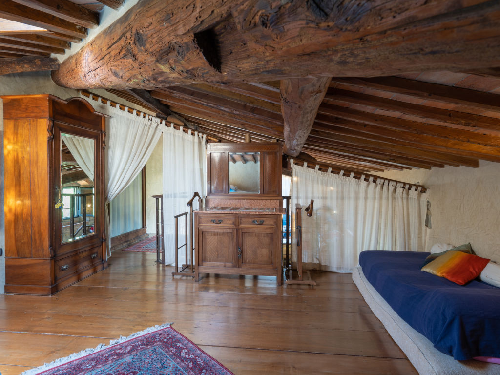 4-Zimmer-Doppelhaushälfte 130 m2 auf 3 Stockwerken. Rustikal eingerichtet: Wohn-/Esszimmer mit Esstisch, Sat-TV, Stereoanlage und DVD. Obergeschoss: Wohnzimmer mit Sat-TV. Offener Zwischenstock mit 1 franz. Bett (160 cm), Sat-TV. Offene Küche (Backofen, Geschirrspüler, 4 Flammen, Toaster, Mikrowelle, Tiefkühler, elektrische Kaffeemaschine) mit Esstisch. 2 Duschen/WC. 2. Obergeschoss: 1 abgeschrägtes, offenes Zimmer mit 2 Betten (80 cm), 1 franz. Bett (160 cm), Sat-TV. G-Heizung. Holzböden, Natursteinböden. Gartensitzplatz, Rasen 5'000 m2, Laube. Gartengrill. Zur Verfügung: Waschmaschine, Kinderhochstuhl, Babybett. Internet (Wireless LAN, gratis). Bitte beachten: Nichtraucher-Haus. 1 Haustier/Hund erlaubt.