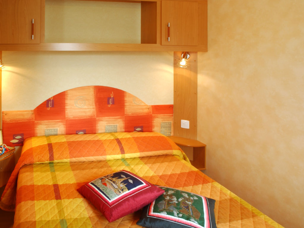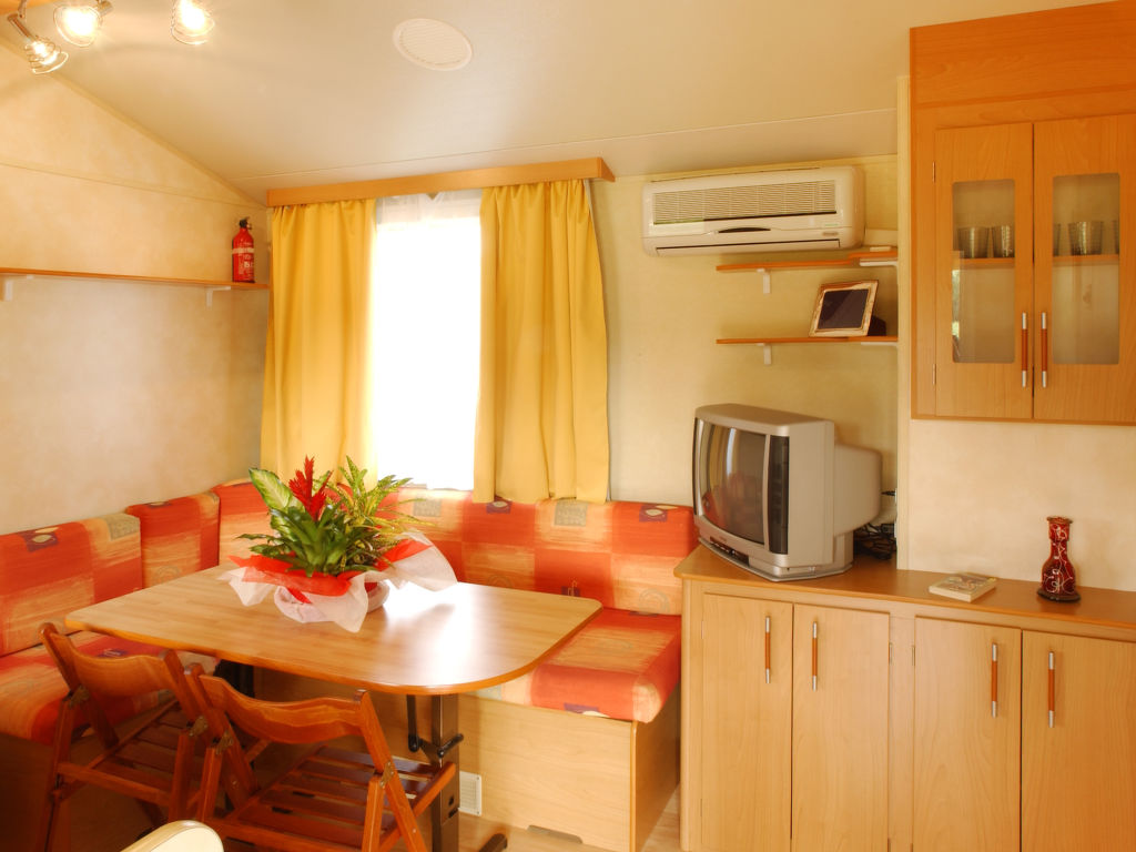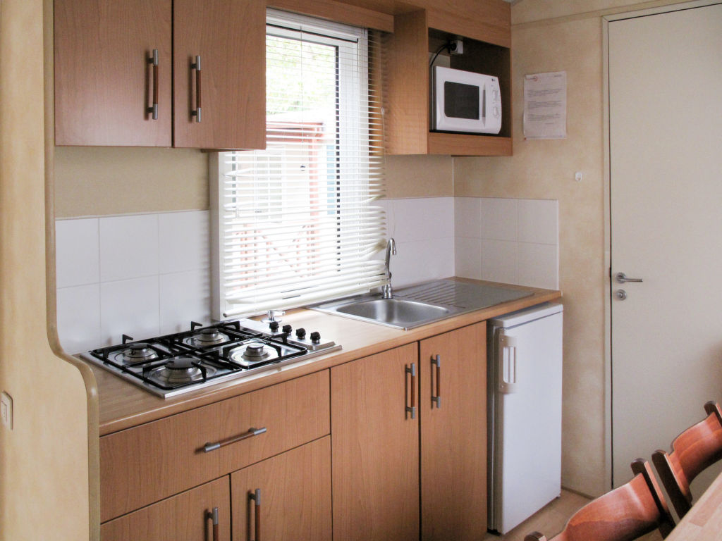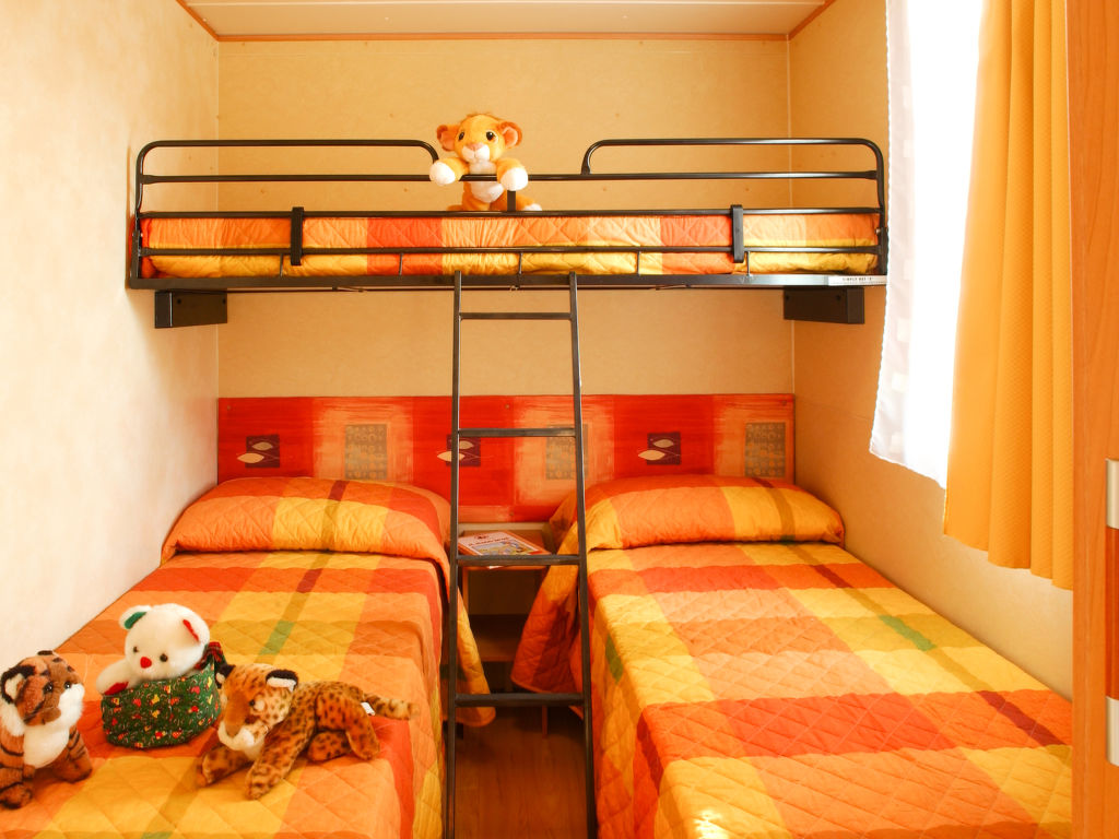 3-Zimmer-Mobilhome‚ ca. 24 m². Über 3 Stufen und Terrasse Zugang zu: Wohnraum mit Essplatz und Küchenzeile (4 Flammen, Mikrowelle, Kühlschrank, Kaffeemaschine). Schlafzimmer mit franz. Bett. Schlafzimmer mit 2 Einzelbetten und teils mit zusätzlich obenliegendem Bett (Bettenbreite jeweils 70 cm) oder Bettcouch (als Zusatzbett für Kind bis 10 Jahre, siehe Nebenkosten) im Wohnraum. Dusche/WC.