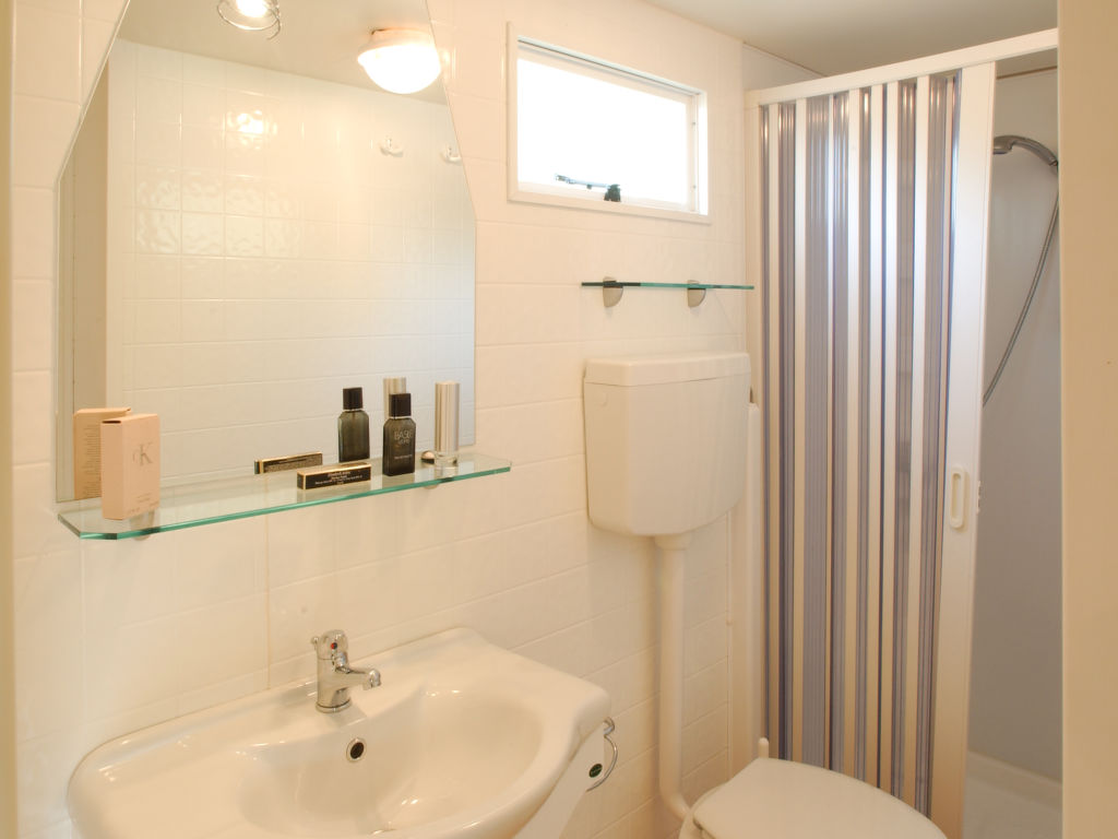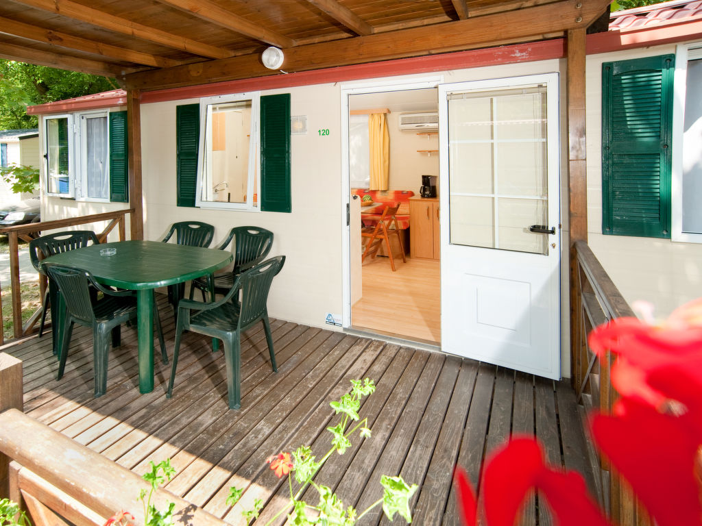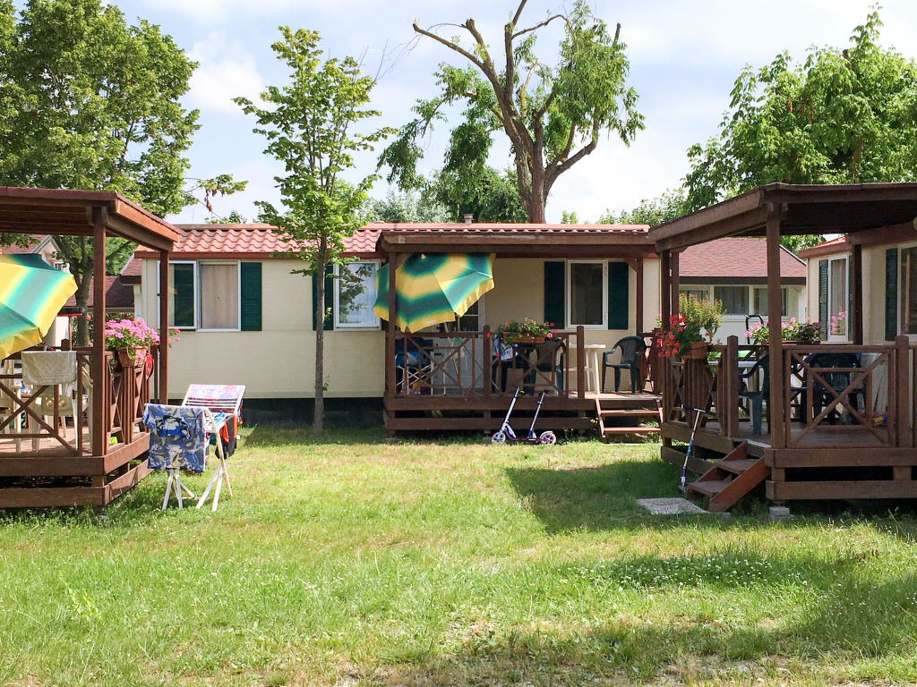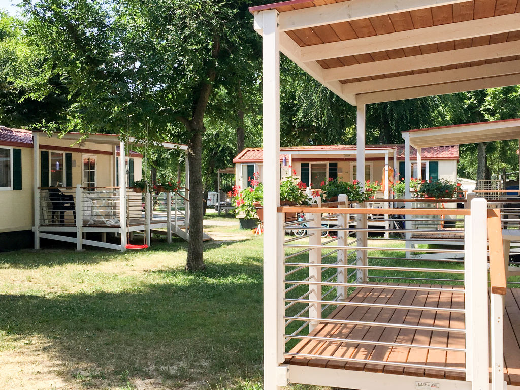 3-Zimmer-Mobilhome‚ ca. 24 m². Über 3 Stufen und Terrasse Zugang zu: Wohnraum mit Essplatz und Küchenzeile (4 Flammen, Mikrowelle, Kühlschrank, Kaffeemaschine). Schlafzimmer mit franz. Bett. Schlafzimmer mit 2 Einzelbetten und teils mit zusätzlich obenliegendem Bett (Bettenbreite jeweils 70 cm) oder Bettcouch (als Zusatzbett für Kind bis 10 Jahre, siehe Nebenkosten) im Wohnraum. Dusche/WC.