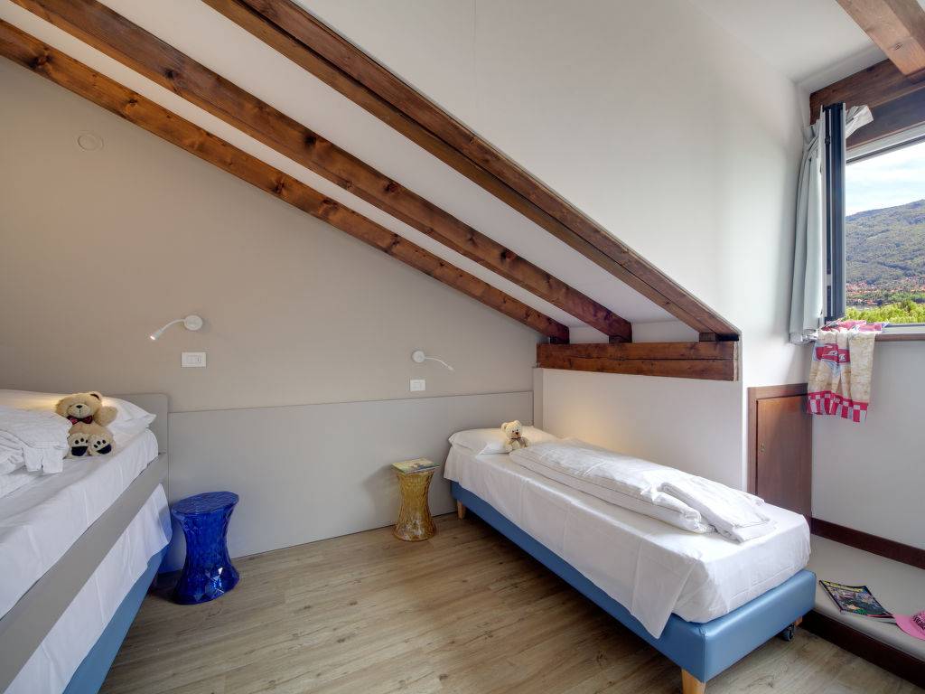 3-Zimmer-Wohnung, 2 Etagen, ca. 70 m². 1. Etage: Wohn-/Schlafraum mit Doppelbettcouch. Küche (4 Induktionsfelder, Mikrowelle, Geschirrspüler, Kühl-/Gefrierkombination, Kaffeemaschine) mit Essplatz und Balkonausgang (Bergseite). Dusche/WC. Von der Küche Treppe ins Dachgeschoss (Dachschräge): Zweibettzimmer (Betten zusammenstellbar). Schlafzimmer mit 2 Einzelbetten (zusammenstellbar) und Hochbett. Dusche/WC. CIR: 103072-CIM-00003