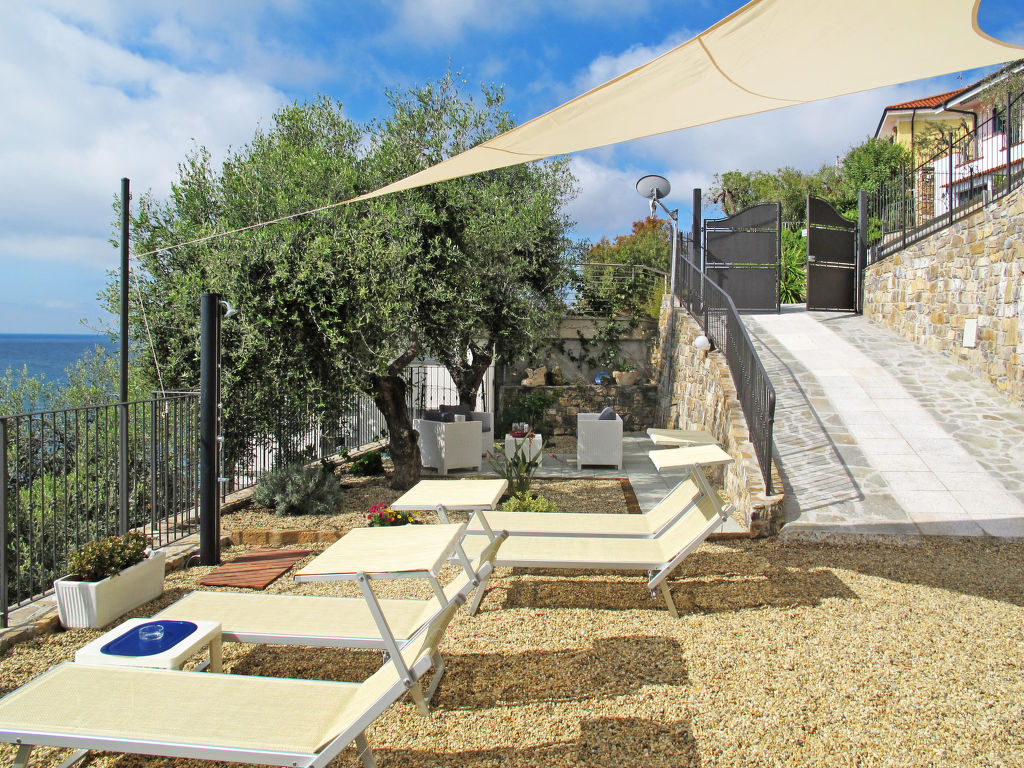 Modernes, alleinstehendes Haus "La Perla del Mediterraneo", Baujahr 2016. 600 m vom Zentrum von Cervo, 9 km vom Zentrum von Imperia, 15 km vom Zentrum von Alassio, am Hang, in einem Wohnquartier, 150 m vom Meer. Zur Alleinbenutzung: schöner, gepflegter Garten 300 m2 (eingezäunt) mit Pflanzen und Bäumen. Aussendusche, Parkplatz beim Haus. Einkaufsgeschäft 1 km, Supermarkt 1.5 km, Restaurant 250 m, Sandstrand "Andora" 6 km, Felsstrand 150 m. Golfplatz (18 Loch) 22 km. Bitte beachten: Hauptstrasse 100 m vom Haus.