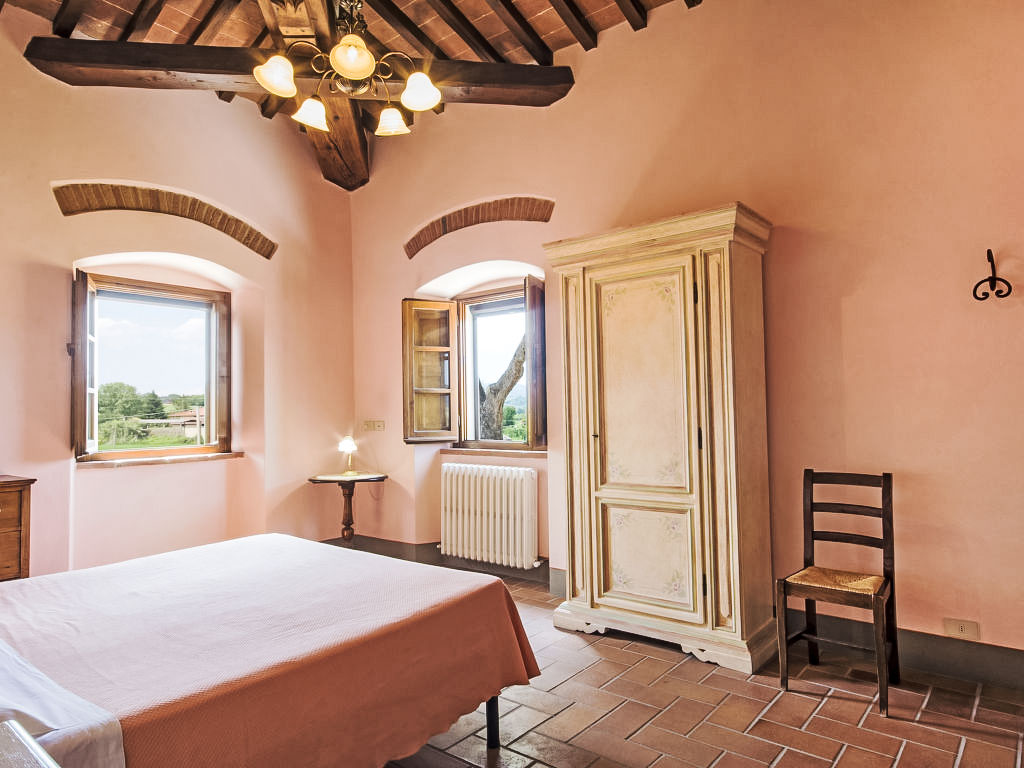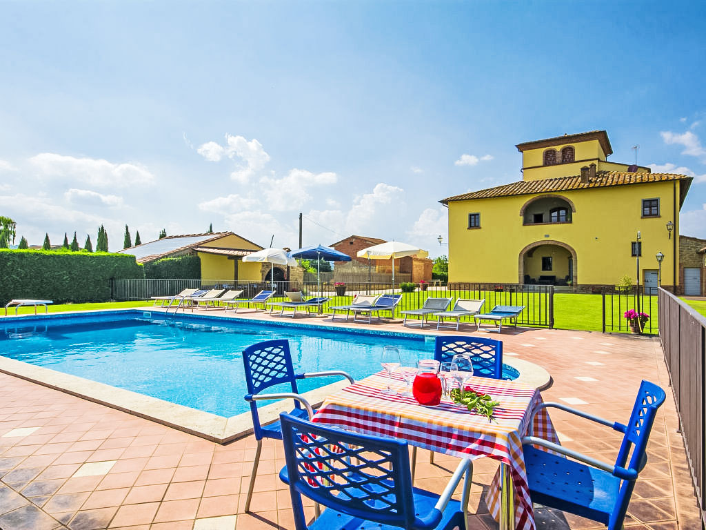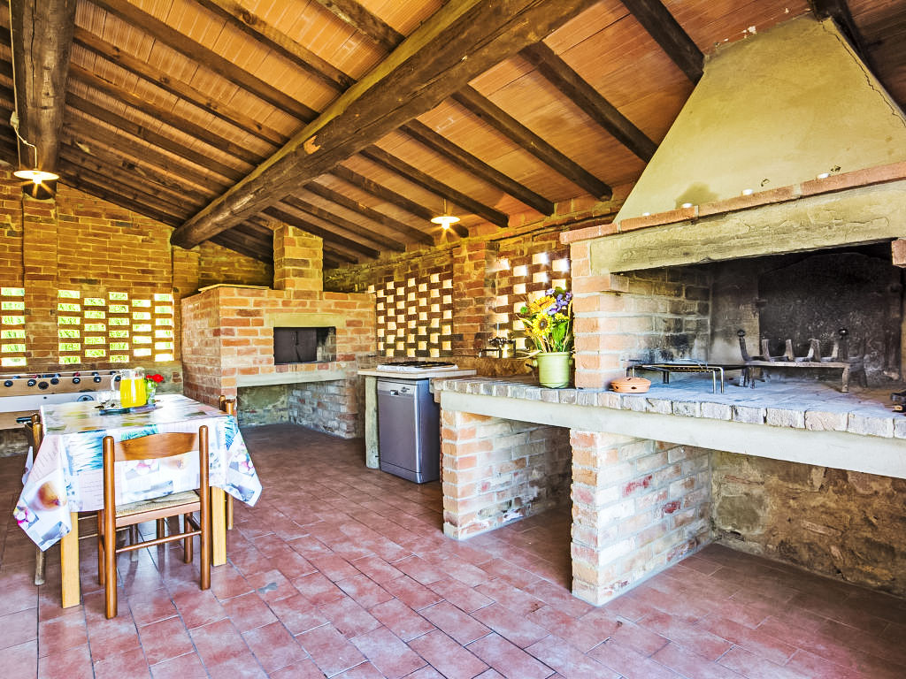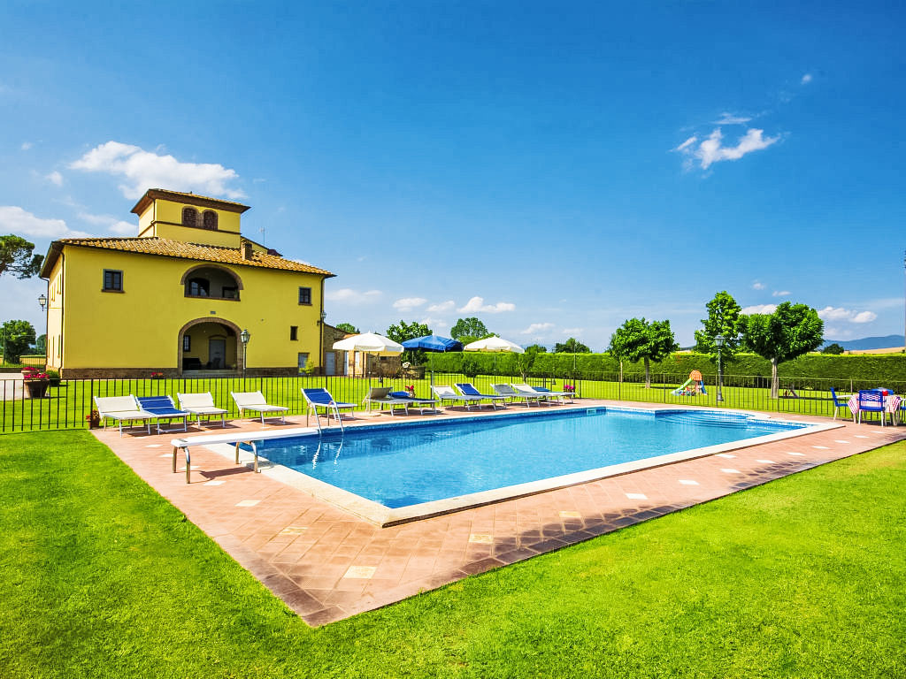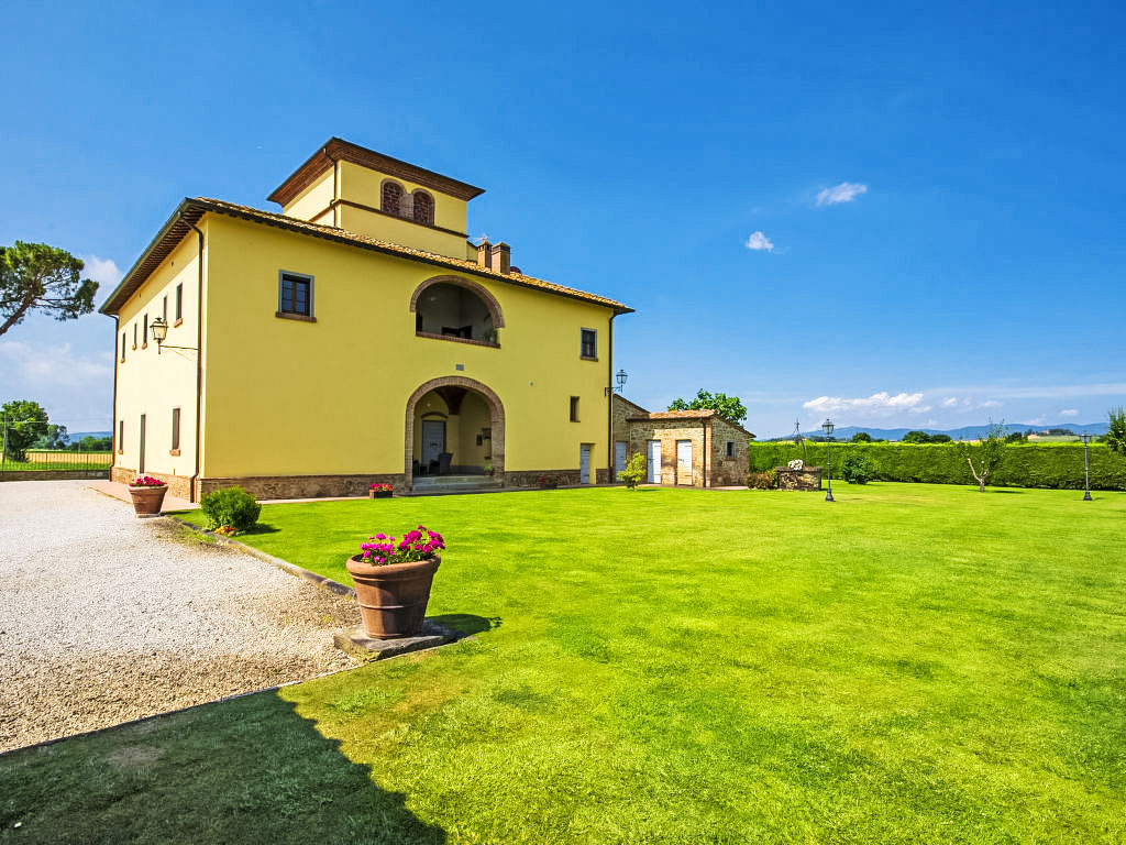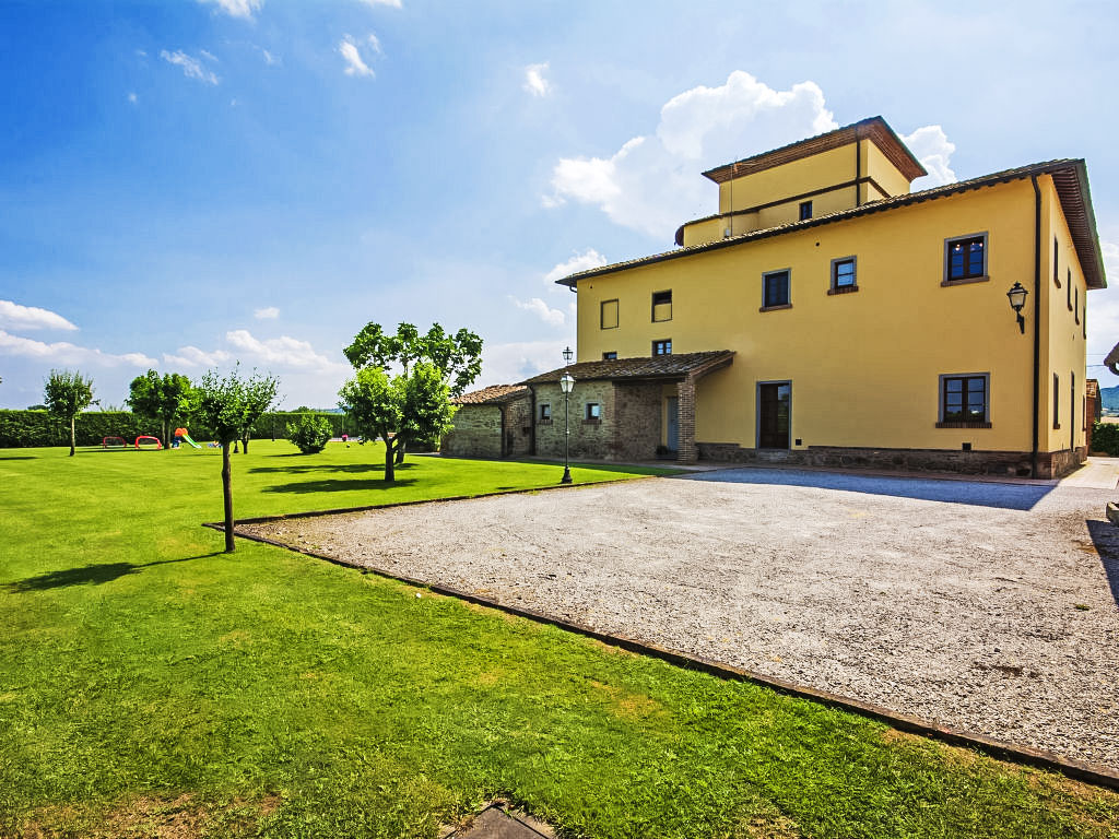 Landhaus im leopoldinischen Stil mit Taubenschlag, kürzlich restauriert. Grosse ausgestattete Aussenbereiche mit Holzofen und Gartenpavillon, einer Laube mit Grill und Pizzaofen sowie einem Arbeitsraum für Frühstück und Abendessen neben dem Schwimmbad, welches von Sonnenblumenfeldern umgeben ist. Das Anwesen befindet sich an abgeschiedener Lage, mit E-Gittertor. Reizvoll eingerichtete Räume, welche an den Charme eines Hauses aus vergangenen Zeiten erinnern, wie etwa das grosse Wohnzimmer mit Feuerstelle, der grosse Speisetisch, die Terracotta-Fussböden und die sehr hohen Decken mit Holzsichtbalken zeigen. Die Nähe zur Autobahn (3 km zur Autobahnzahlstelle, 800 m Luftlinie) bietet die ideale Ausgangslage für alle, die die Sehenswürdigkeiten der Toskana besuchen möchten. In der Nebensaison können auch Kurzaufenthalte von mind. 3 Nächten gebucht werden. Sehr grosse, schöne, komfortable Villa, Baujahr 1814, renoviert, umgeben von Wiesen. 3 km vom Zentrum von Monte San Savino, 7 km vom Zentrum von Lucignano, 80 km vom Zentrum von Firenze, sonnige Lage, im Grünen. Zur Alleinbenutzung: Grundstück 6 ha, Garten 2'000 m2 (eingezäunt) mit Rasen, Schwimmbad eingezäunt (6 x 12 m, 120 - 230 cm tief, 09.04.-01.10.) mit Innentreppe. Aussendusche, Tischtennis, Laube, Gartenmöbel, Grill, Kinderspielplatz (Rutschbahn). Im Hause: Tischtennis, Zentralheizung, Waschmaschine, Heizung vor Ort zu zahlen (01.11.-15.04.), Heizung nur verfügbar von 01.11. bis 15.04.. Wohnungsreinigung möglich (extra). Koch möglich (extra). Parkplatz. Supermarkt 3 km, Einkaufszentrum 12 km, Bahnstation "Monte San Savino" 3 km, Thermalbad "Serre di Rapolano" 34 km. Reitstall 12 km. Nahe gelegene Sehenswürdigkeiten: Arezzo 12 km, Montepulciano 33 km, Pienza 39 km, Siena 40 km, Cortona 42 km, Montalcino 46 km. Geeignet für Events.